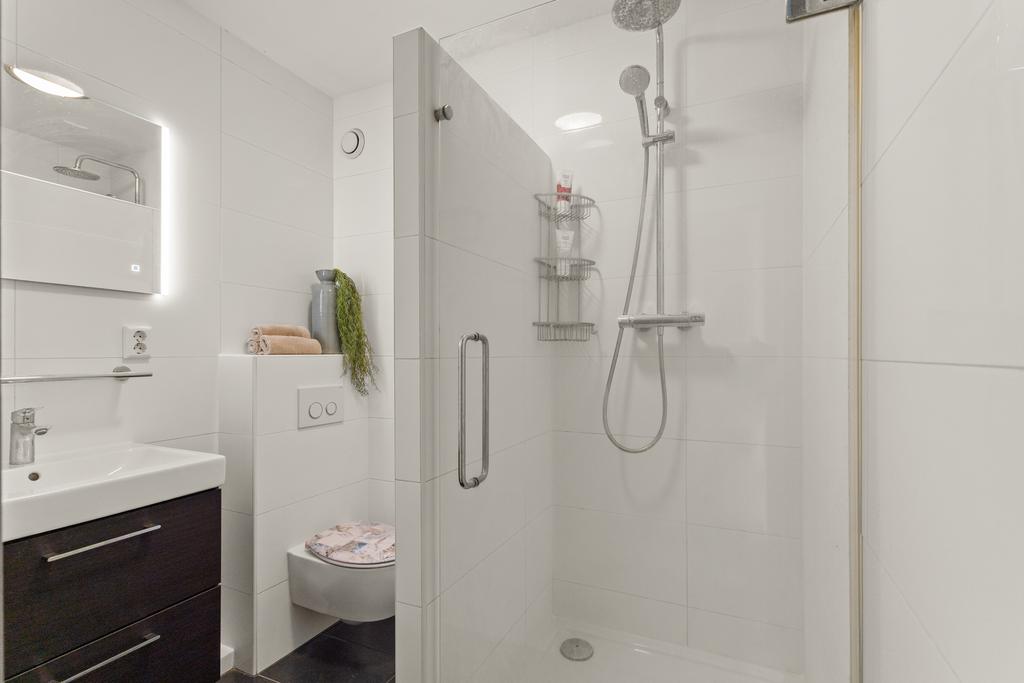De moderne badkamer (circa. 3m²) van dit appartement is voorzien van witte betegeling tot het plafond en een mooie donkergrijze vloertegel, waardoor de badkamer een natuurlijke en rustgevende sfeer heeft. Ook de wastafel met meubel past perfect in het geheel. Het meubel is modern en strak vormgegeven en biedt voldoende opbergruimte voor al je toiletartikelen. Het toilet bevindt zich eveneens in de badkamer.