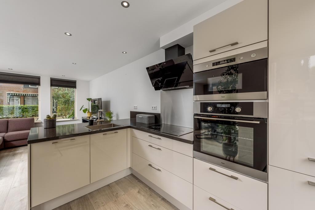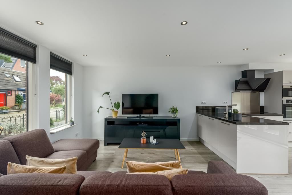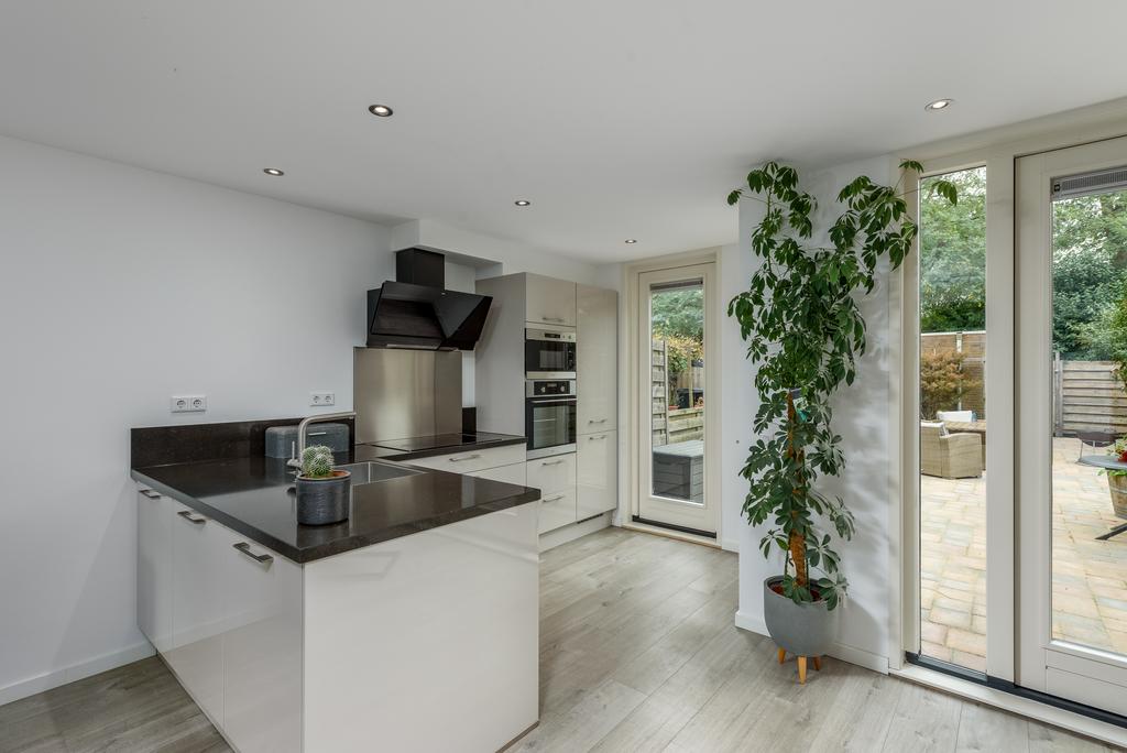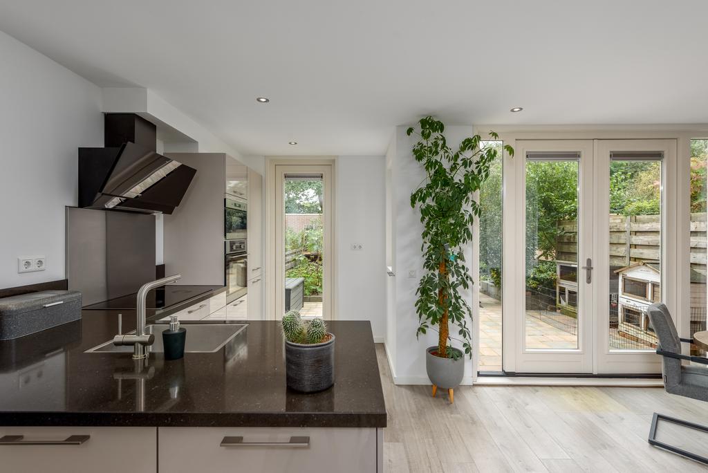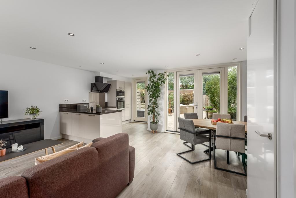 De woonkamer is licht en ruim door het betrekken van de ooit gesloten keuken bij de living. Hier kun je de hele dag door genieten van de zon en het zicht op de riante achtertuin. De keuken lijkt zo uit een woonmagazine te komen en is van alle gemakken voorzien. Zo beschikt deze over een oven, magnetron, inductiekookplaat, vaatwasser en een koel-/vries combinatie. Openslaande deuren bij de eethoek geven toegang tot de heerlijk diepe tuin. De ruimte is voorzien van een strak afgewerkt plafond met inbouwspots en voorzien van een mooie doorgetrokken pvc vloer met vloerverwarming die in iedere inrichting tot zijn recht komt.