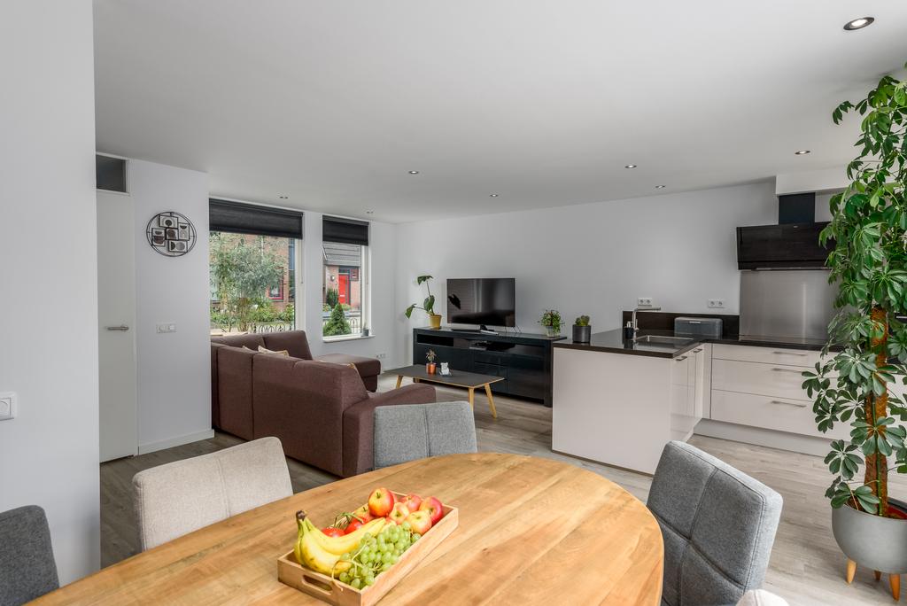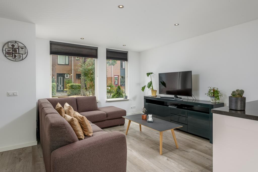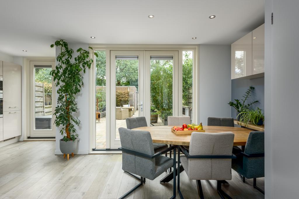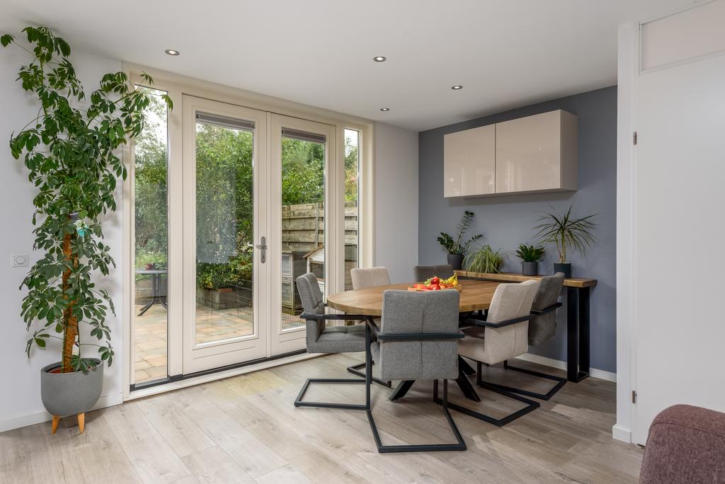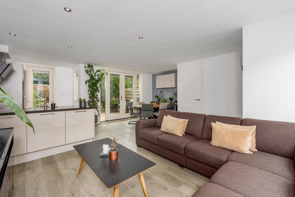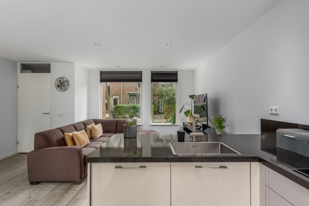 De woonkamer is licht en ruim door het betrekken van de ooit gesloten keuken bij de living. Hier kun je de hele dag door genieten van de zon en het zicht op de riante achtertuin. De keuken lijkt zo uit een woonmagazine te komen en is van alle gemakken voorzien. Zo beschikt deze over een oven, magnetron, inductiekookplaat, vaatwasser en een koel-/vries combinatie. Openslaande deuren bij de eethoek geven toegang tot de heerlijk diepe tuin. De ruimte is voorzien van een strak afgewerkt plafond met inbouwspots en voorzien van een mooie doorgetrokken pvc vloer met vloerverwarming die in iedere inrichting tot zijn recht komt.