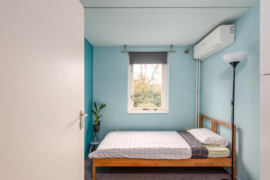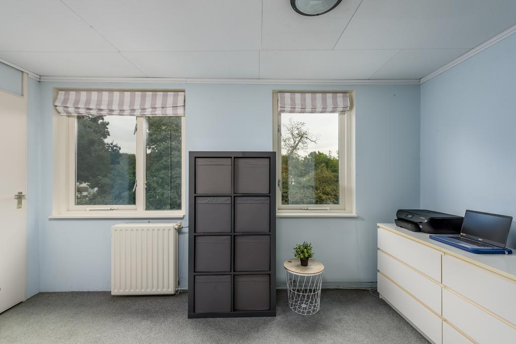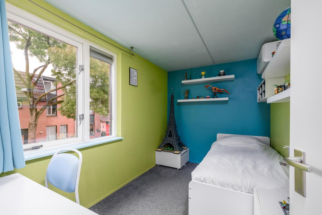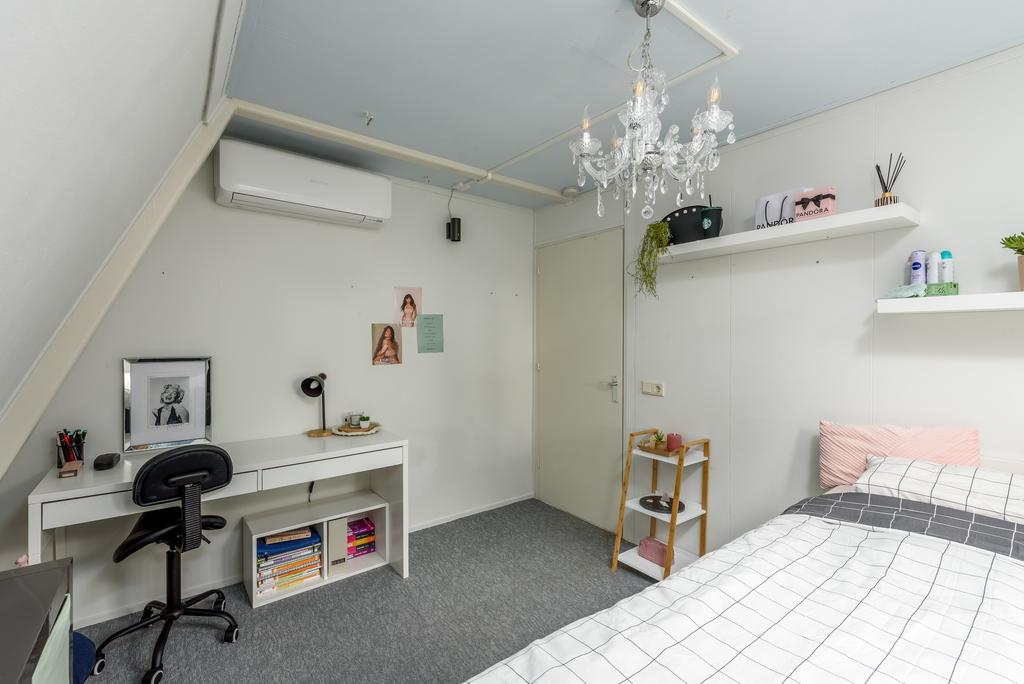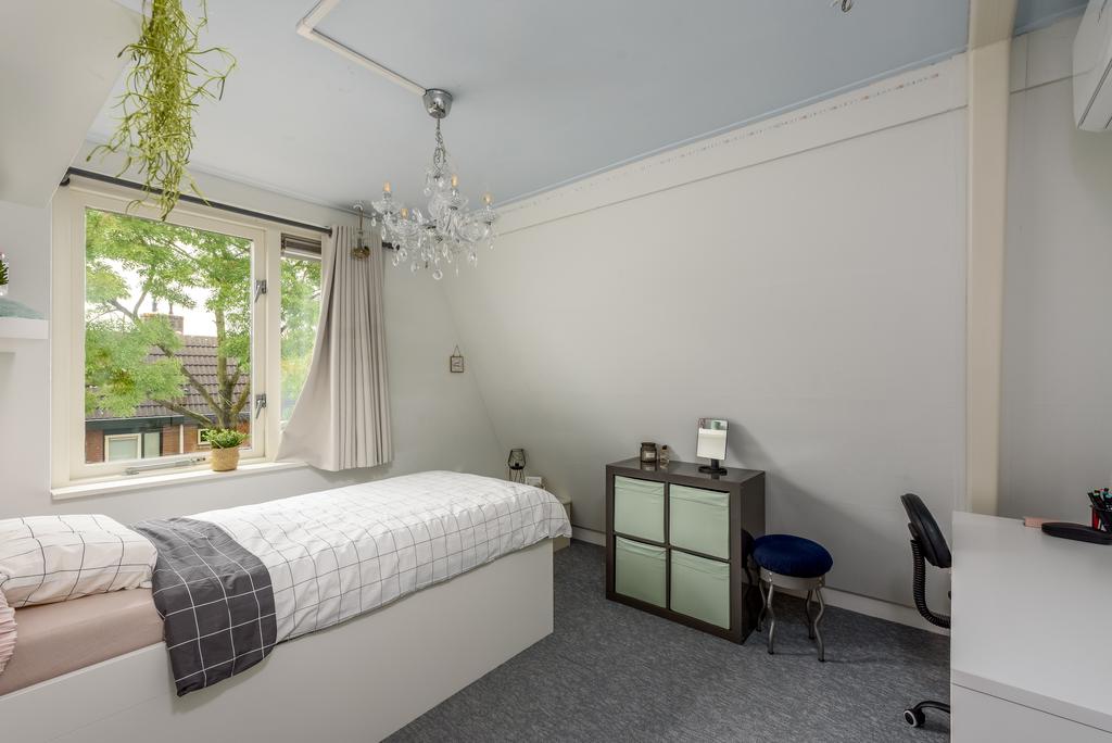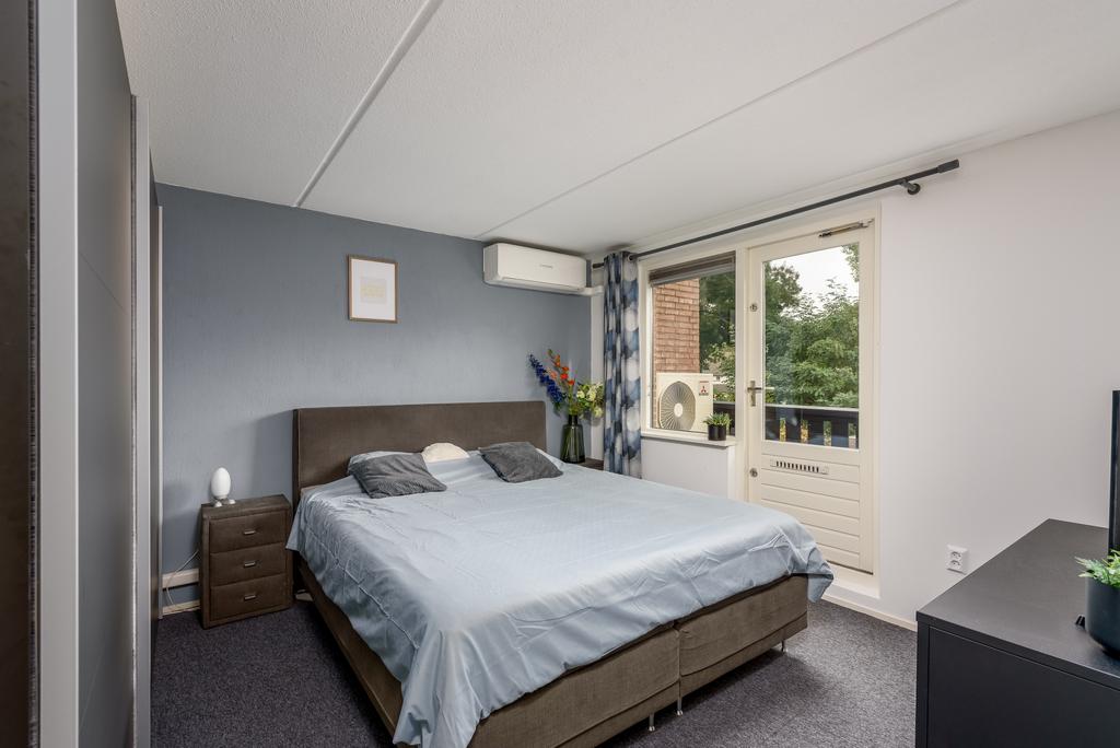 Op de eerste verdieping tref je drie slaapkamers aan, waarvan één met een eigen balkon. De grootste slaapkamer, met ongeveer 13 m² aan ruimte, biedt een prettig uitzicht op het gemeentegroen en zorgt voor een gevoel van vrijheid. De tweede en derde slaapkamer zijn eveneens ruim, met ongeveer 7,9 m² en 6,3 m² aan leefruimte. Bovendien zijn alle kamers voorzien van airconditioning, waardoor rustige nachten gegarandeerd zijn.