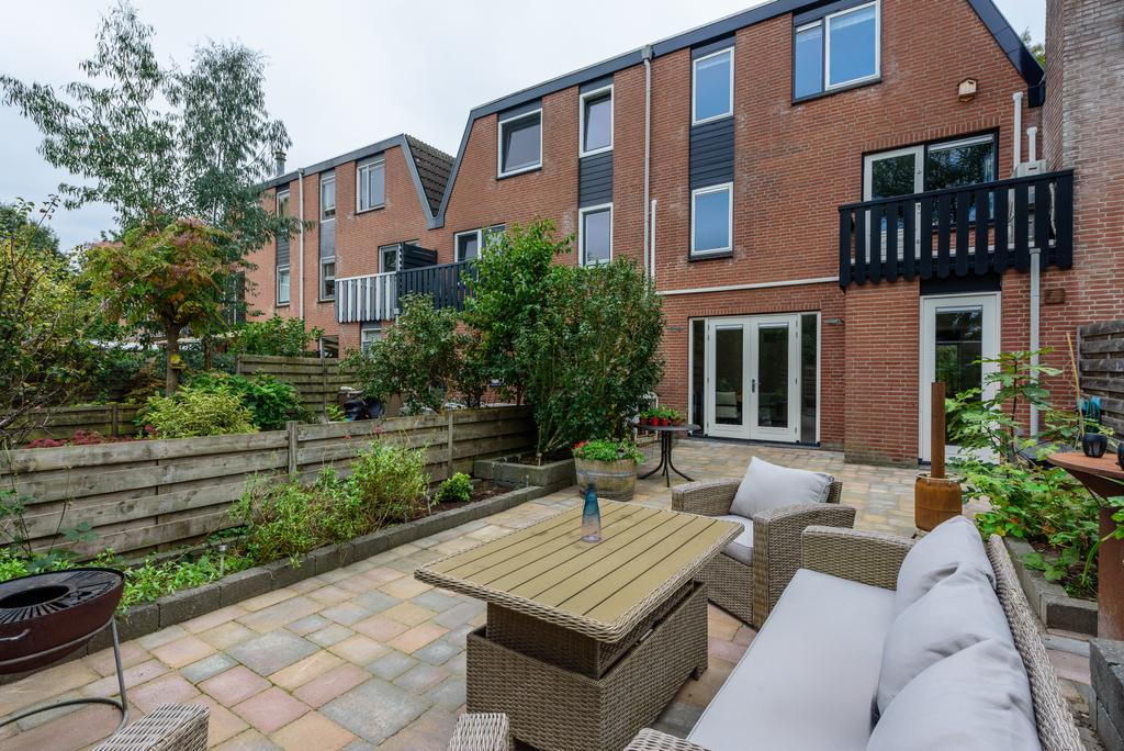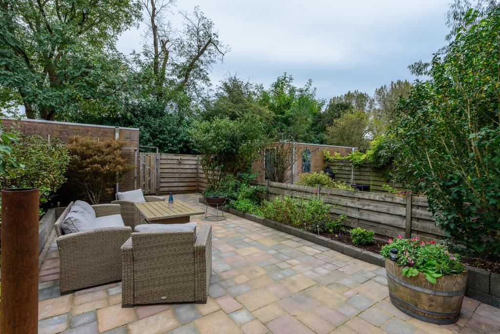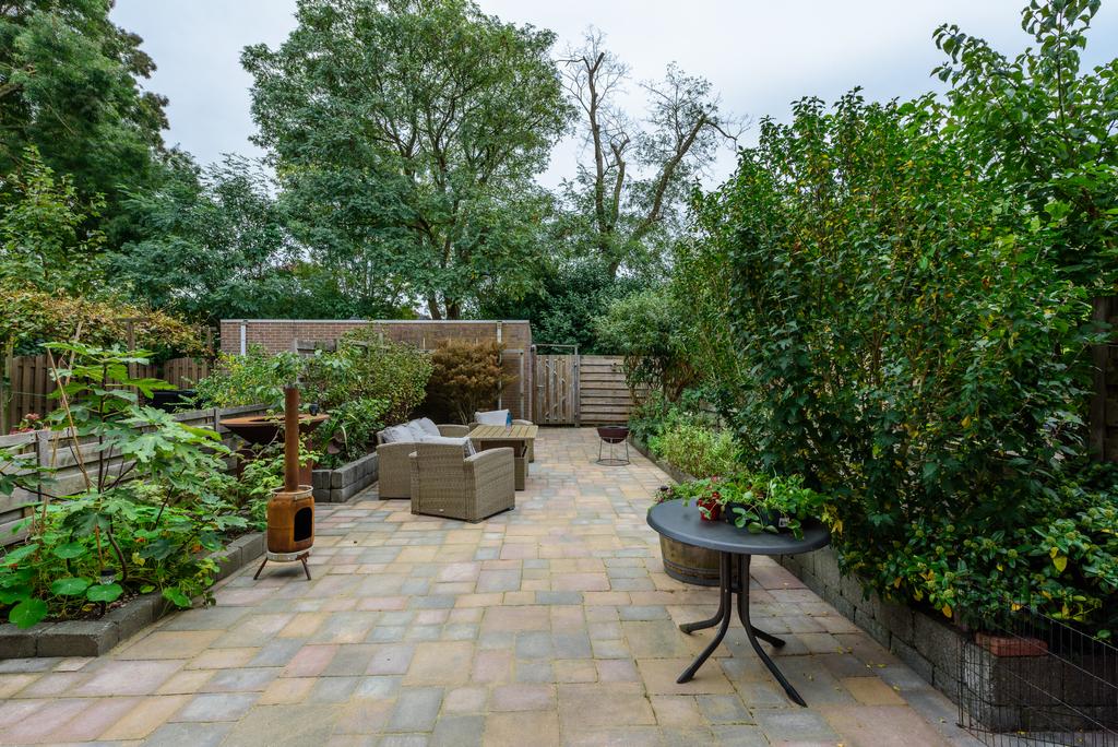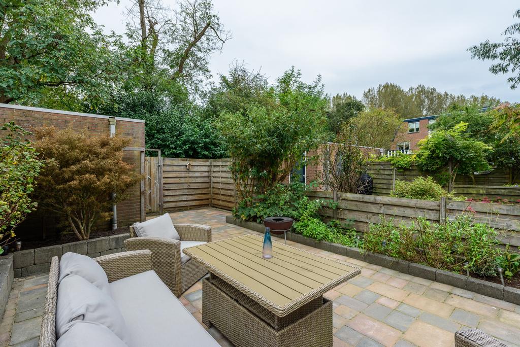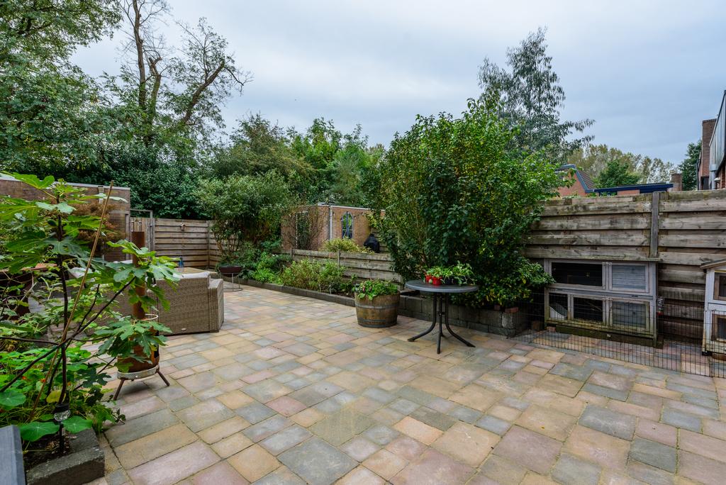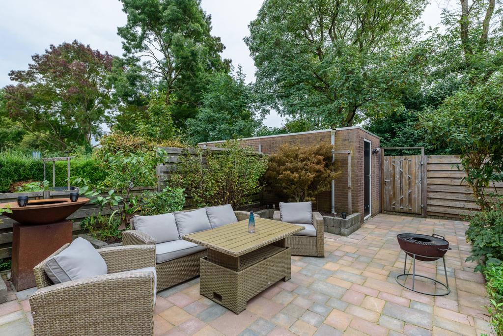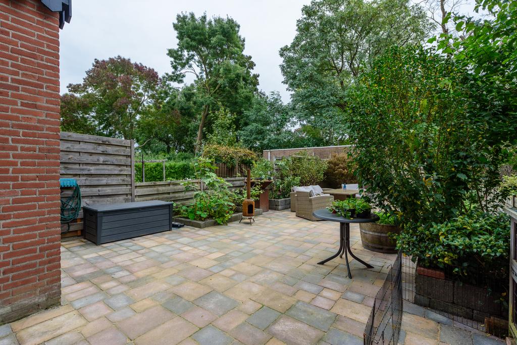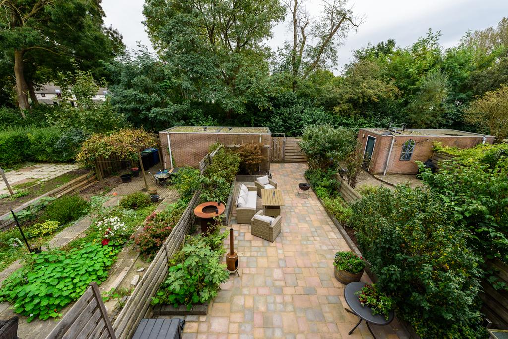 Een heerlijk diepe tuin met uitzicht op het gemeentegroen. Genoeg ruimte, weinig gedoe. Overweeg een uitbouw van de woonkamer en hou nog meer dan genoeg tuin over. Een perfecte plek om te ontspannen en je eigen stijl toe te voegen. De achtertuin is voorzien van een ruime externe bergruimte én een praktische achterom.