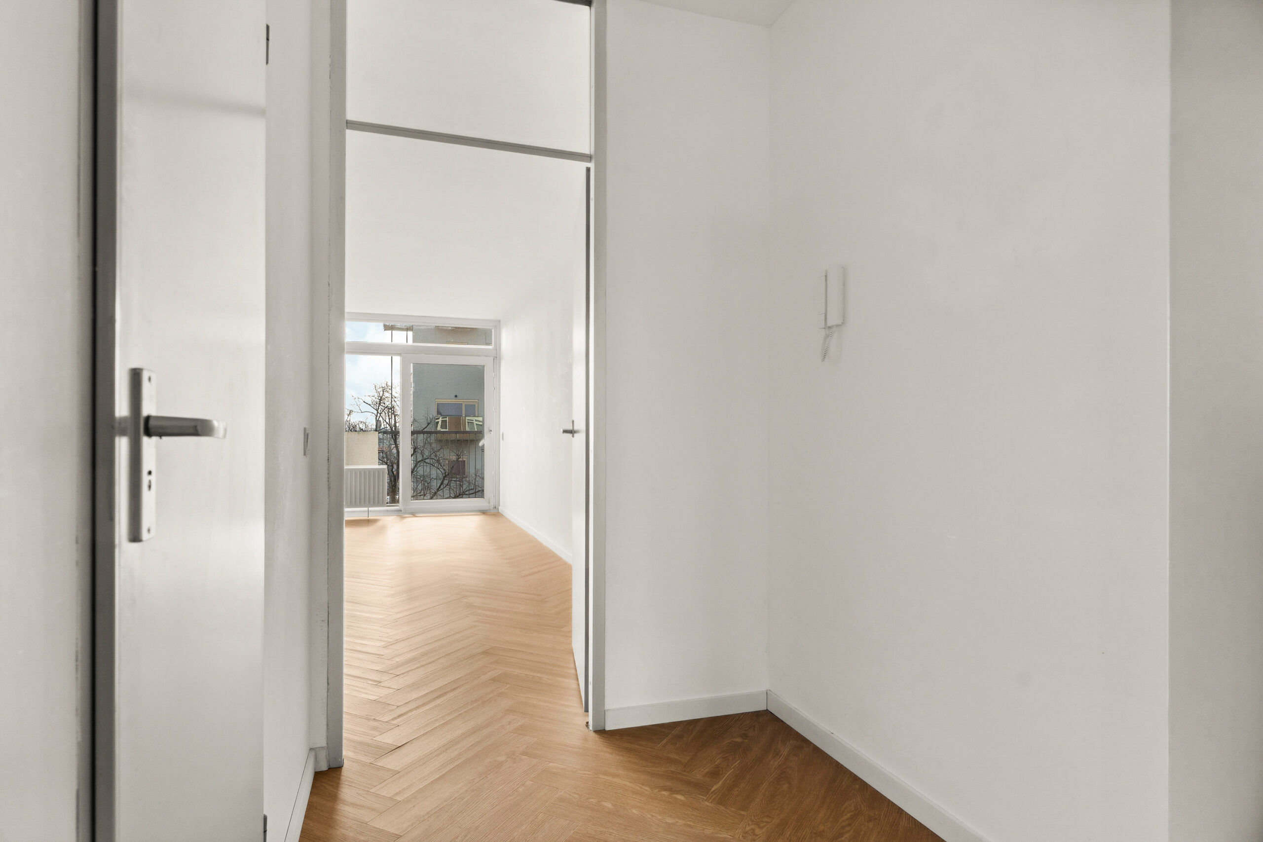 Op de begane grond treft u de gezamenlijke entree, brievenbussen en eigen berging. Vervolgens neemt u de lift of trap naar de 4e verdieping.