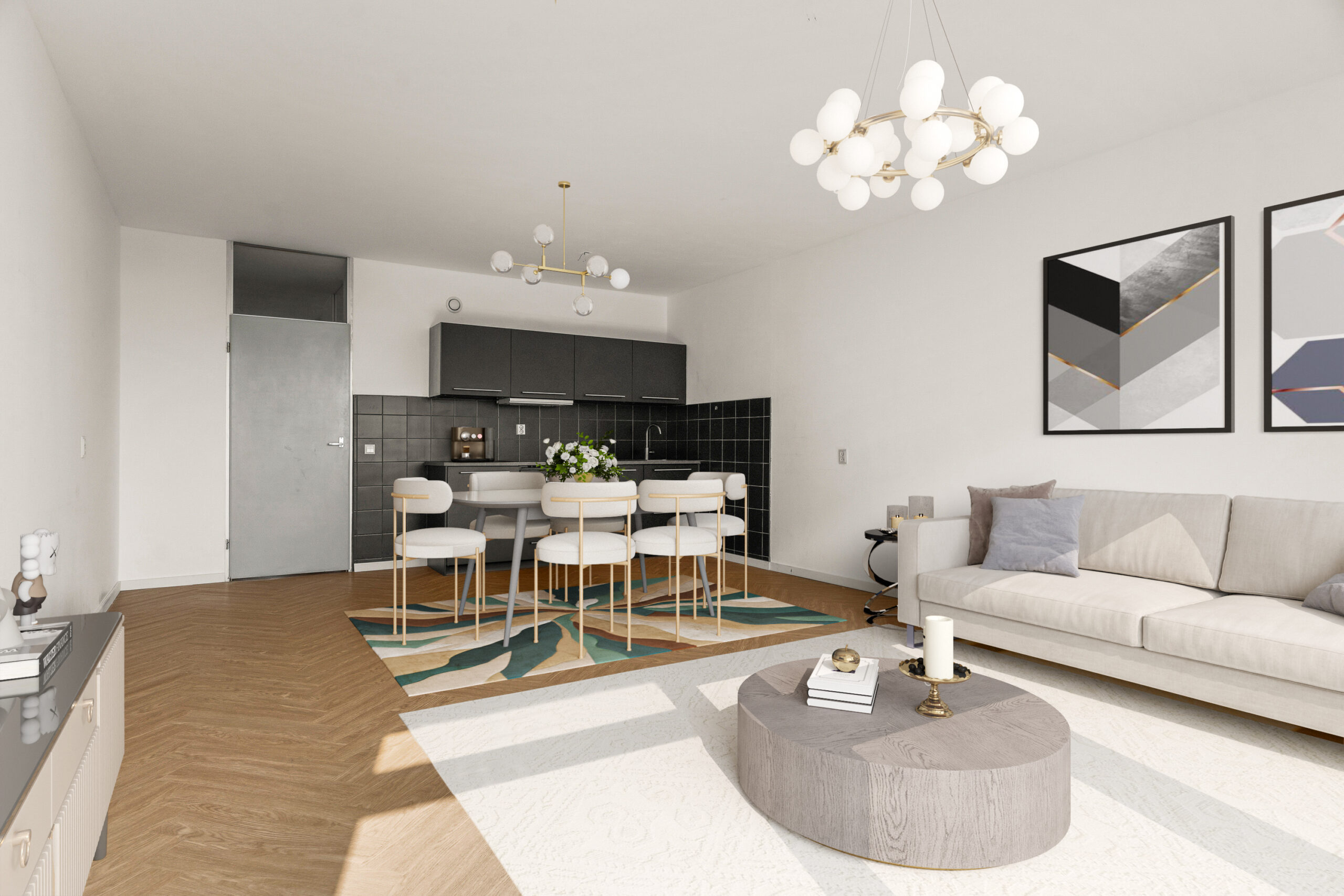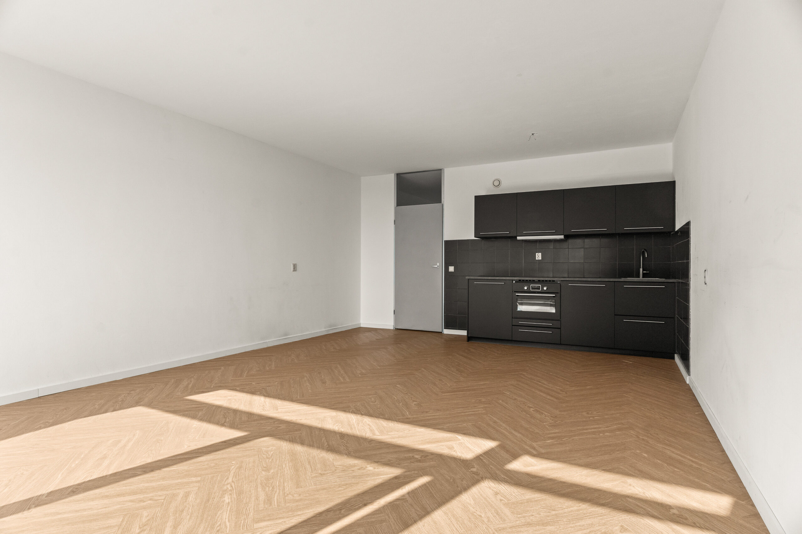 Upon entering you will find a spacious hall, with 4 large handy storage cupboards, which gives access to the toilet with fountain, meter cupboard, bedroom with bathroom and living room, open kitchen and balcony. In the spacious sunny living room you will find the open kitchen with built-in appliances such as induction hob, dishwasher, combi oven and refrigerator. There is a modern herringbone floor on the entire floor.