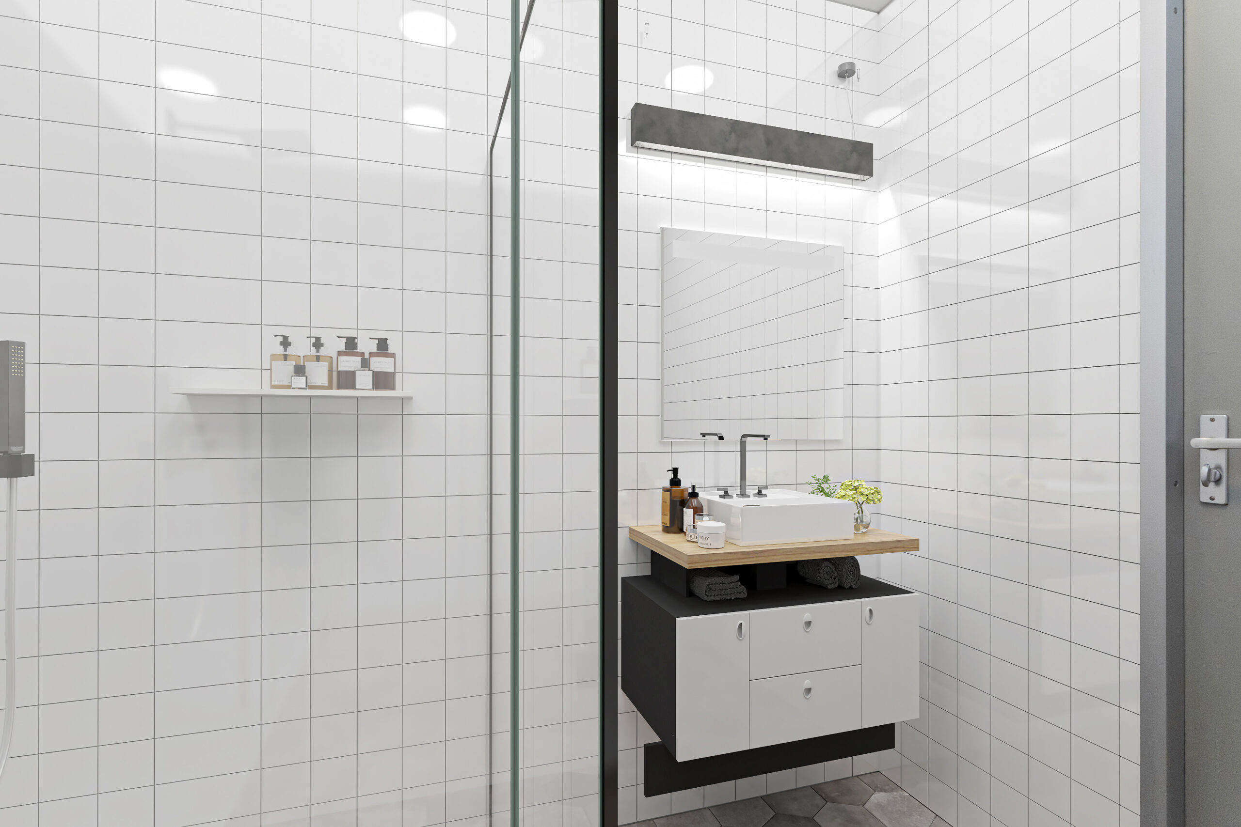 In the bedroom you will find the bathroom. In the bathroom is the shower, sink, connection for washer / dryer and the electric boiler. The electric boiler is owned.