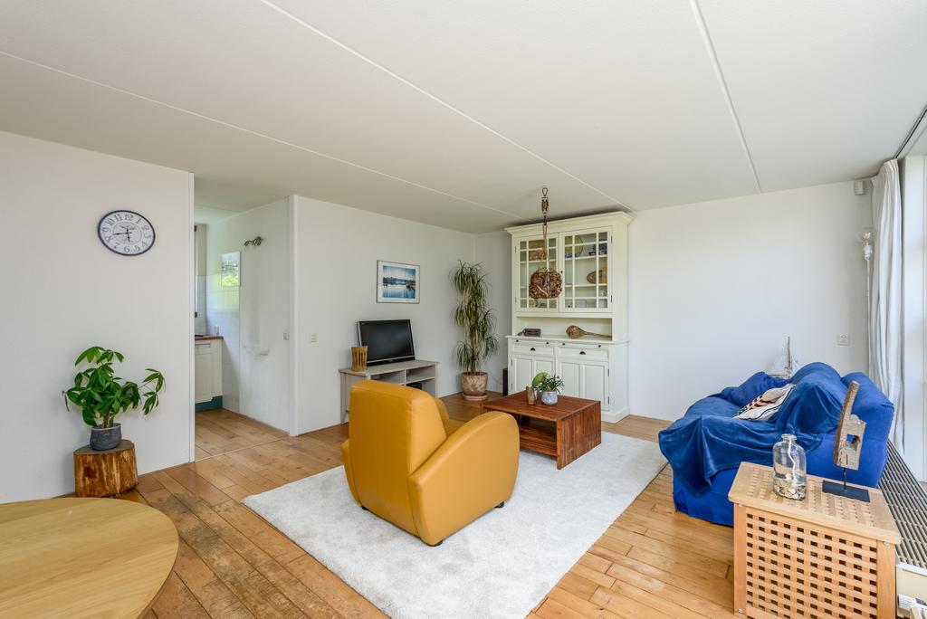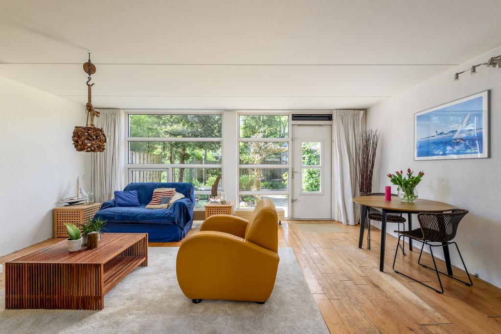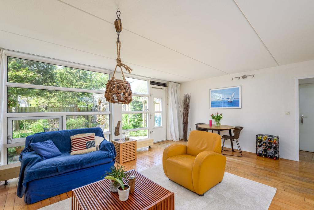 De woonkamer is tuingericht, heeft grote raampartijen en een loopdeur naar de verzorgde zonnige achtertuin.