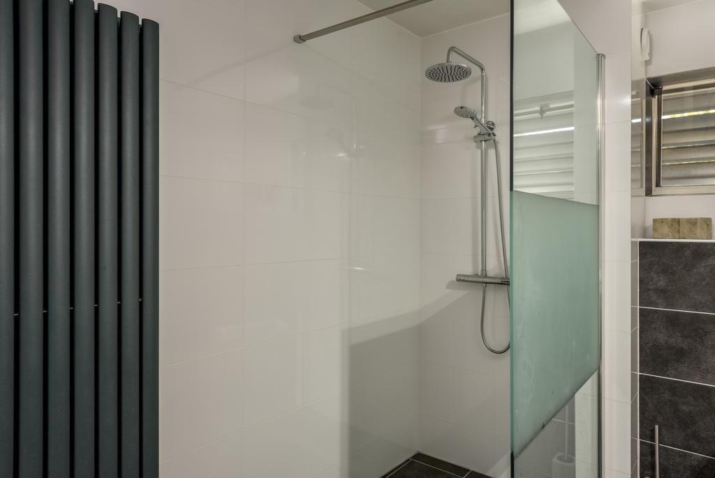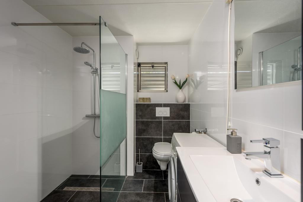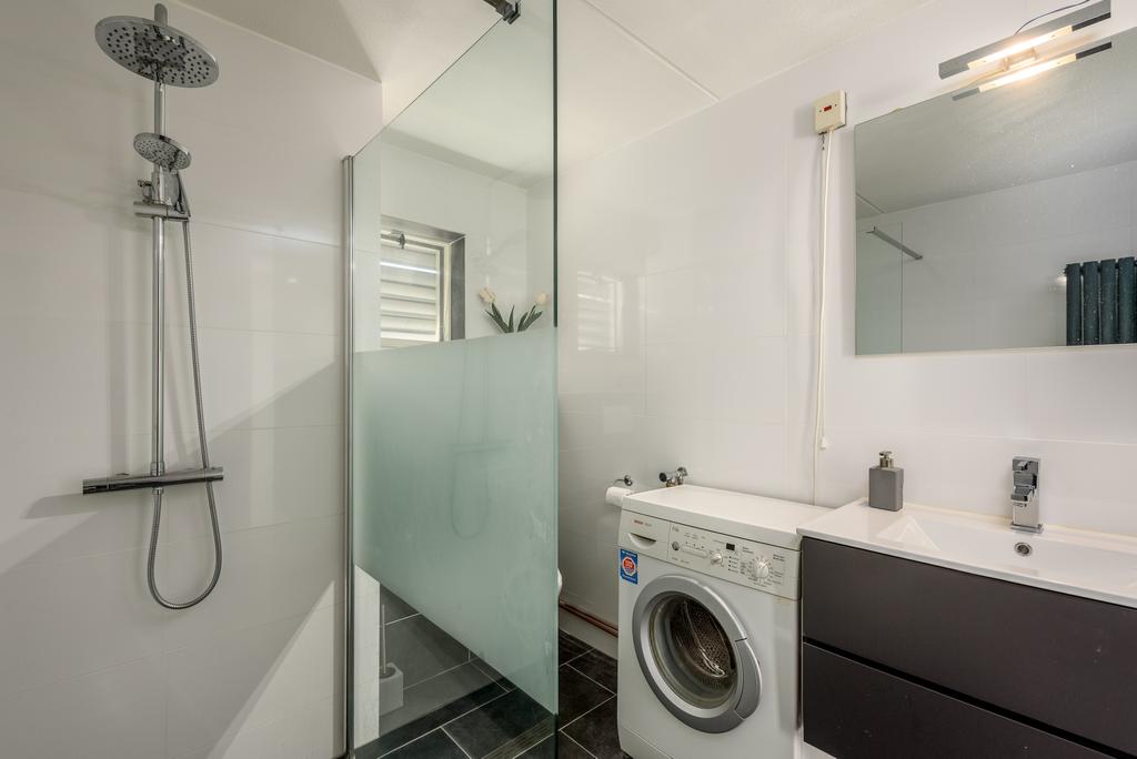 De moderne badkamer is vernieuwd in 2021, is voorzien van een inloopdouche, tweede toilet, wastafel met meubel, een raam en is tot aan het plafond betegeld. In de badkamer is tevens de wasmachine aansluiting aanwezig.