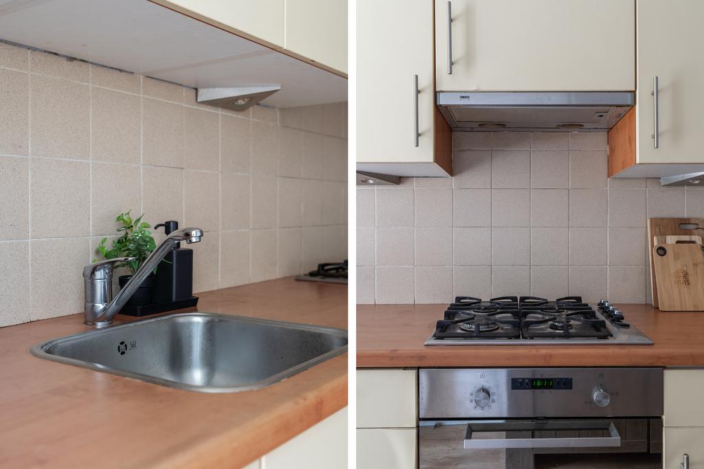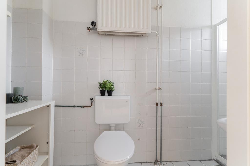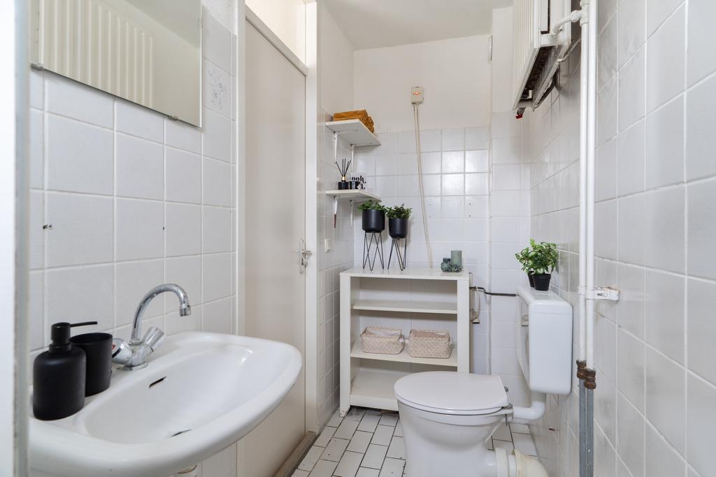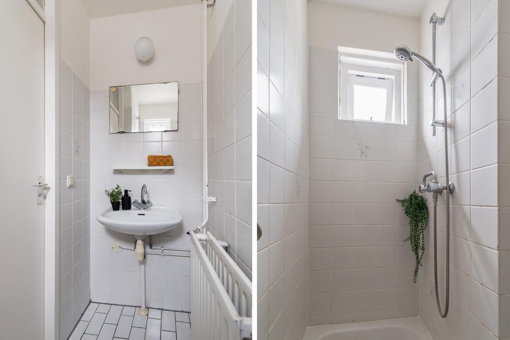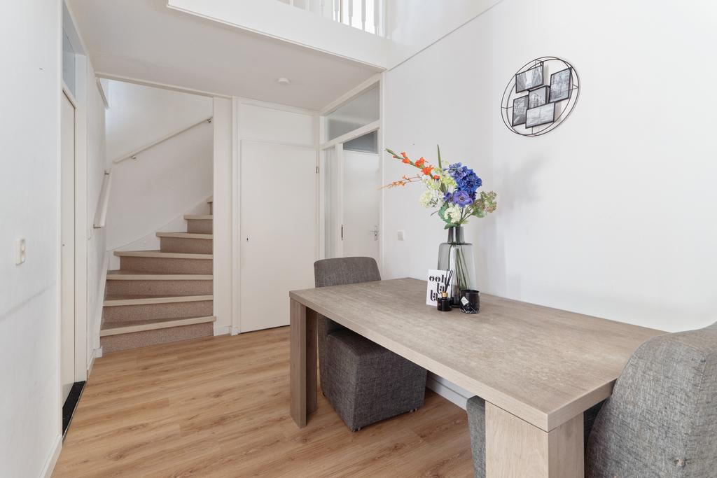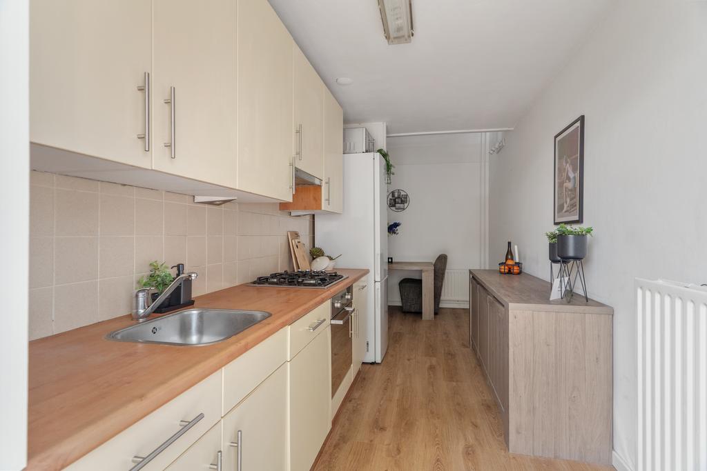 De keuken is uitgerust met inbouwapparatuur zoals een afzuigkap, een 4-pits gasfornuis en een vaatwasser. Deze ruimte biedt de mogelijkheid om een moderne open keuken te realiseren. Het doorbreken van de wand zorgt voor een naadloze overgang, waardoor een bijzonder ruime keuken ontstaat. Ook is het bijvoorbeeld mogelijk om hier een gezellige woonkamer met eethoek te creëren, zoals meerdere buren al hebben gedaan, waardoor deze ruimte het hart van het huis wordt.