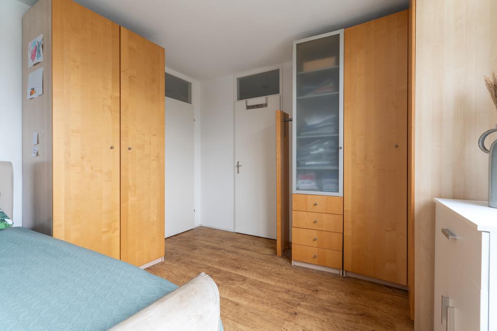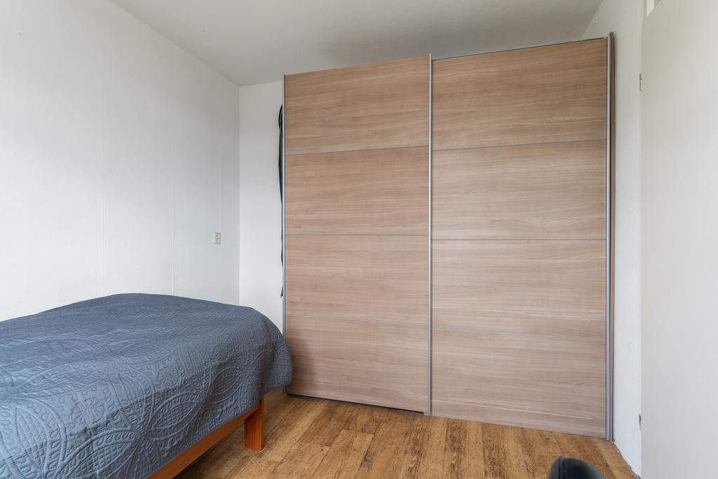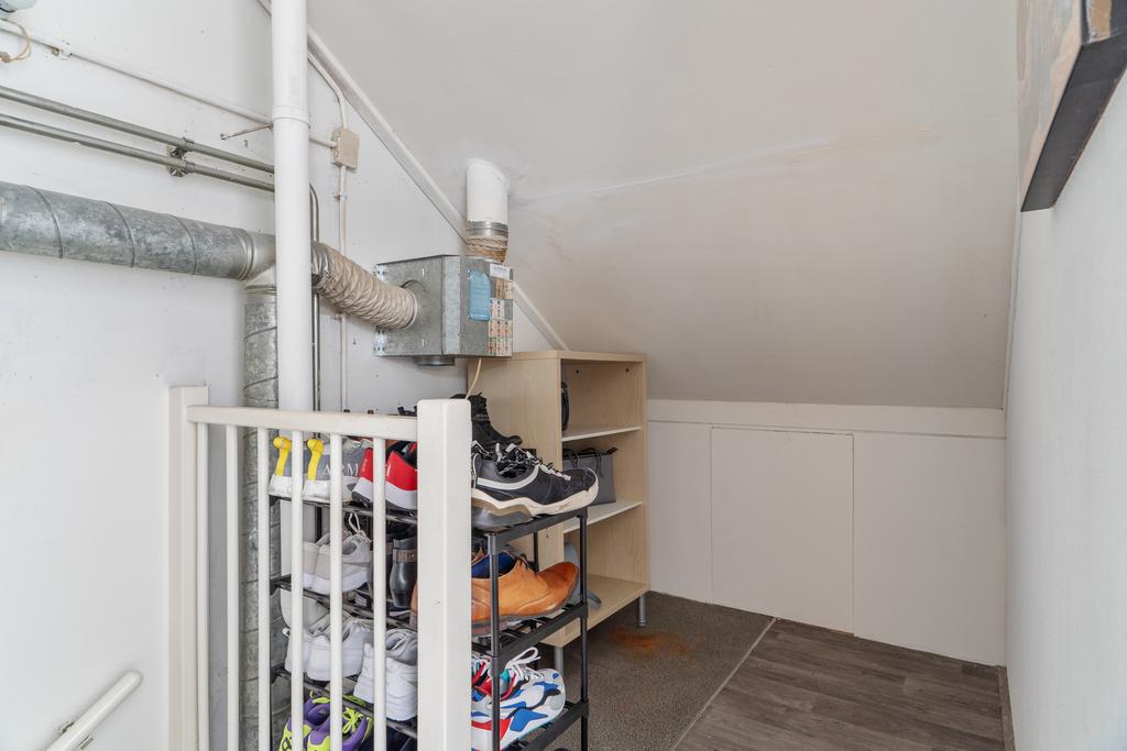 De bovenverdieping is bereikbaar via een vaste trap, waar je de overloop en toegang tot de slaapkamer (circa 21,5m²) vindt. Op de overloop bevindt zich de opstelplaats voor de wasmachine en droger, de mechanische ventilatie en de CV-installatie. Daarnaast bieden knieschotten ruime opbergmogelijkheden.