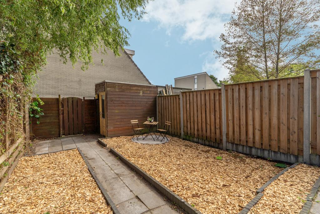De ruime achtertuin, bereikbaar vanuit de keuken en middels een achterom en is voorzien van een vrijstaande houten berging. Met zijn ligging op het zuiden kan deze tuin worden omgetoverd tot een heerlijke plek voor buitenleven.
