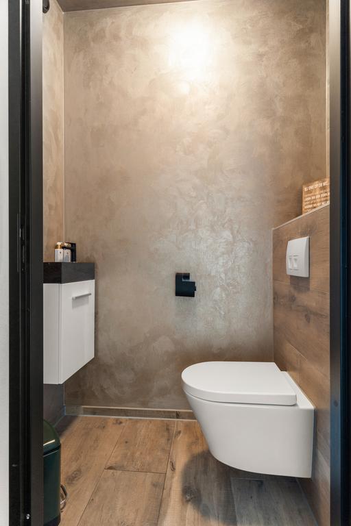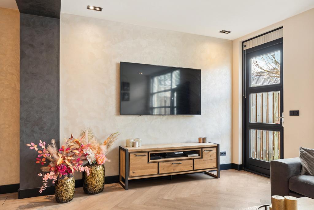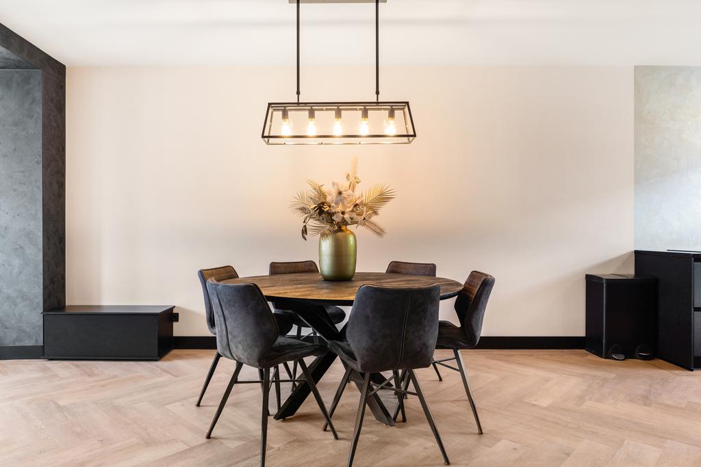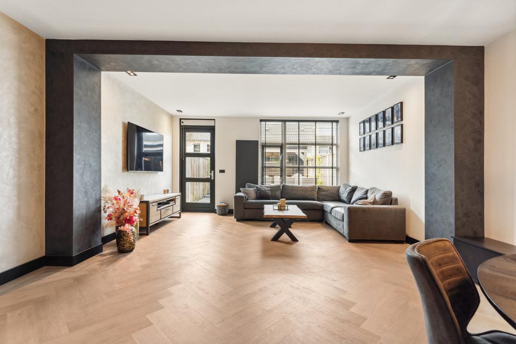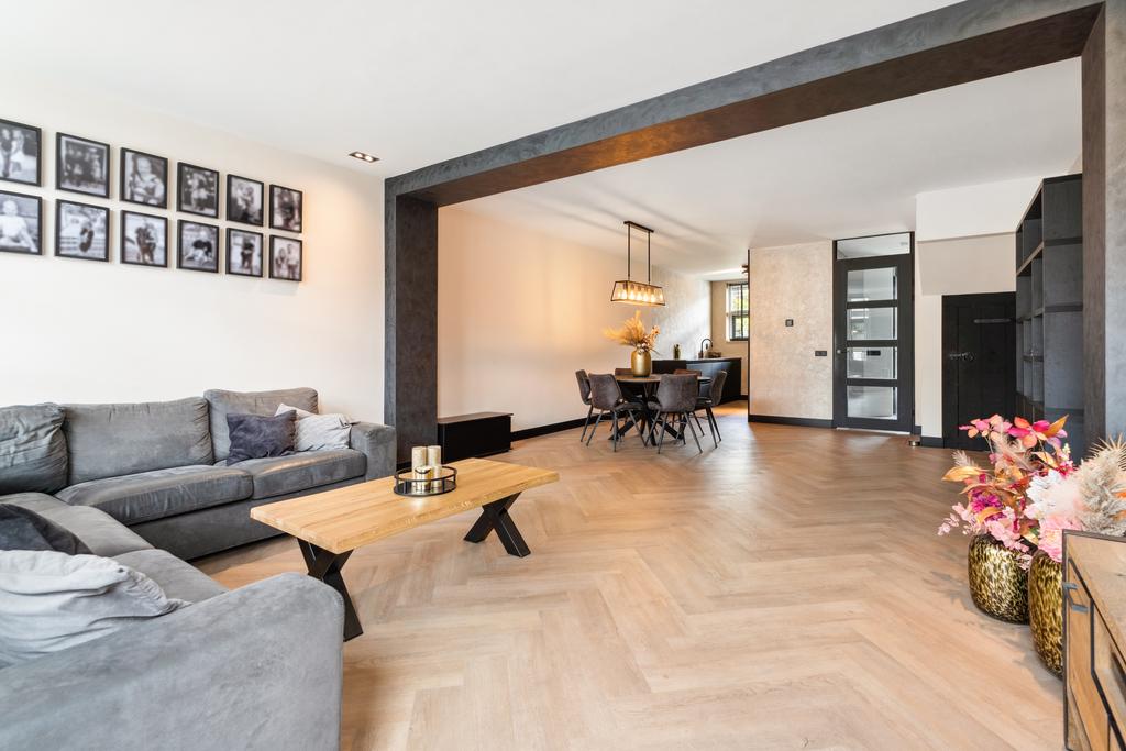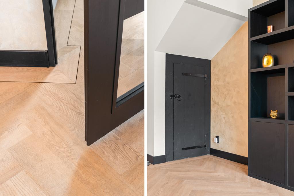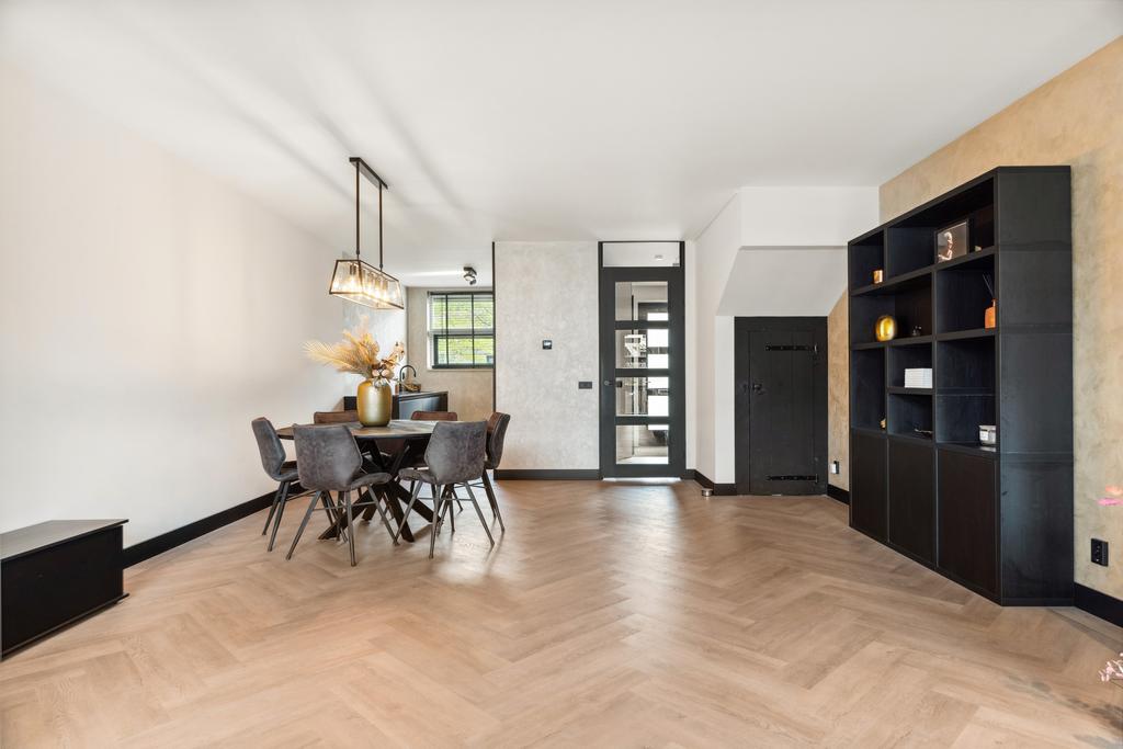 De gehele ruimte straalt een warme sfeer uit, met een prachtige vissengraatvloer (2023) die een charmant accent toevoegt en de smaakvol afgewerkte gestucte wanden.