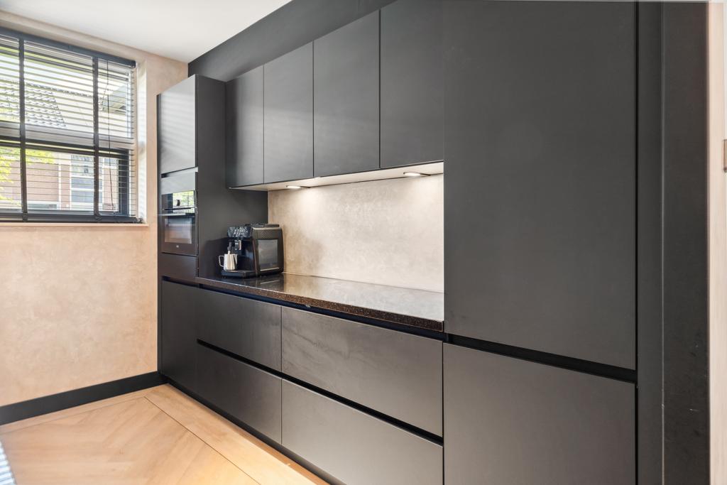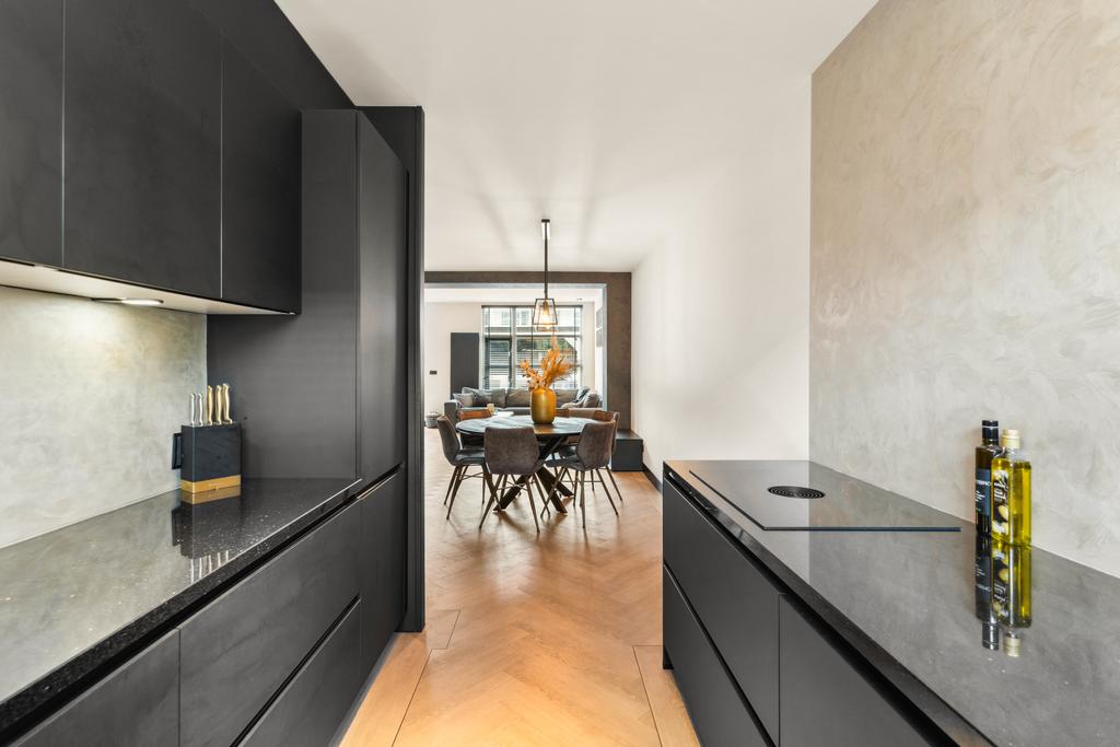 De woonkamer is bijzonder ruim dankzij de uitbouw van bijna 4m. De living meet ruim 42 m² en beschikt over een mooi afgewerkte trapkast. De open keuken, modern en eigentijds (2023), beschikt over veel bergruimte, een oven-magnetron, inductiekookplaat met geïntegreerde afzuiging, koelkast, vriezer, en vaatwasser.