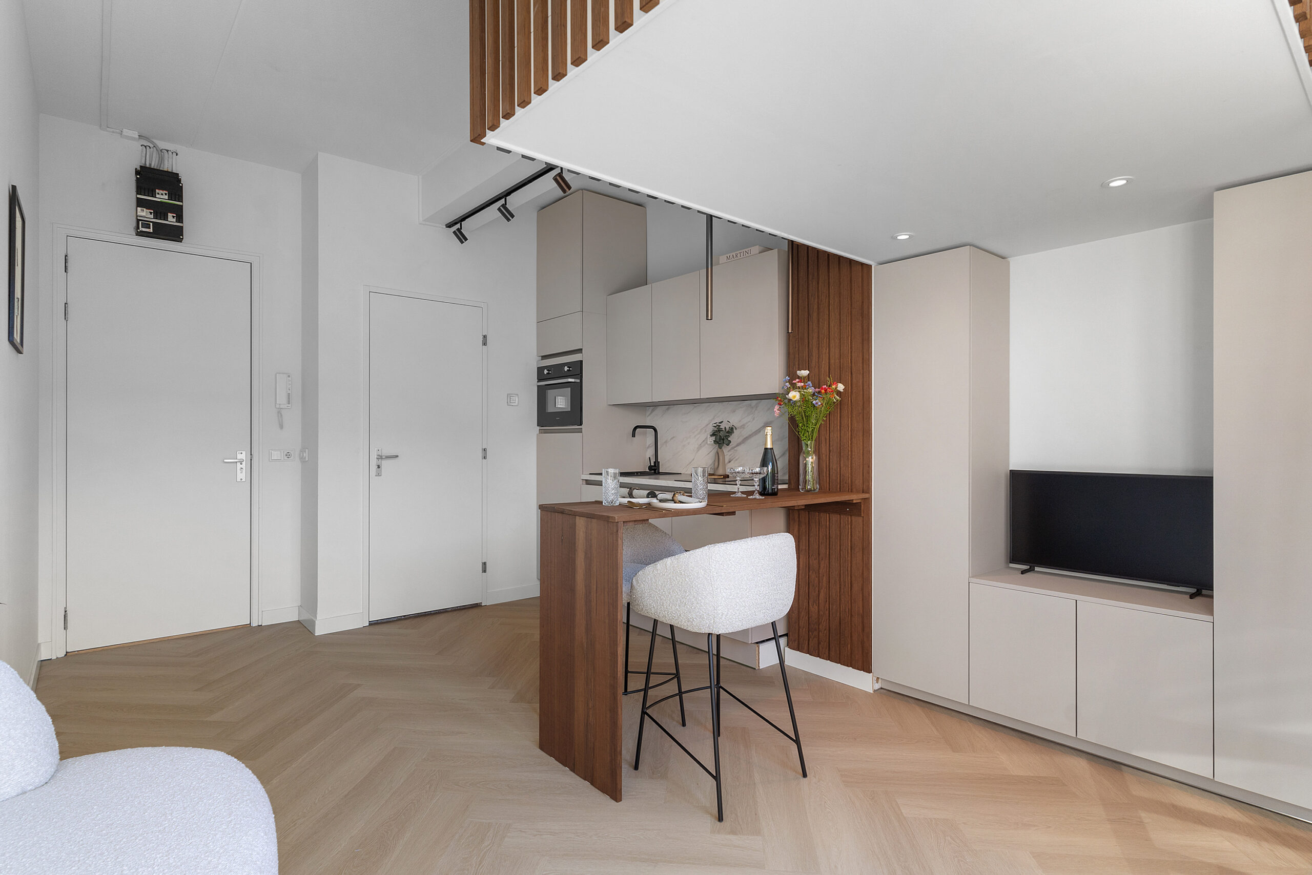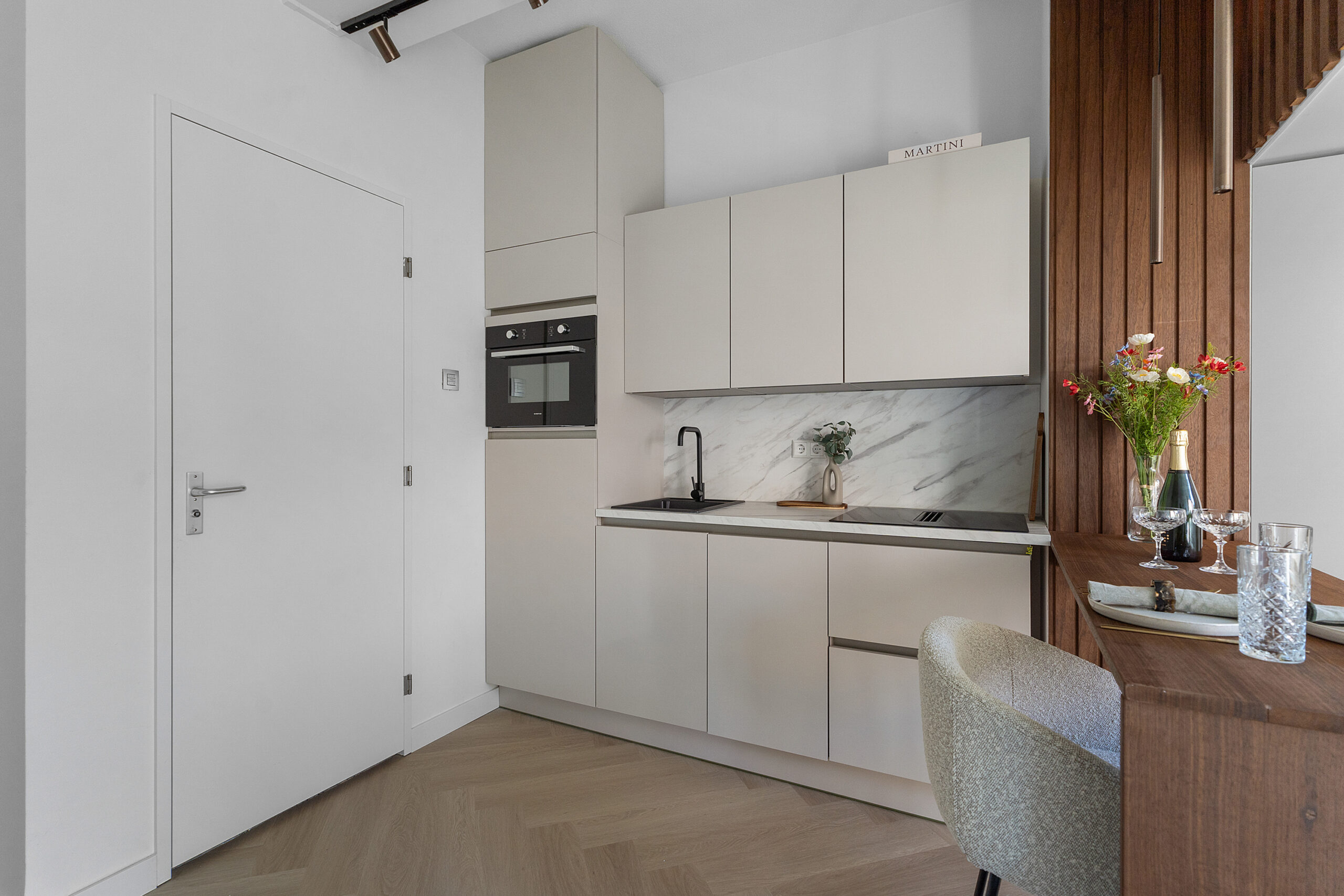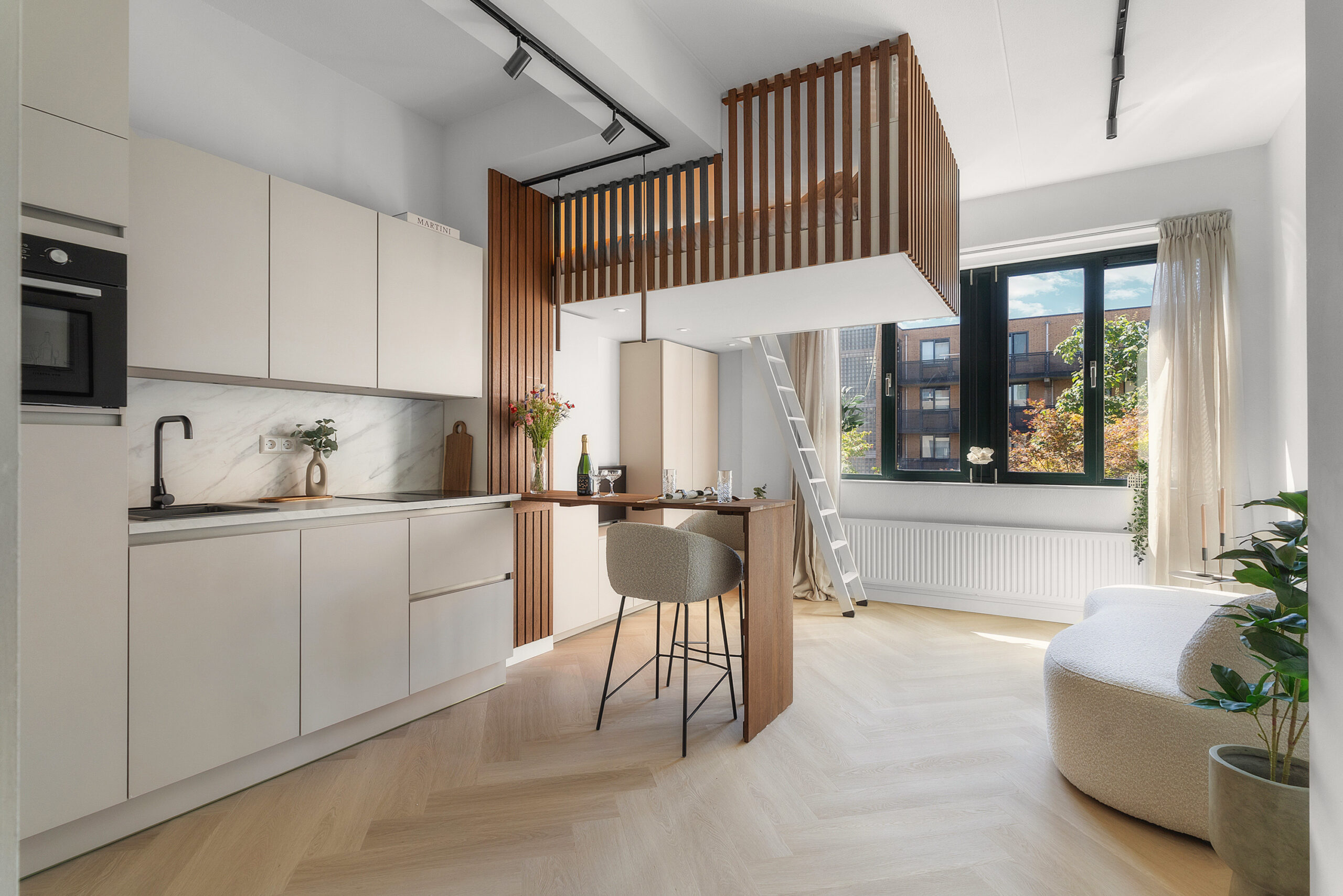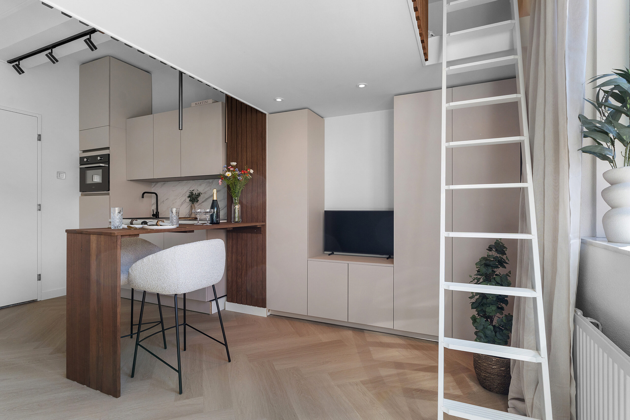 De studio is high-end afgewerkt en heeft een moderne, neutrale kleurstelling, wat zorgt voor een stijlvolle en tijdloze uitstraling. De smaakvolle open keuken met eettafel/bar is voorzien van een combi-magnetron met ovenfunctie, ingebouwde vaatwasser, geïntegreerde afzuiging in de inductiekookplaat, een koel-/ vriescombinatie en een werkblad met marmerlook. De ruimte is slim ingedeeld en naadloos afgestemd op de woonruimte.