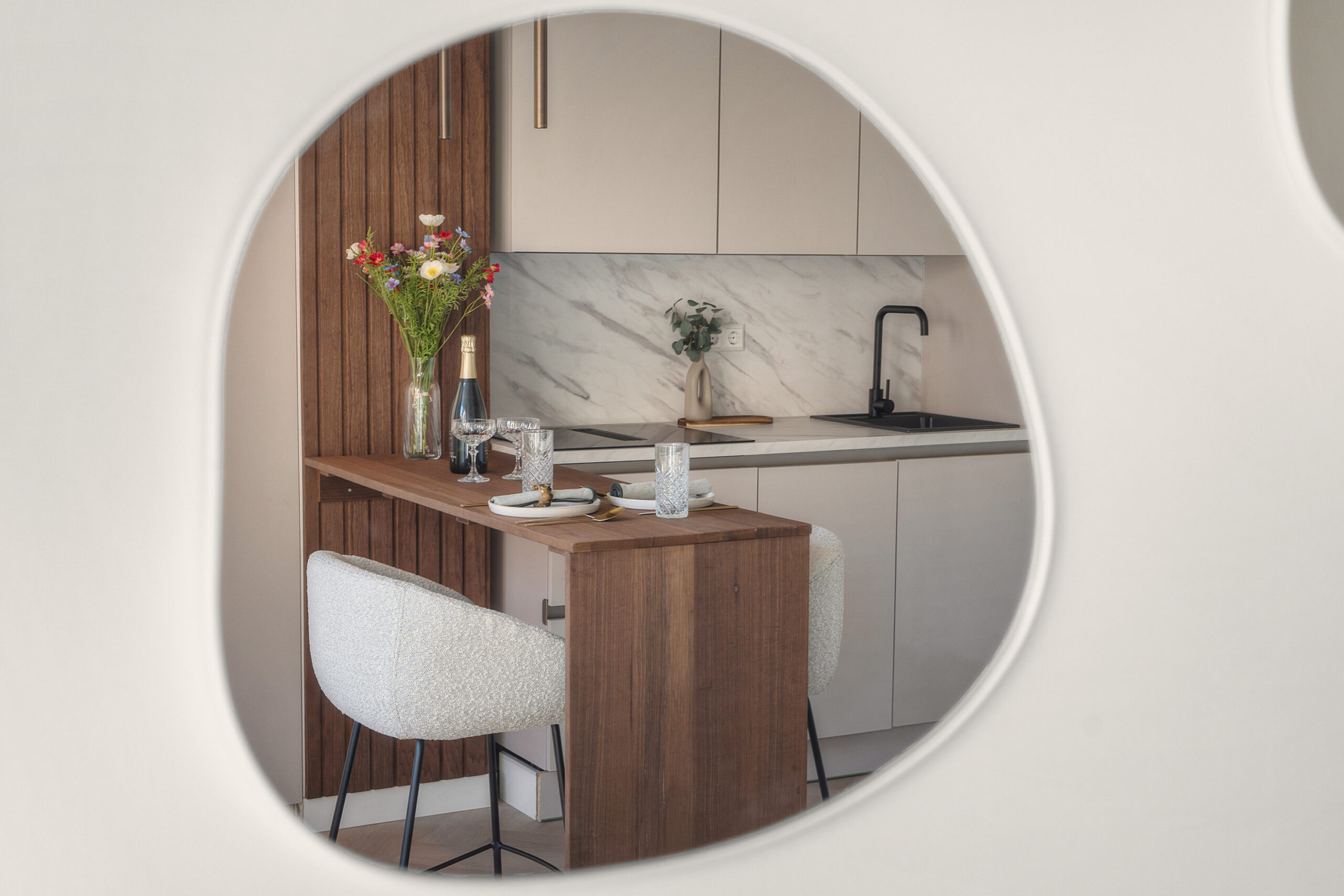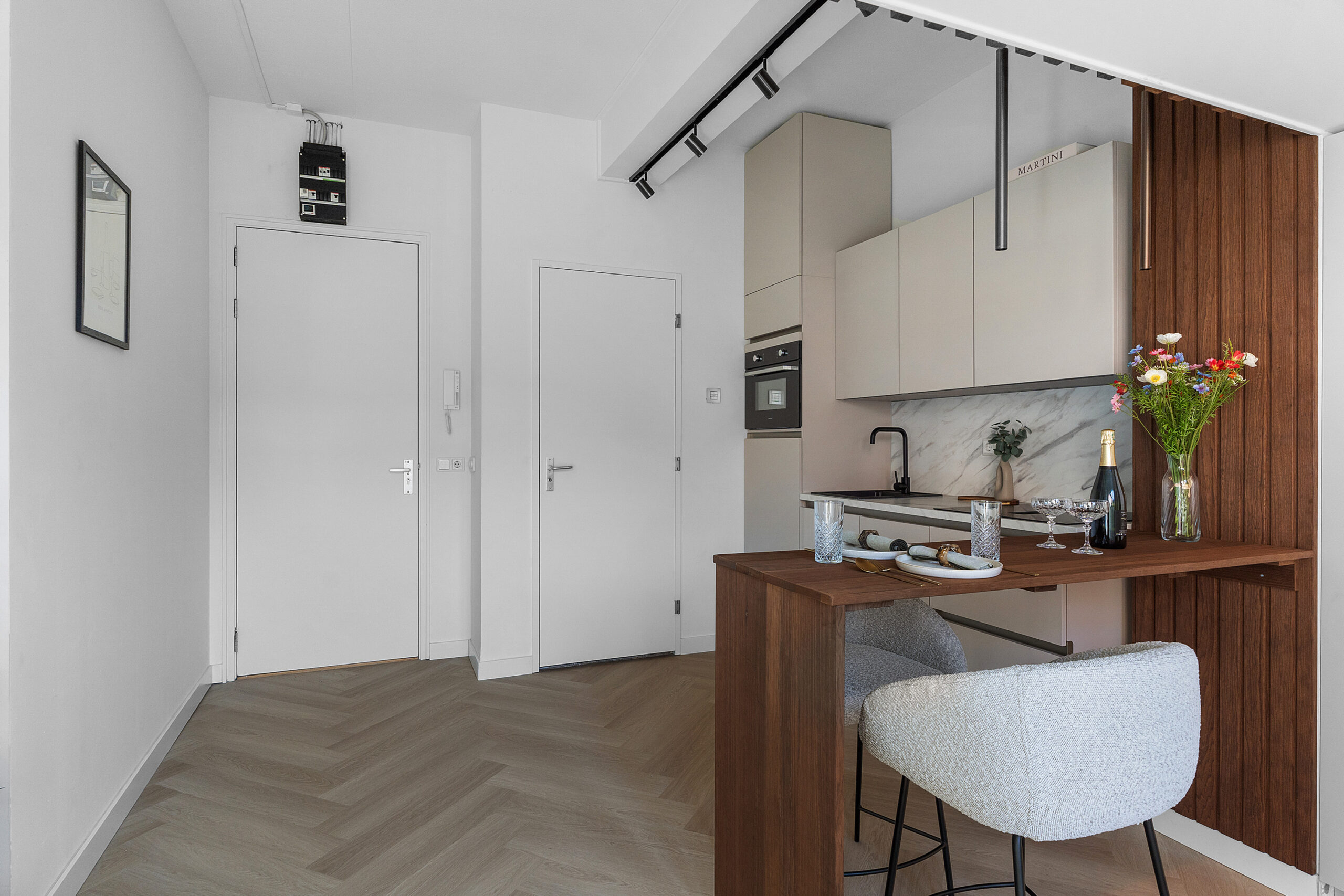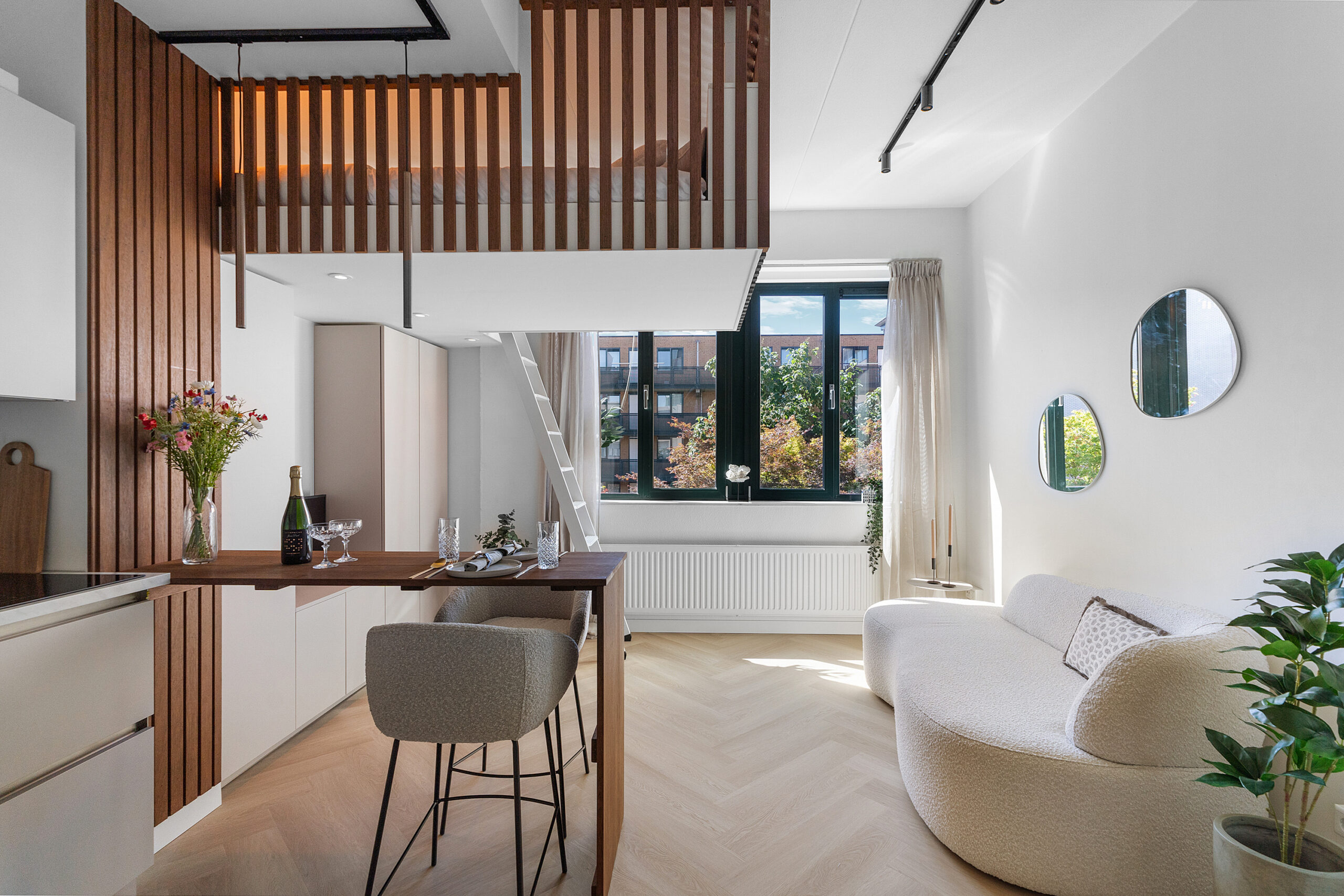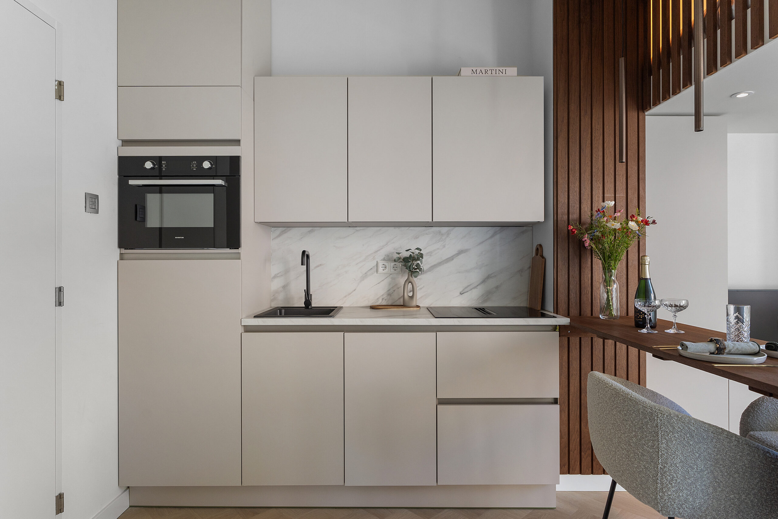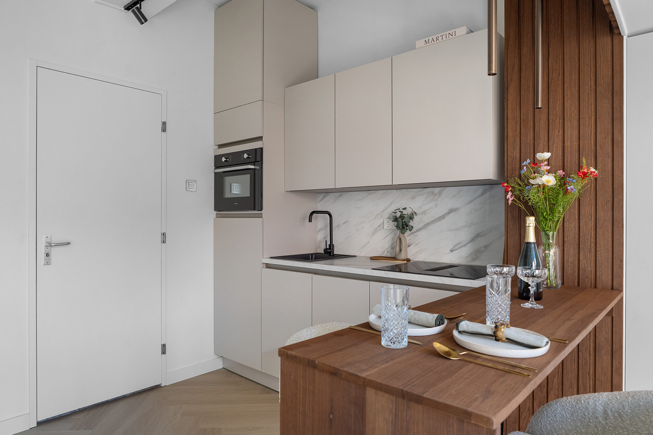 De studio is high-end afgewerkt en heeft een moderne, neutrale kleurstelling, wat zorgt voor een stijlvolle en tijdloze uitstraling. De smaakvolle open keuken met eettafel/bar is voorzien van een combi-magnetron met ovenfunctie, ingebouwde vaatwasser, geïntegreerde afzuiging in de inductiekookplaat, een koel-/ vriescombinatie en een werkblad met marmerlook. De ruimte is slim ingedeeld en naadloos afgestemd op de woonruimte.