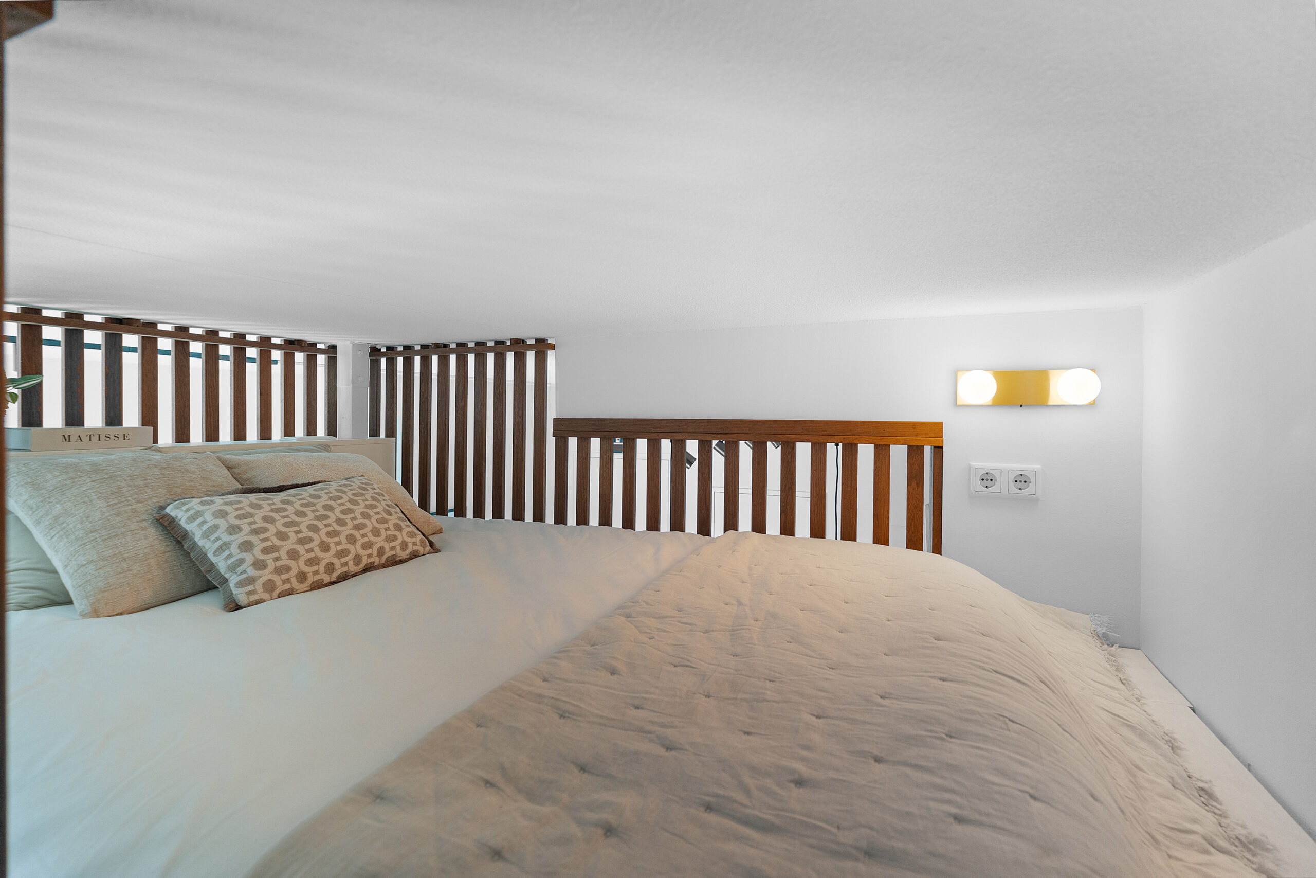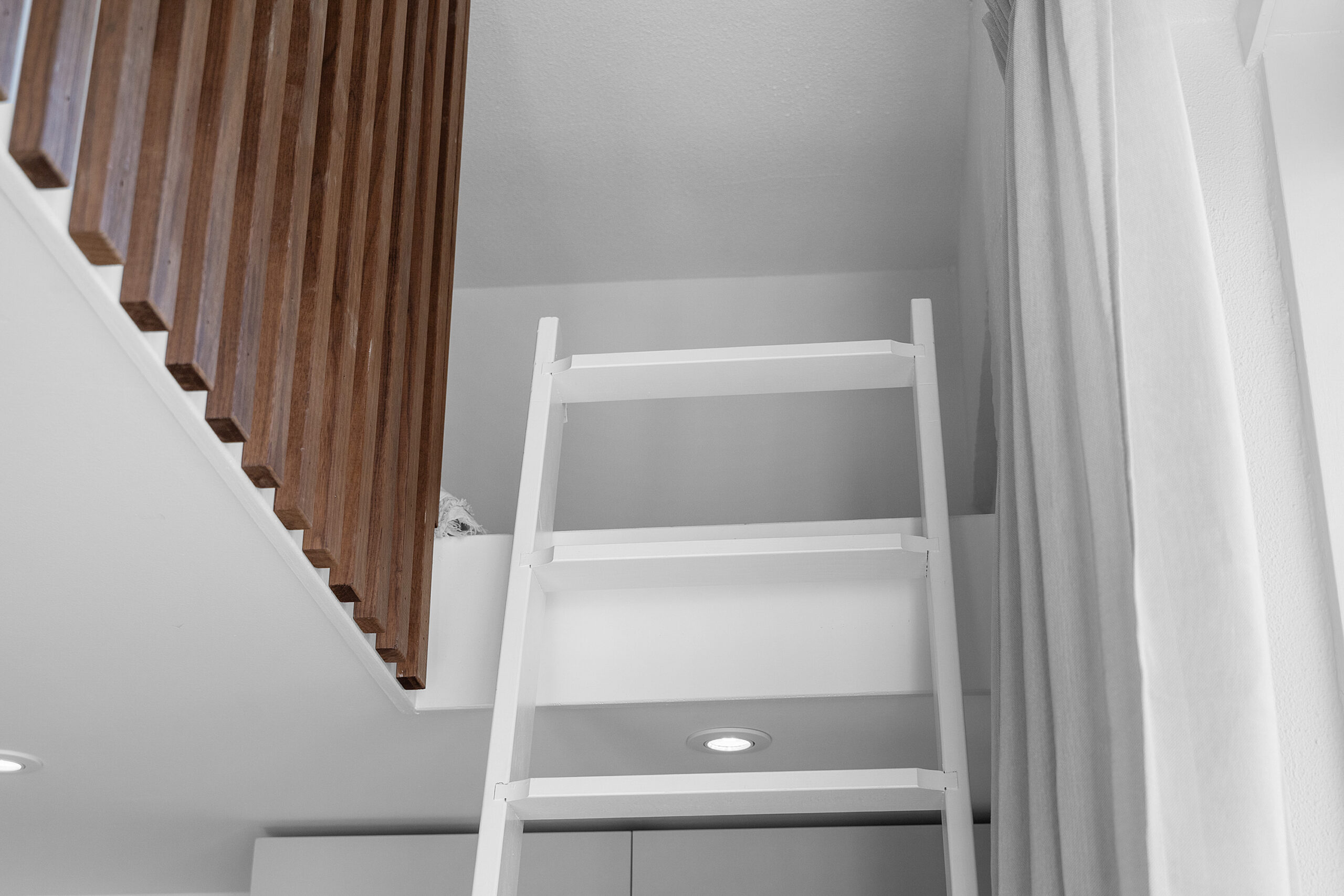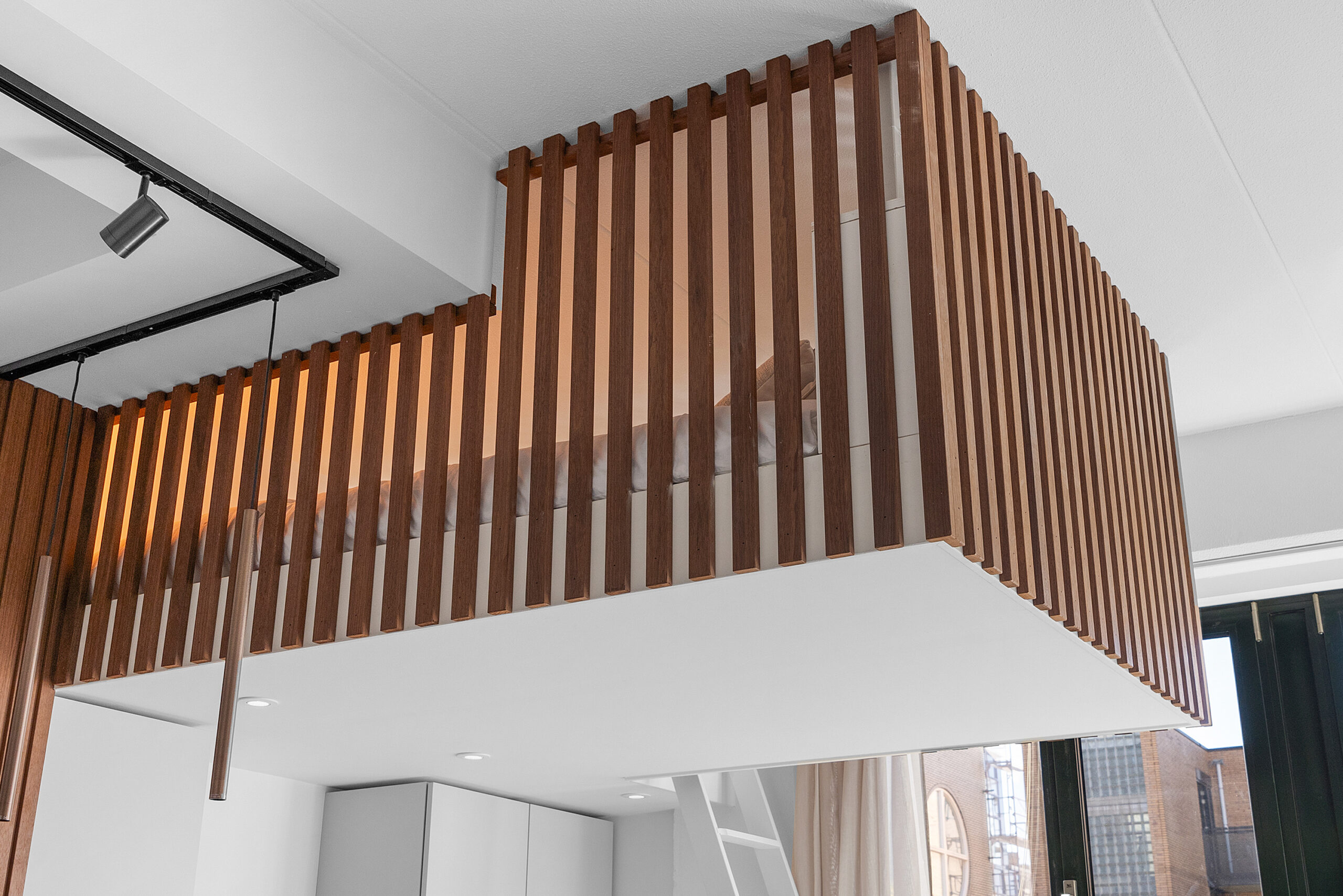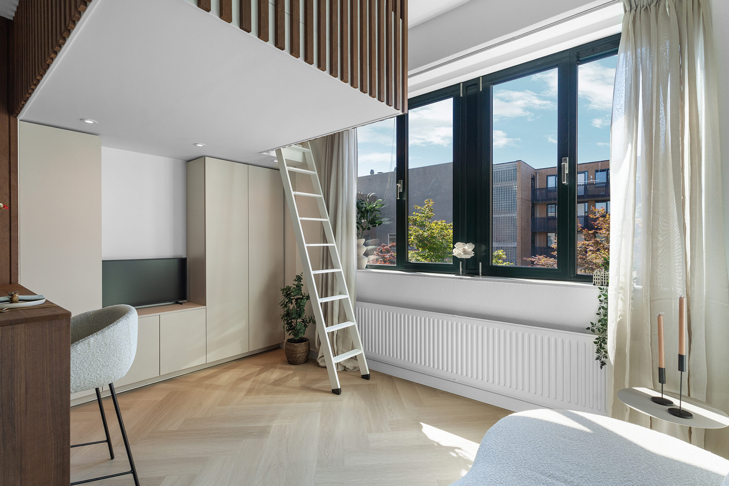 De plafondhoogte van circa 3 meter maakt de bijzondere slaapruimte mogelijk die hier is gerealiseerd. Wonen in een studio en het slaap- en leefgedeelte toch goed gescheiden houden: dat kom je niet vaak tegen. De extra vierkante meters waar je hierdoor van profiteert zijn niet opgenomen in het woonoppervlak, maar wel een enorme toevoeging in het dagelijks woongenot!