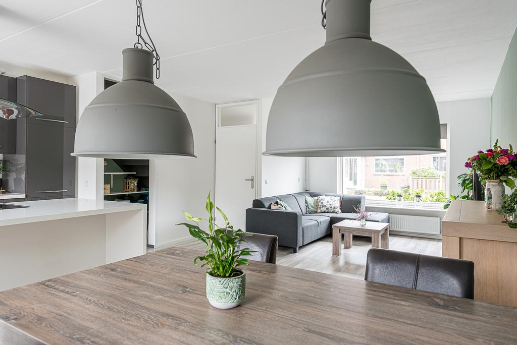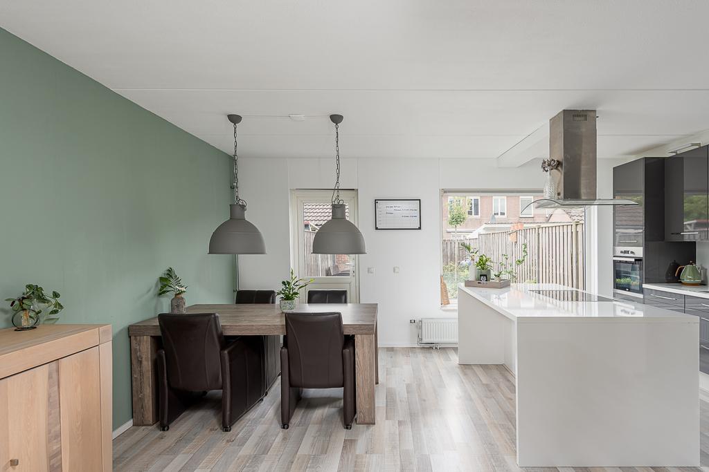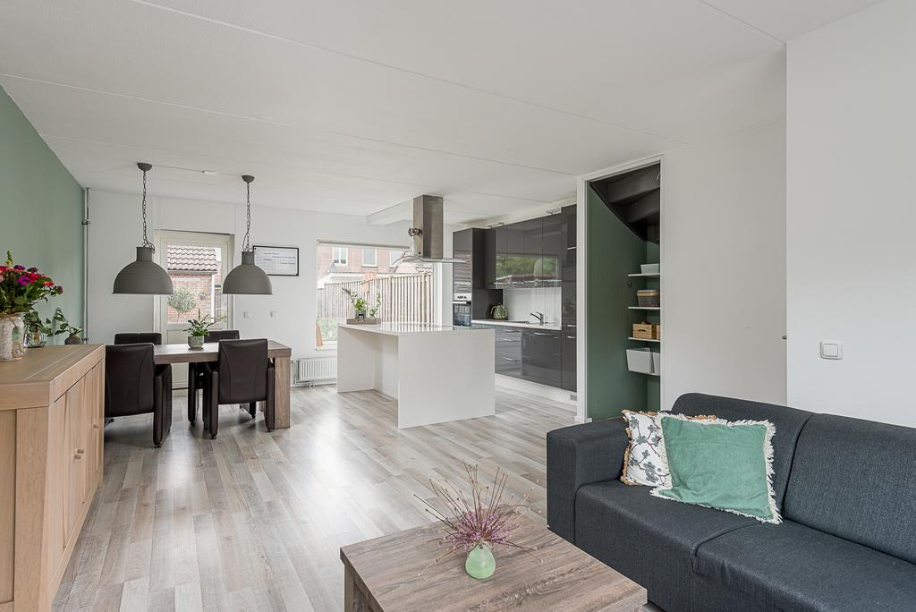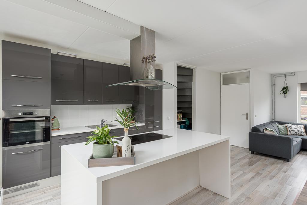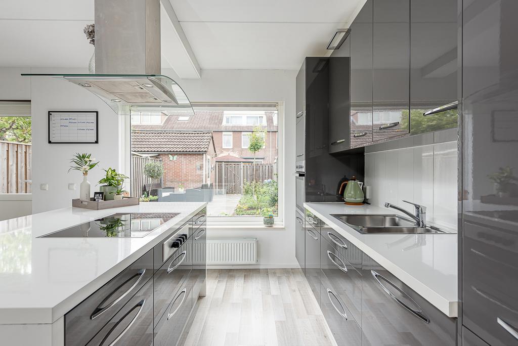 De moderne keuken is gelegen aan de achterzijde van de woning en is voorzien van een ruim en smaakvol kookeiland met eetbar. Door het ontbreken van wanden is er een ruime open woonkeuken ontstaan die overgaat in de woonkamer. Één grote leefruimte. De keuken met hoogglans fronten en kookeiland is verder voorzien van RVS-afzuigschouw, vaatwasser, combi-oven, oven, 4-pits inductie kookplaat en een koel/vriescombinatie.