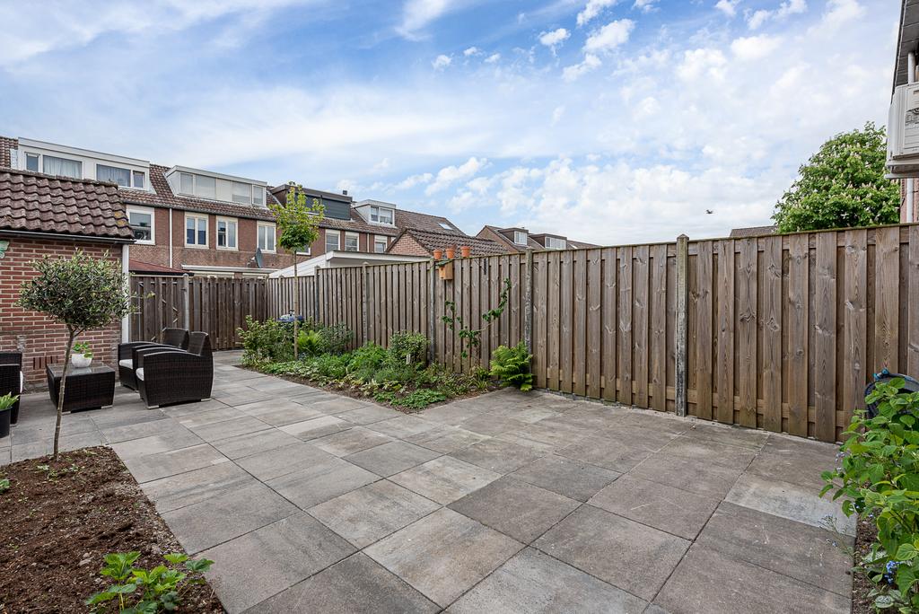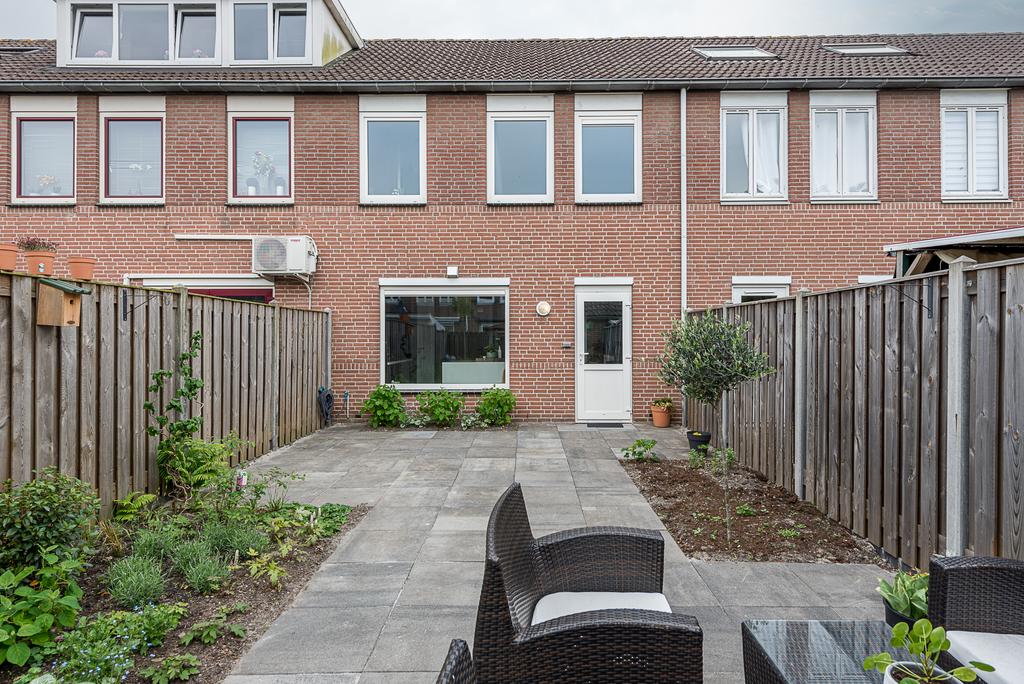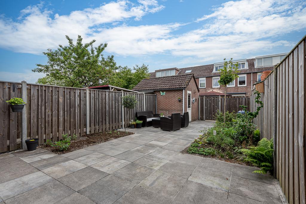 In de achtertuin ervaar je rust. Er zijn meerdere zithoeken te creëren met zicht op de gezellige borders. Deze zijn dit jaar nog opnieuw beplant met bloemen en vaste planten. Met deze warme dagen verwachten we dat e.e.a. al goed in bloei zal staan tijdens jouw bezichtiging. Hier heb je nog jaren plezier van.