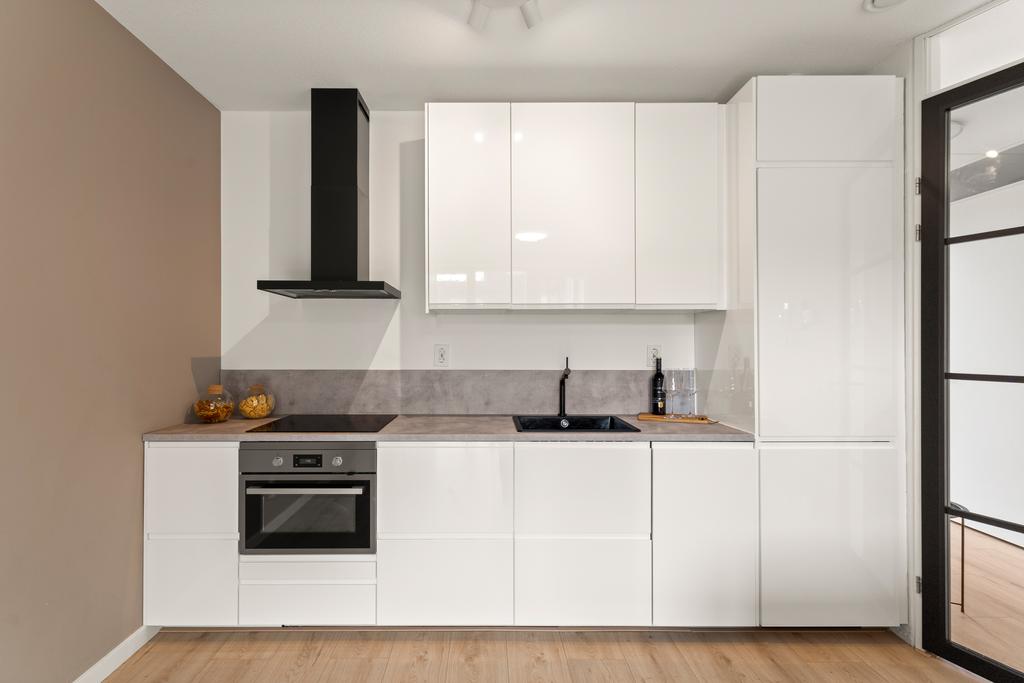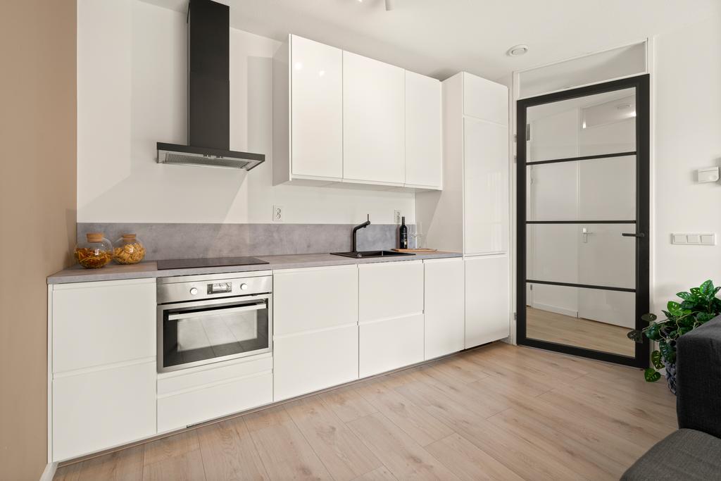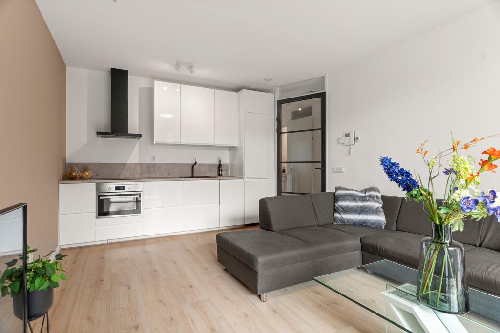 De woonkamer is heerlijk licht en ruim dankzij de grote raampartijen en biedt toegang tot een zonnig balkon op het zuidwesten. De moderne keuken is een ware eyecatcher, compleet met hoogglans kasten en prachtig aanrechtblad. De keuken is voorzien van een inductiekookplaat, afzuigschouw, koelkast, vriezer, oven, zwarte gootsteen en kraan en een vaatwasser.