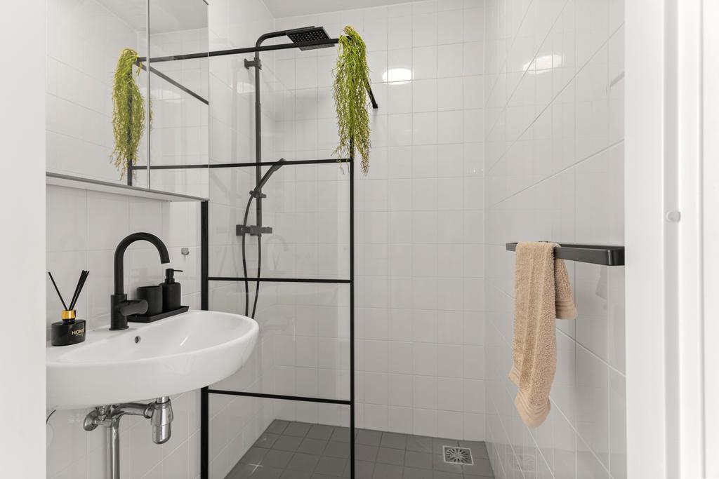 In de ruime badkamer vind je een moderne inloopdouche met een stijlvolle stalen douchewand, een wastafel met een elegante spiegel met bergruimte en een stopcontact. De zwarte sanitair armaturen geven de ruimte een frisse en hippe uitstraling.