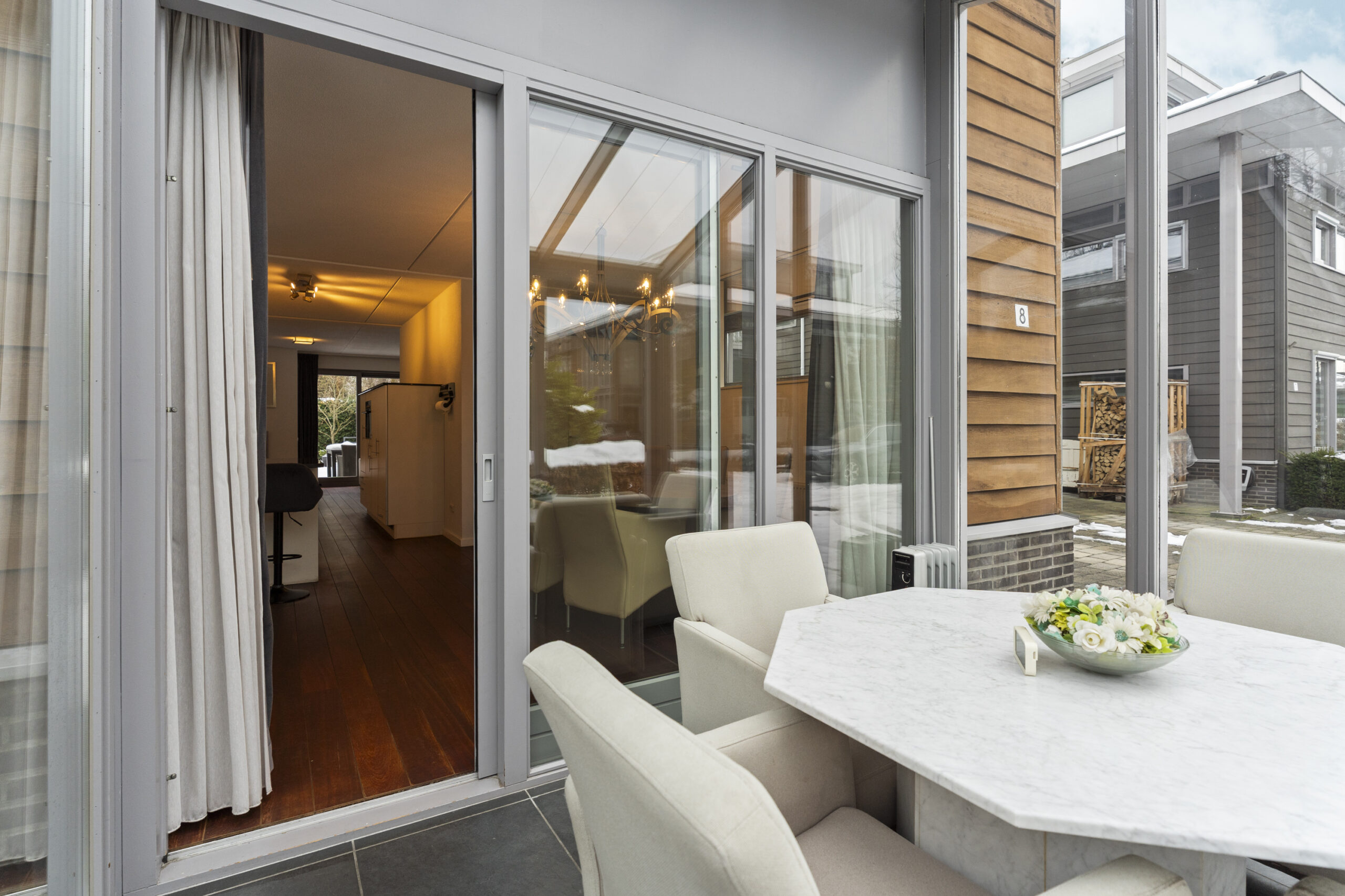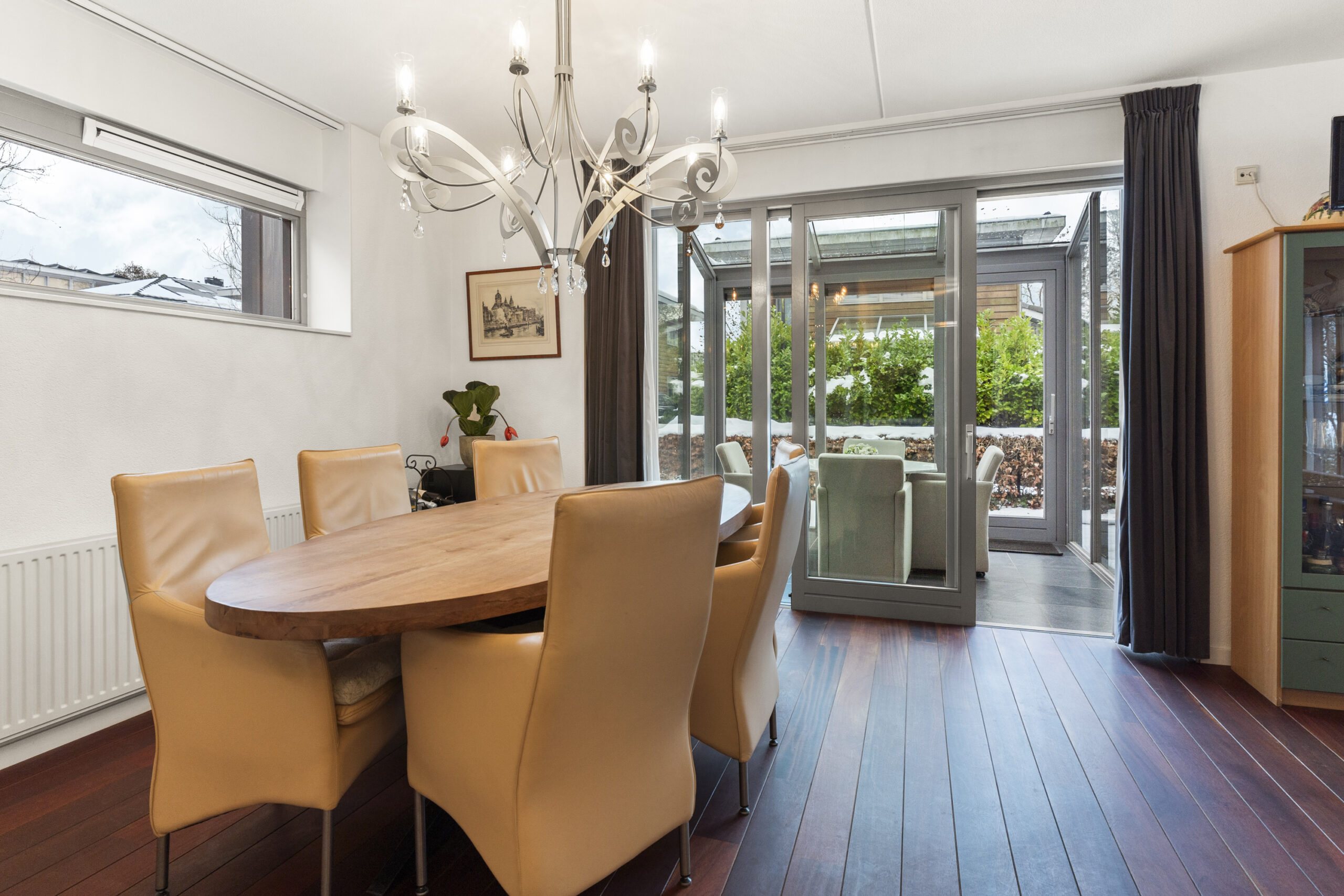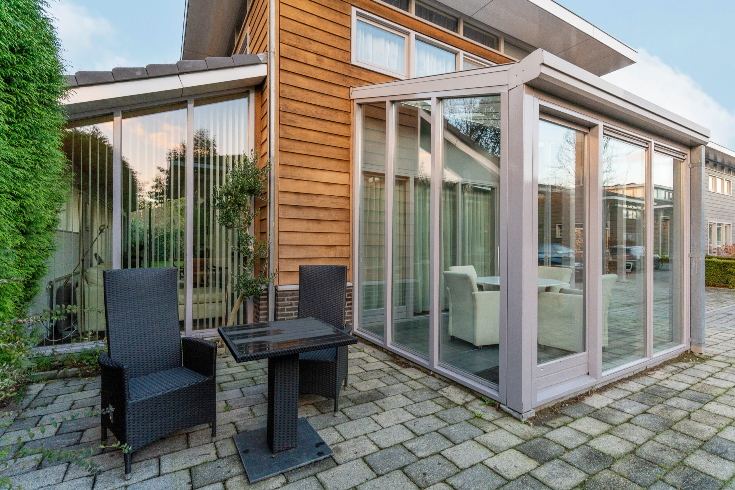 De serre aan de voorzijde, gelegen aan de rustige doodlopende straat en beschut, is een heerlijke plek om het hele jaar door te zitten en van de ochtend- of middagzon te genieten. Via de schuifpui bereik je de royale achtertuin van maar liefst 180 m², ideaal voor zon, privacy en ontspanning.