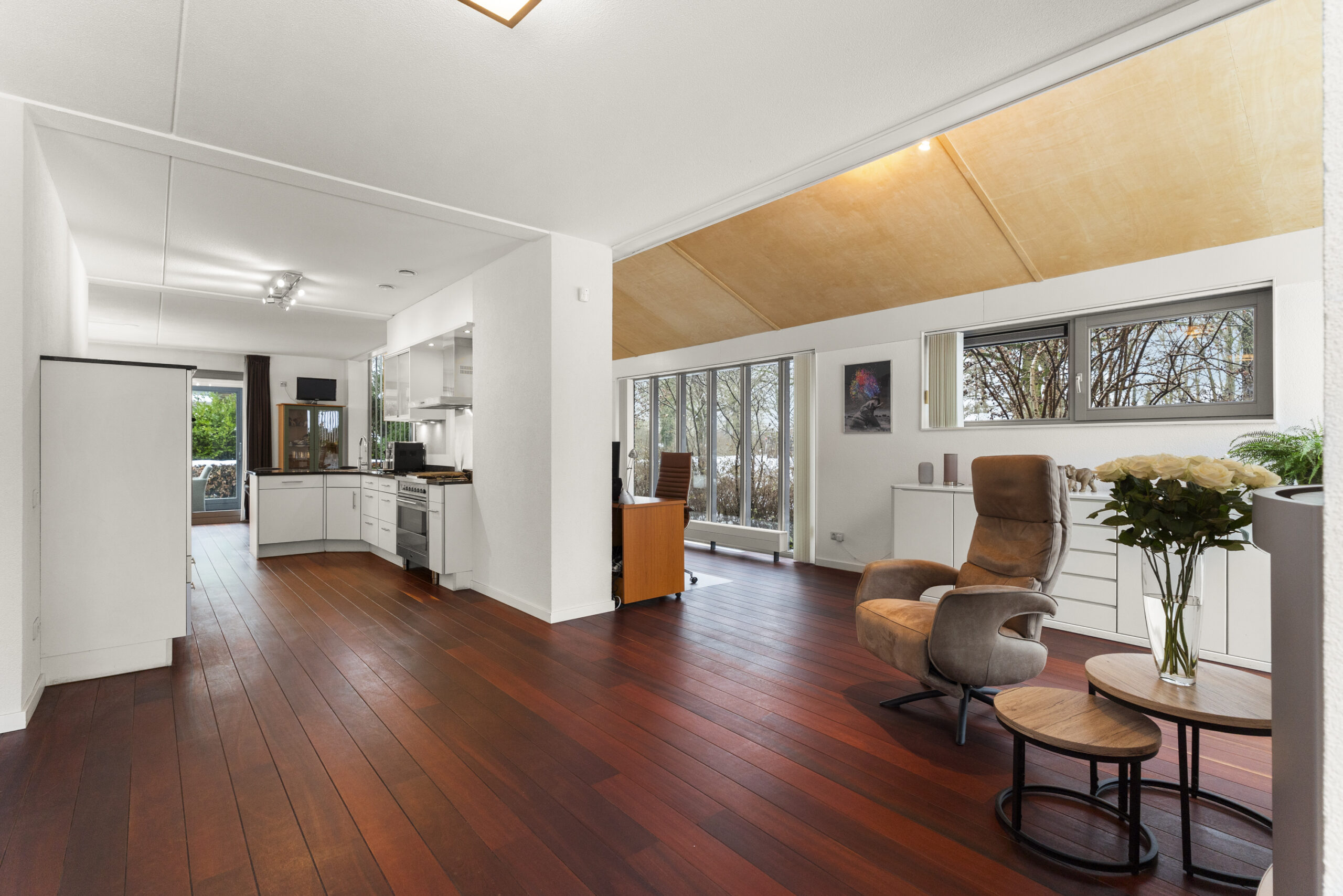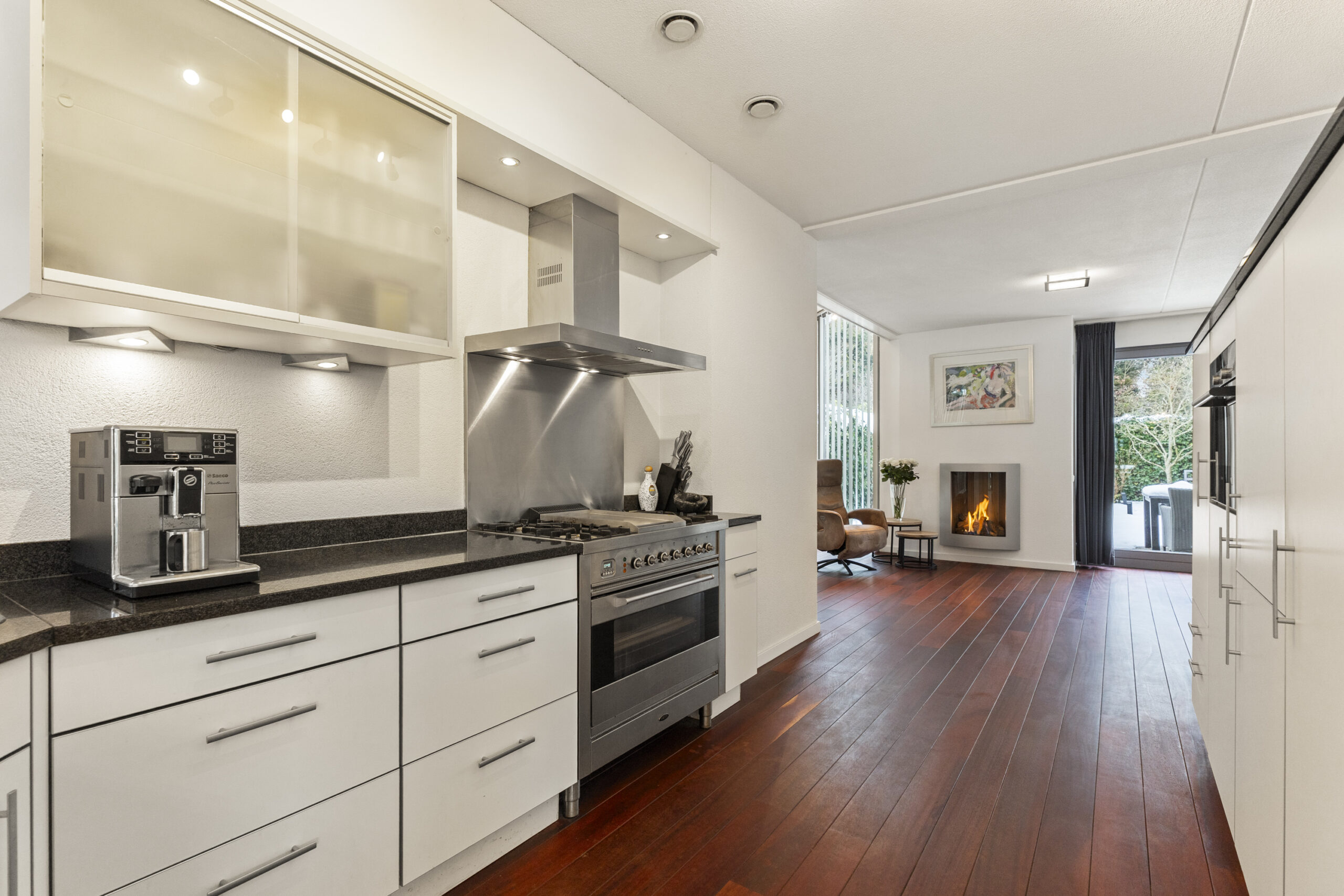 De keuken is compleet uitgerust met magnetron, vaatwasser, Boretti fornuis met 5 pitten en grill, oven, Quooker, koelkast en vriezer. Dankzij de vele ramen is er overal volop natuurlijk licht, wat de ruimte een warme en uitnodigende sfeer geeft. In de keuken en woonkamer ligt een Afzelia tropisch hardhouten vloer. De gang en de serre zijn voorzien van Braziliaans leisteen, duurzaam en tijdloos, perfect passend bij de lichte en open sfeer van de woning.