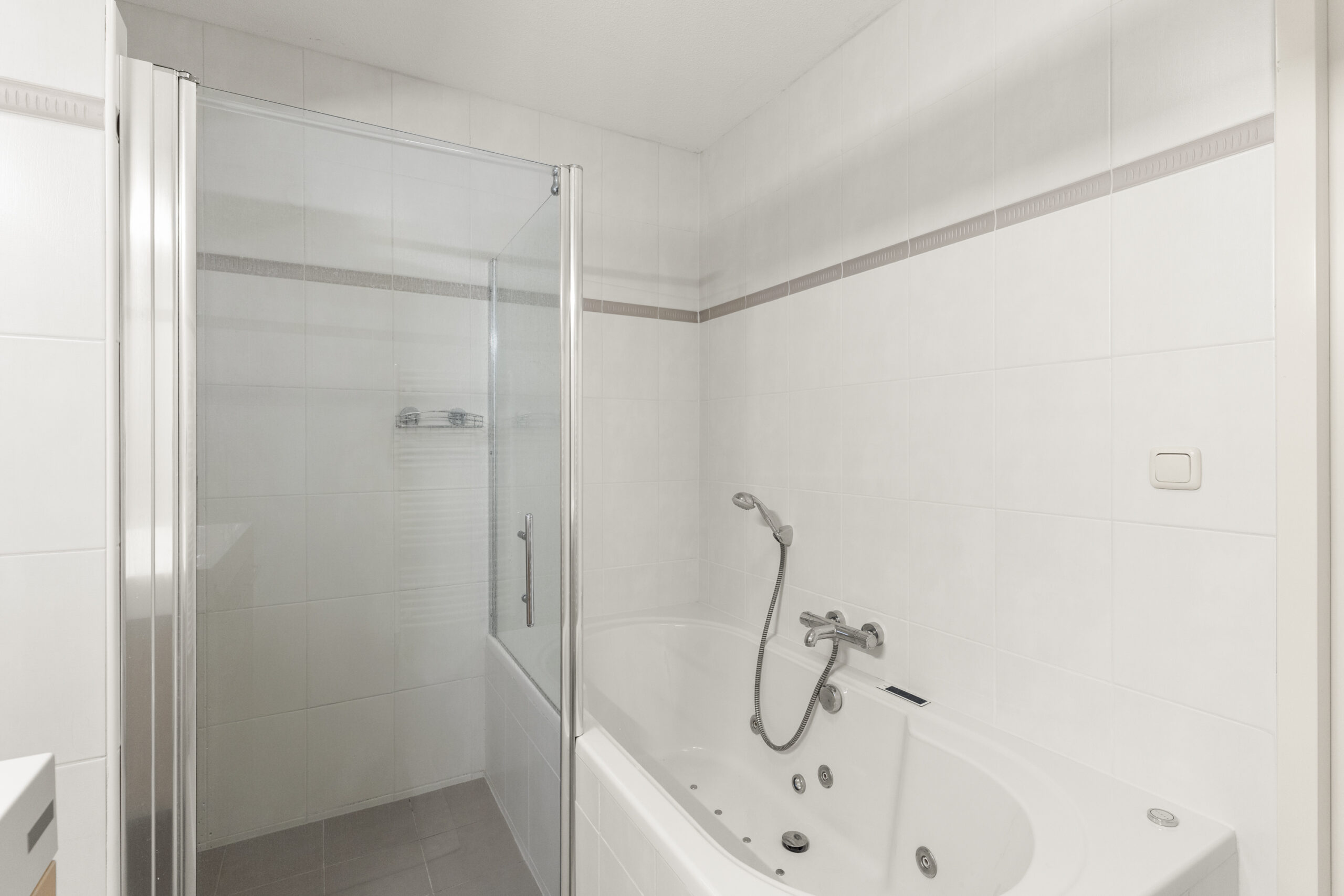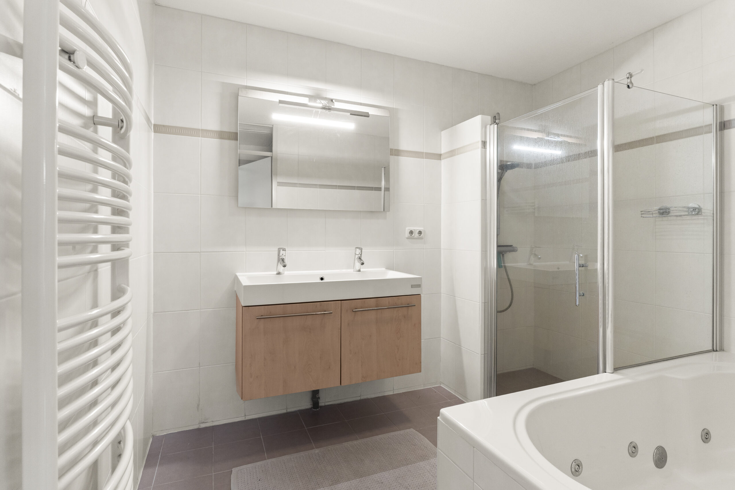 Daarnaast is er een aparte ruimte voor de cv-ketel en wasmachine/droger, wat veel praktische opbergruimte biedt. De badkamer is volledig ingericht met een whirlpoolbad, inloopdouche en dubbele wastafel, en er is een apart toilet. Via een luik op de overloop is de vliering bereikbaar, ideaal voor extra opslag.