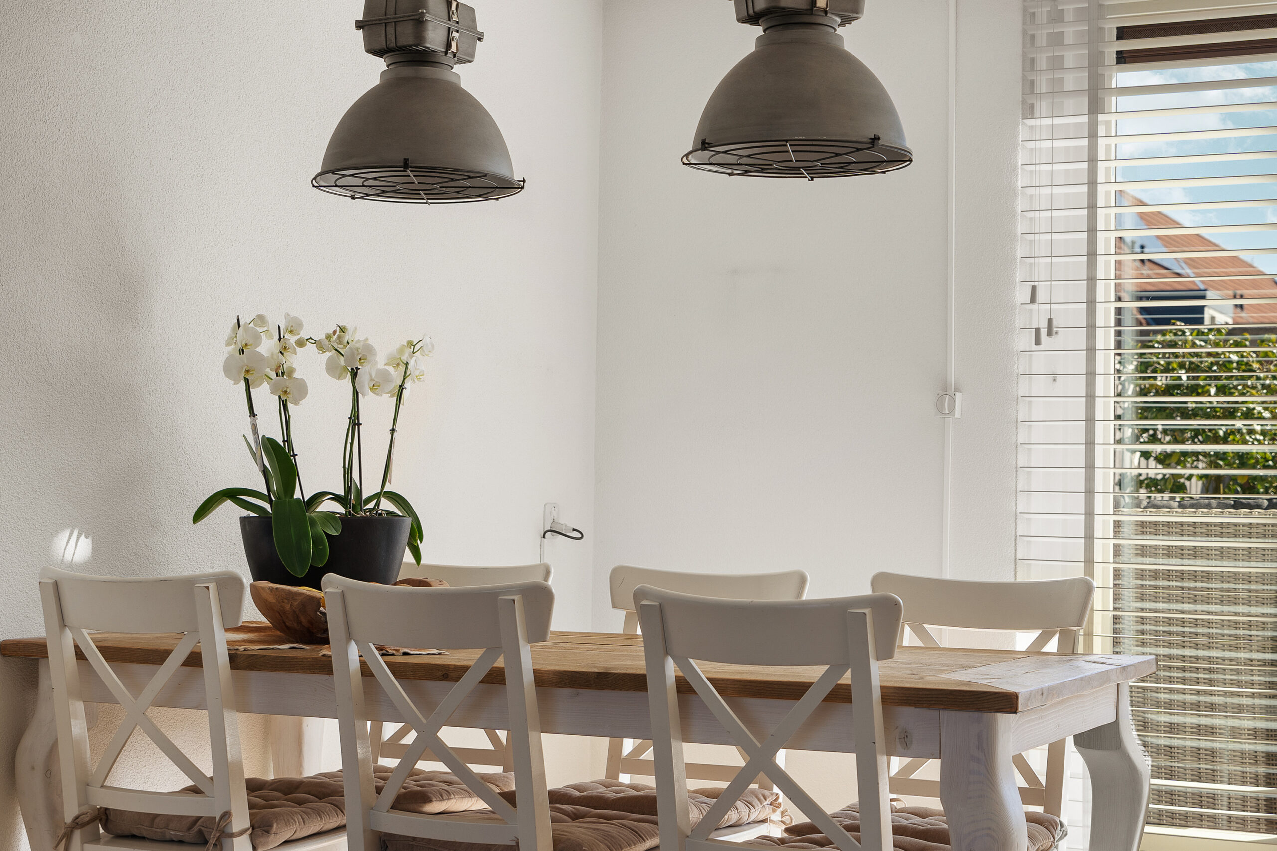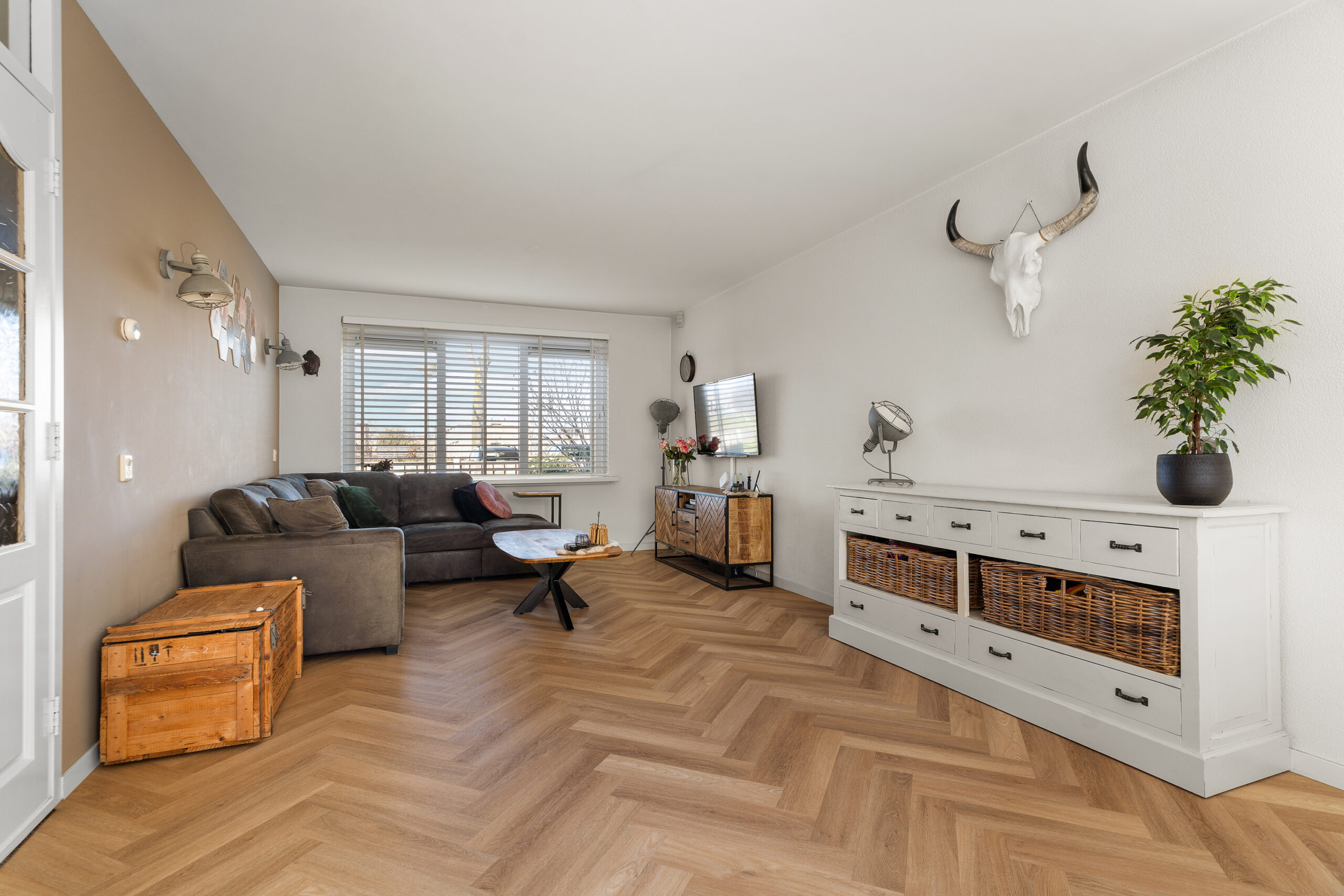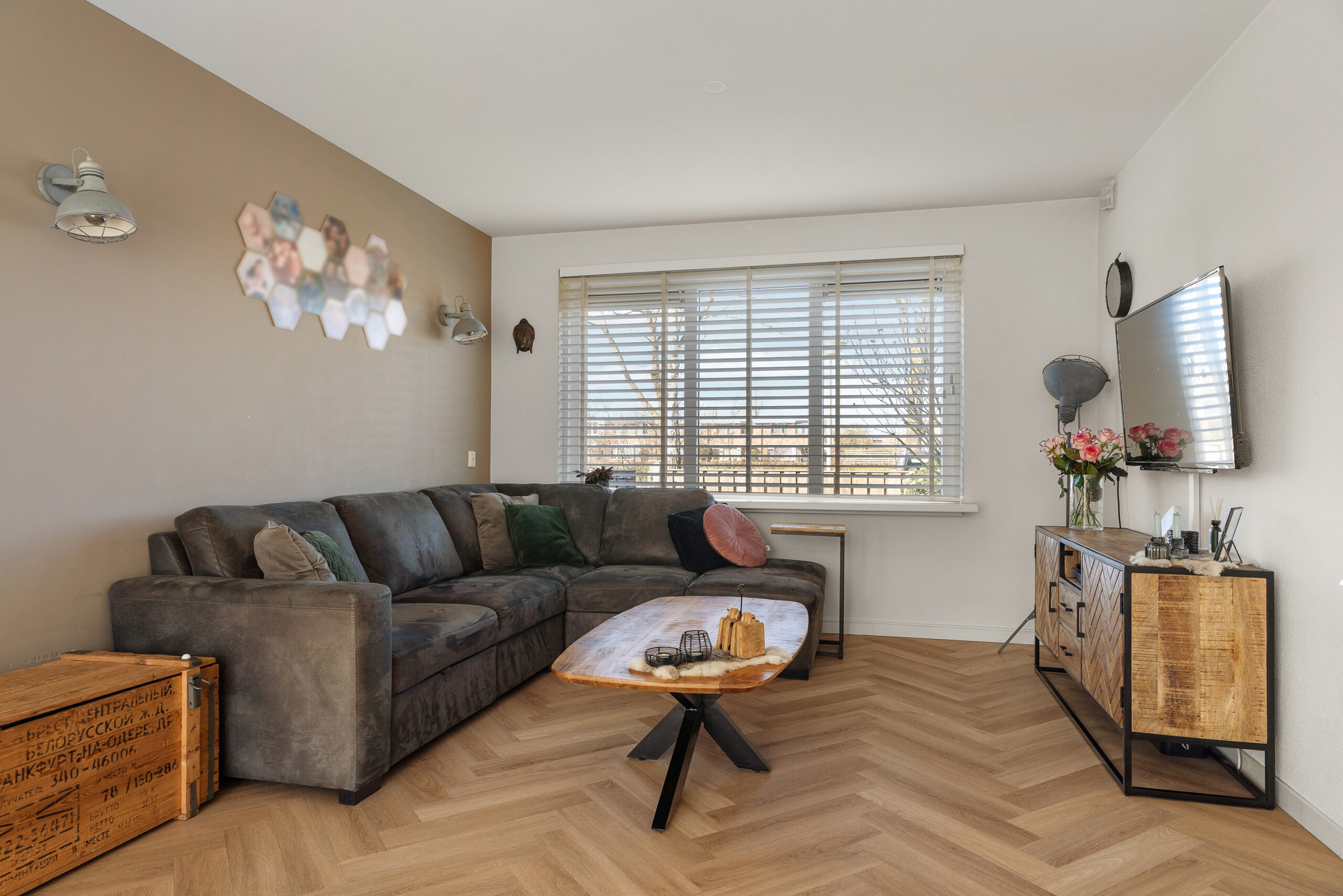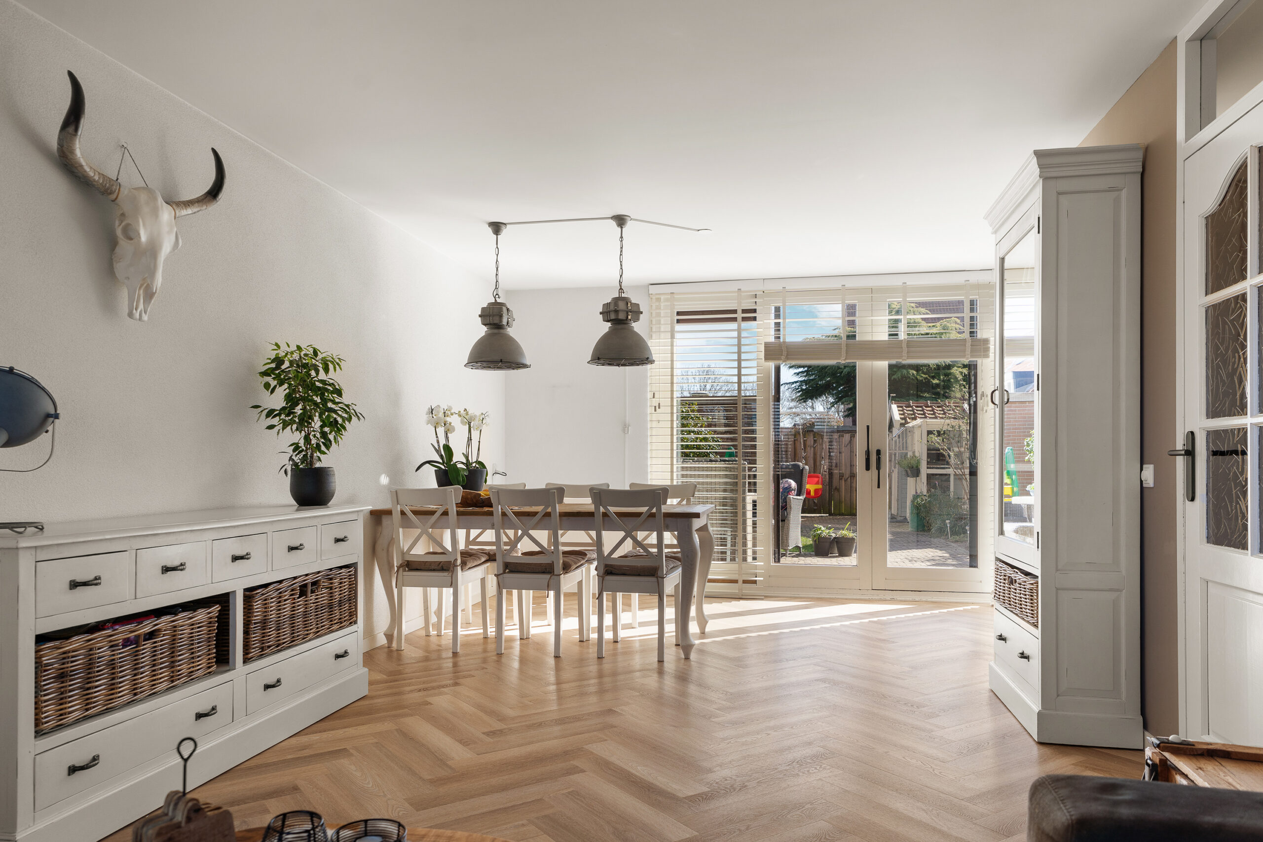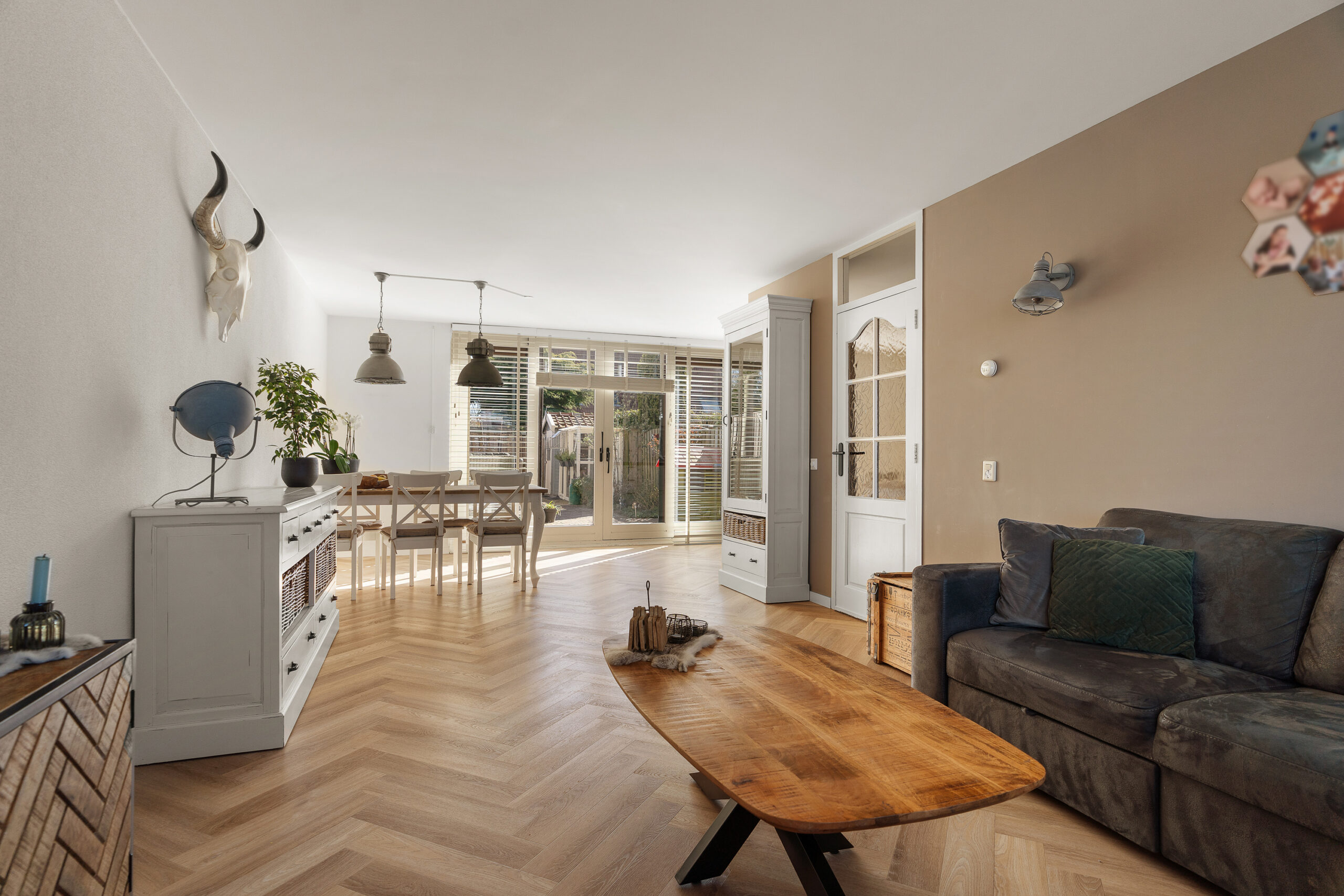 De woonkamer is voorzien van een elegante vissengraatvloer en de grote ramen, aan zowel de voor- als achterzijde, zorgen voor een overvloed aan natuurlijk licht, wat de ruimte helder en uitnodigend maakt. Aan de achterzijde van de woning bevindt zich de open, strak witte keuken, die is uitgerust met een oven, combioven-magnetron, koelkast, vriezer, inductiekookplaat en afzuigkap. Een bijzonder detail zijn de mooie honingraat wanddecoratietegels. De glazen dubbele schuifpui naar de achtertuin zorgt voor een fijne verbinding tussen binnen en buiten.