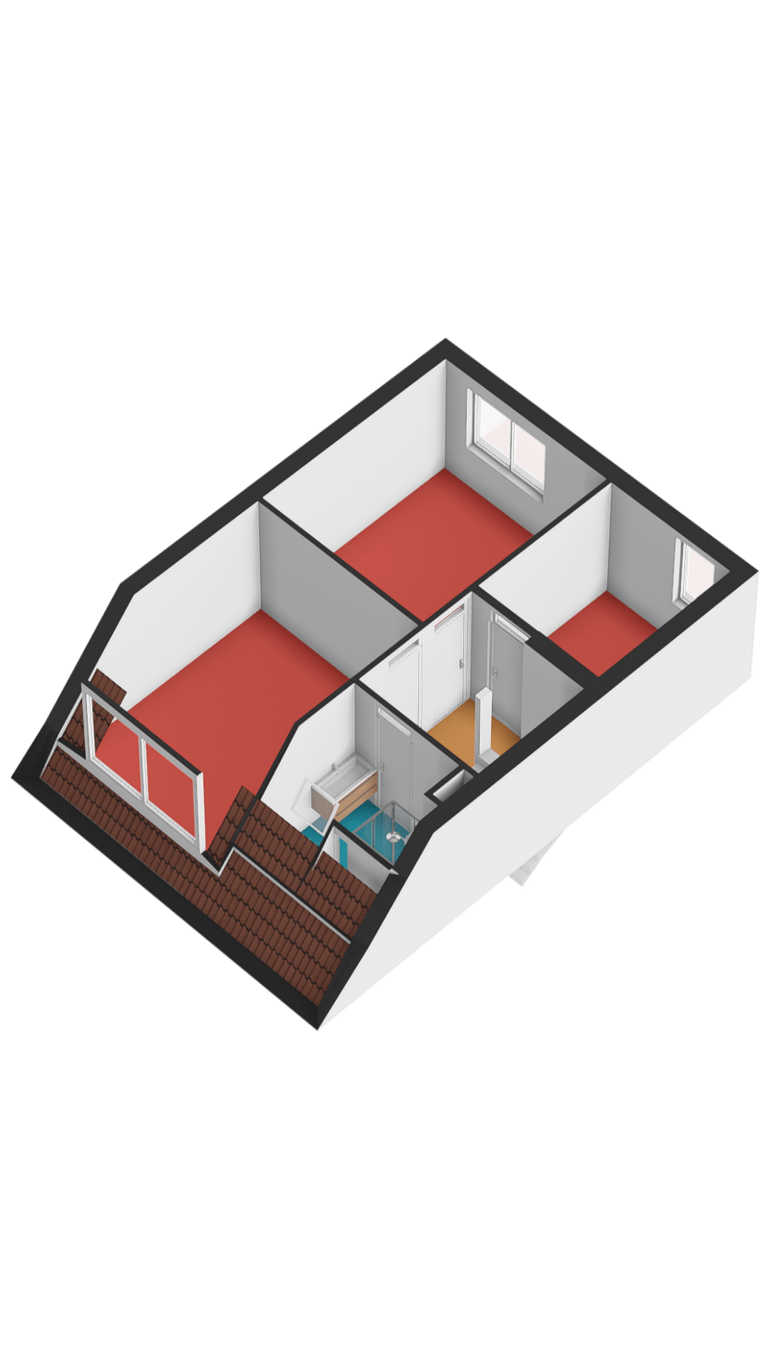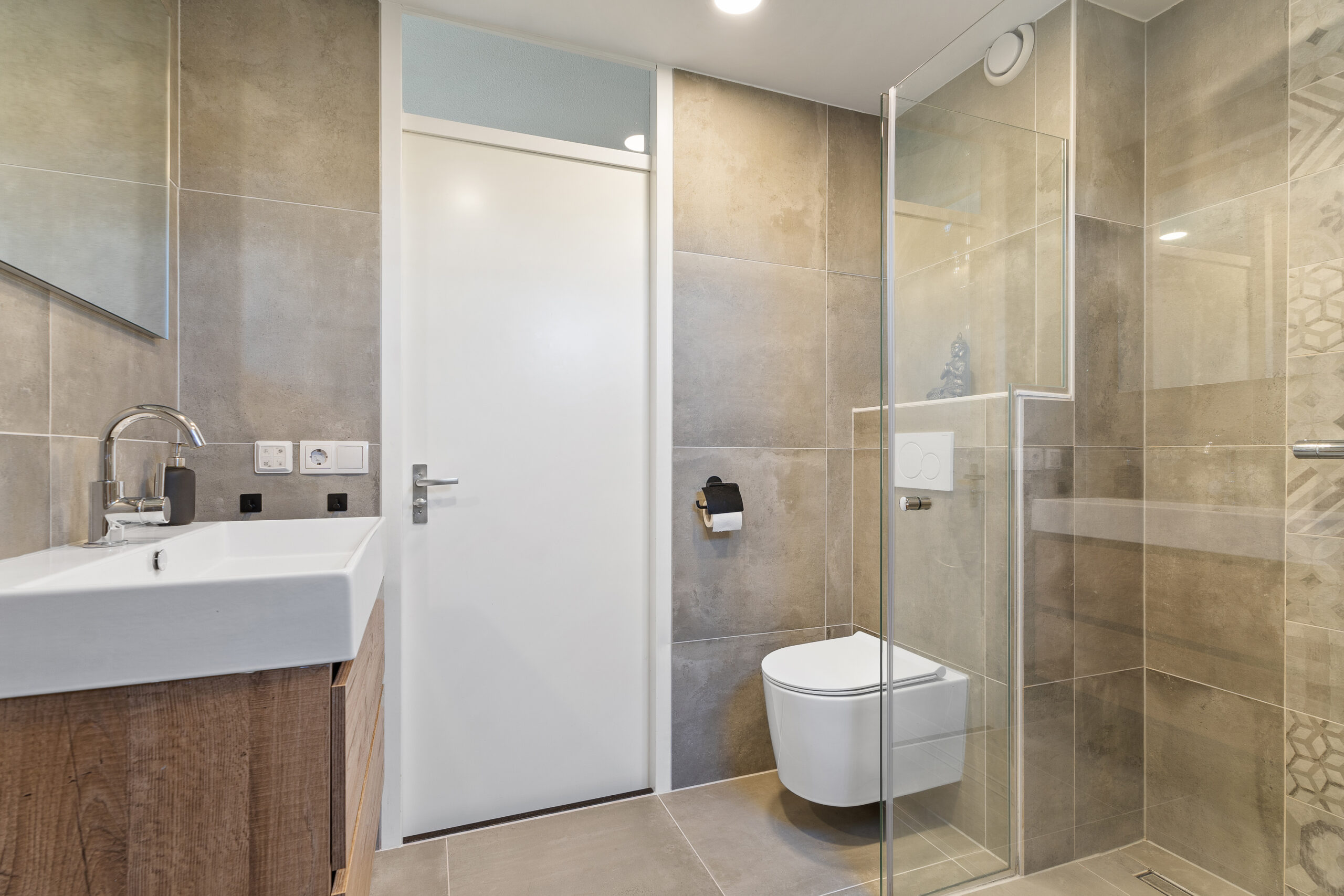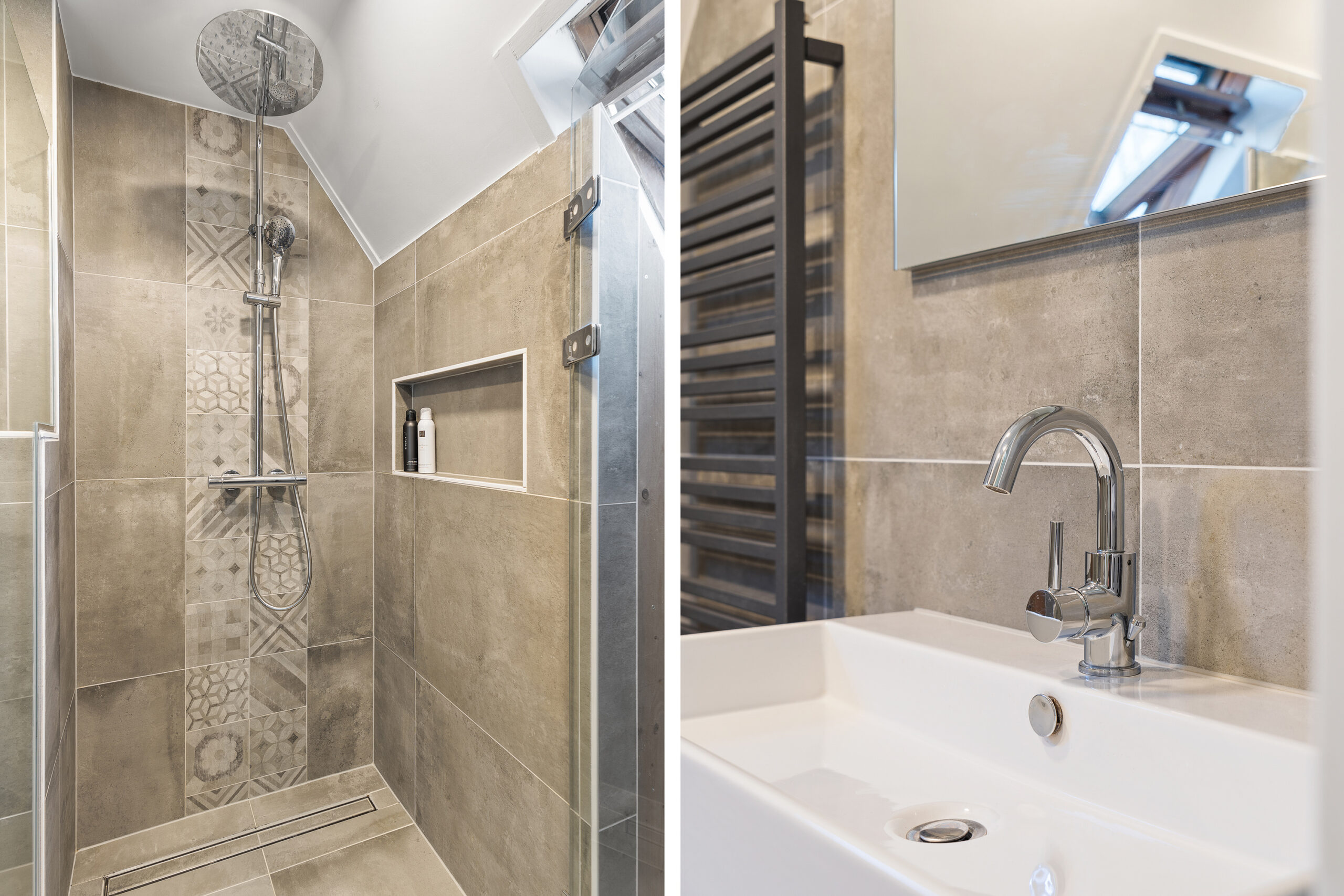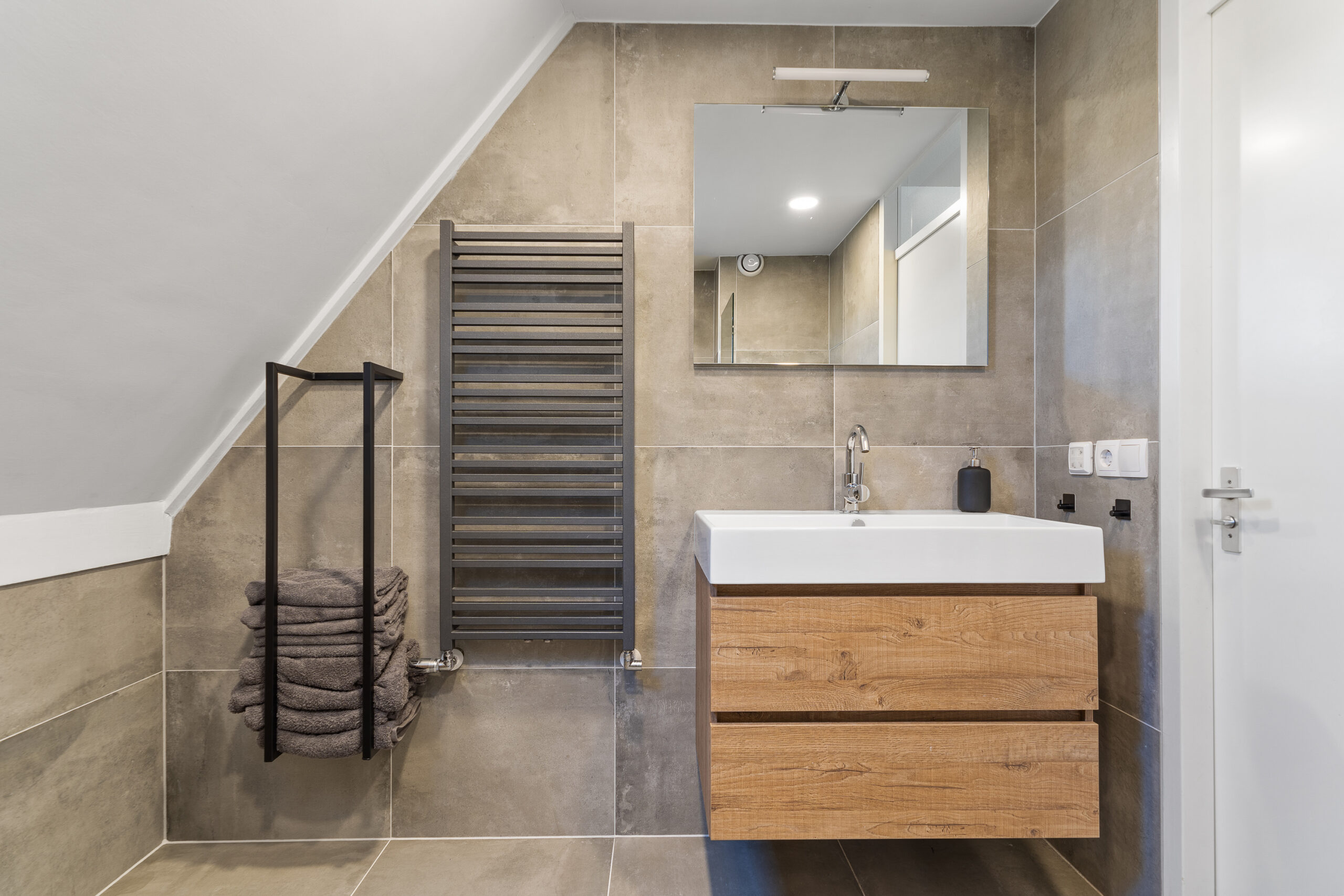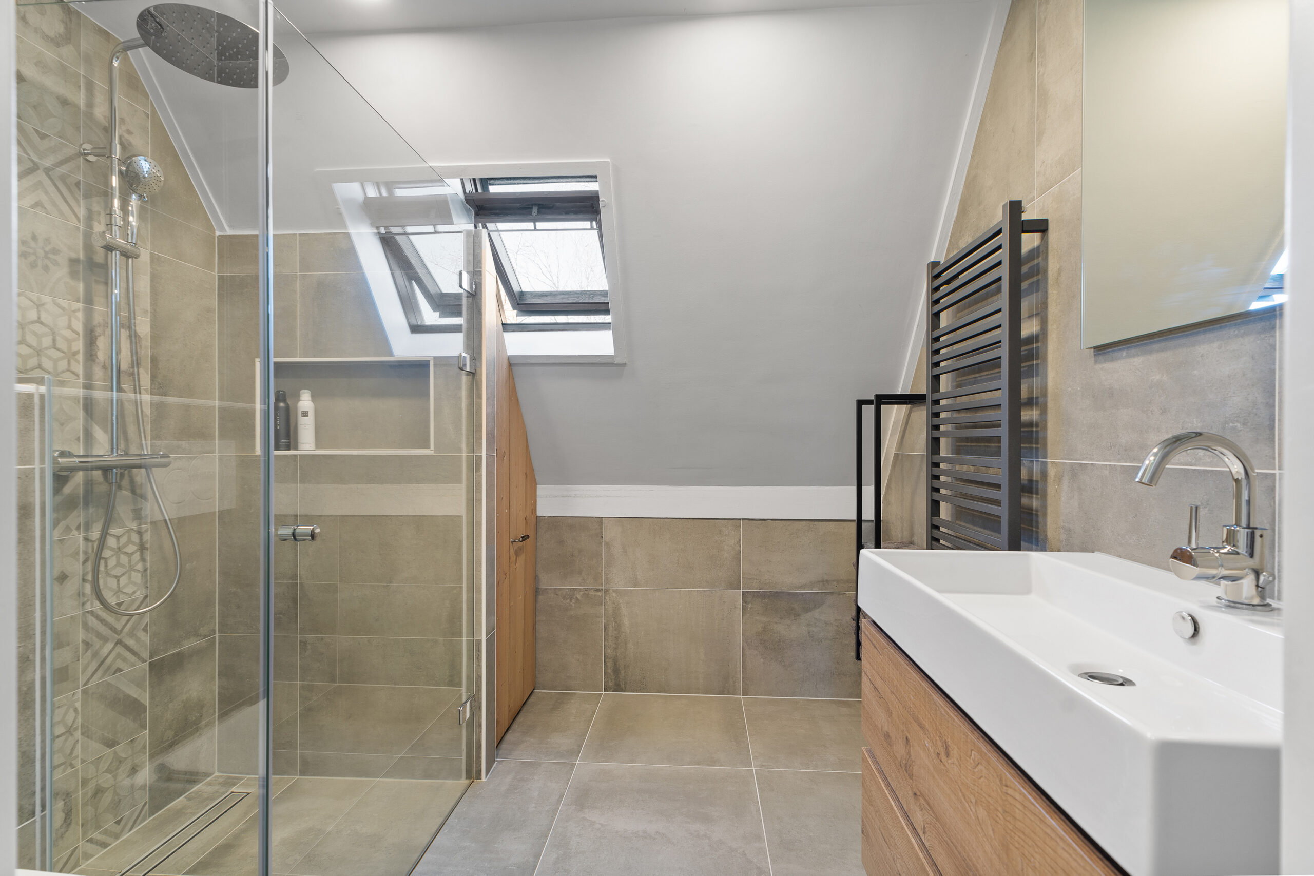 De badkamer heeft een moderne uitstraling en is voorzien van grote grijze tegels en een ruime inloopdouche, die wordt geaccentueerd door een speelse tegelprint en een praktisch nisje voor je doucheproducten. De ruimte beschikt verder over een hangend toilet, wastafel en een designradiator. Het raam zorgt voor extra lichtinval en ventilatie, wat de ruimte nog aangenamer maakt. Slim is ook het gebruik van de schuin aflopende wand, die optimaal is benut met een ruime opbergkast.