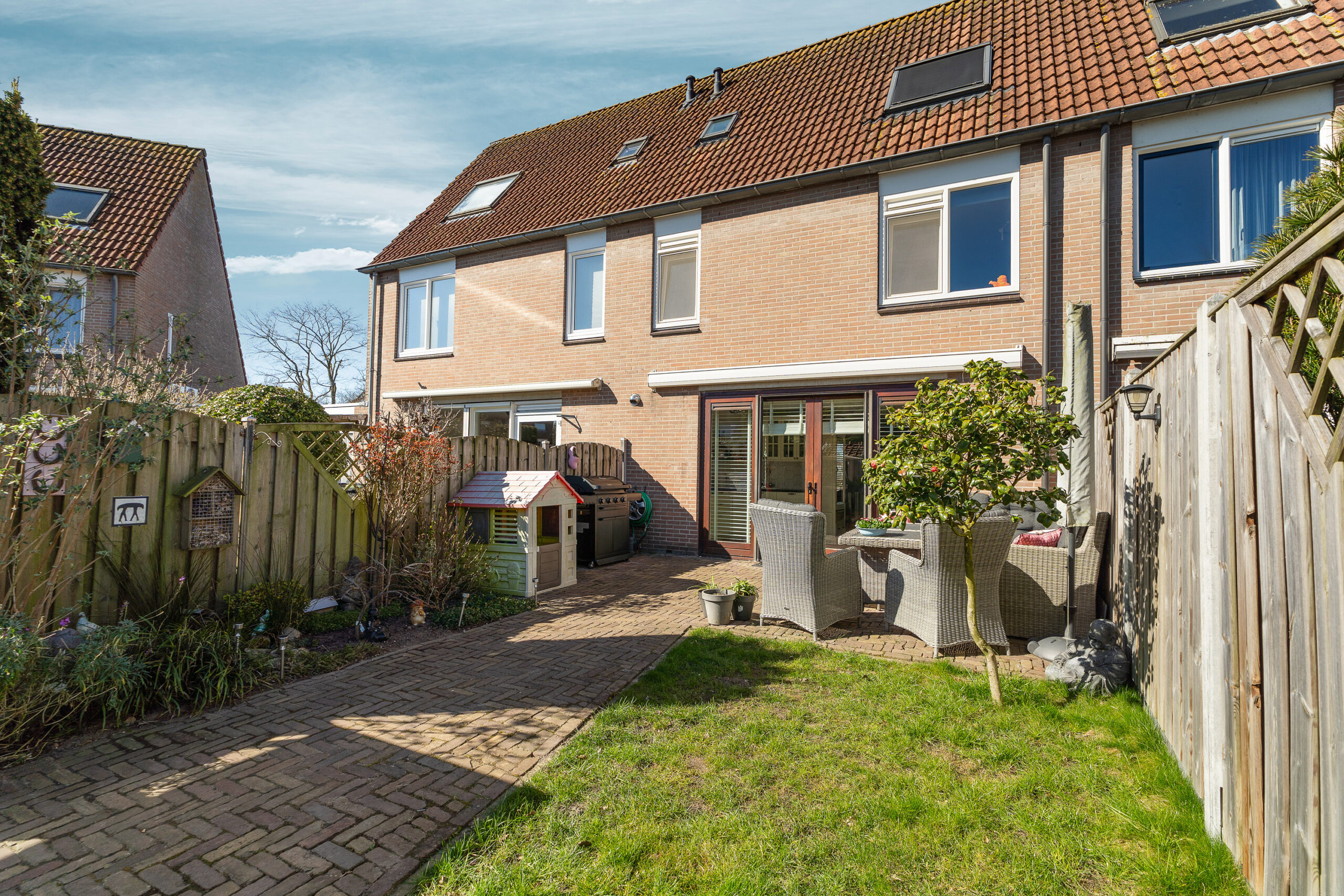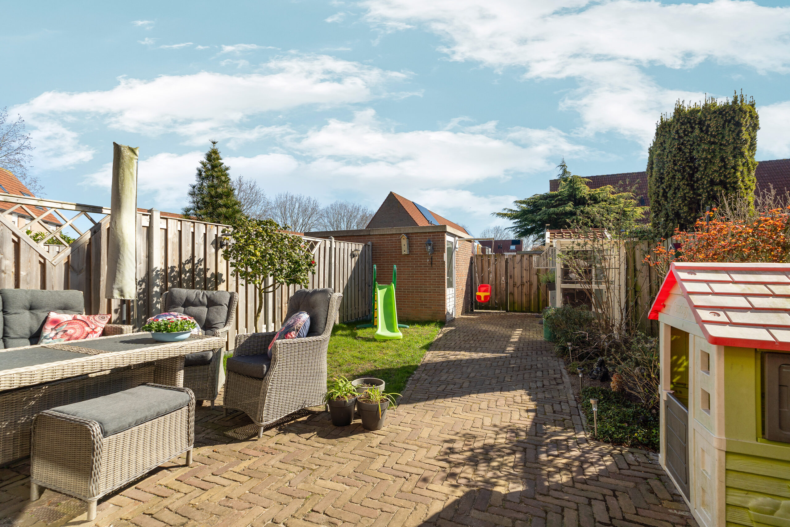 Deze fijne tuin, gelegen op het oosten, biedt veel privacy en weinig inkijk, waardoor je in alle rust kunt genieten van de buitenlucht. De tuin is ideaal voor een gezellig zitje en er is een grasveldje, perfect voor spelende kinderen. Daarnaast beschikt de tuin over een vrijstaande stenen berging van circa 6 m², die voldoende opbergruimte biedt voor tuinaccessoires of fietsen. Via de achterom heb je direct toegang tot een speelveldje, wat het een geweldige plek maakt voor kinderen om veilig te spelen en vrienden te ontmoeten.