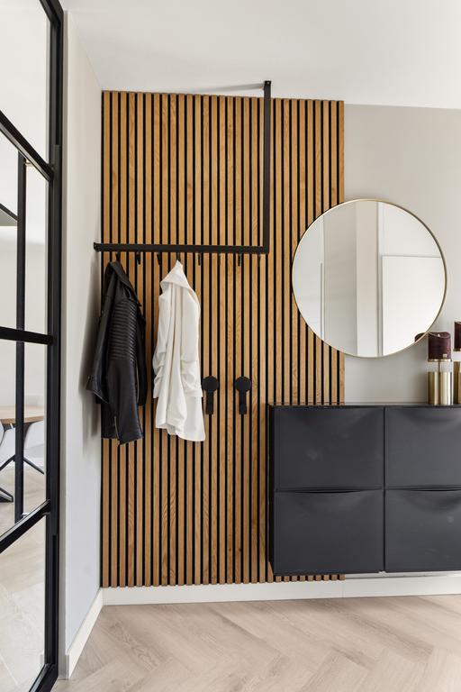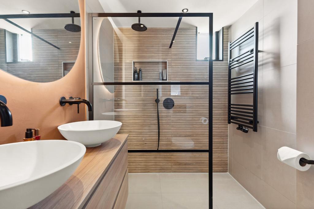 De badkamer (2020) is modern en stijlvol ingericht, met een rustgevende uitstraling dankzij de neutrale betegeling en warme houtlook wandafwerking. De ruime inloop(regen)douche is een echte eyecatcher, afgewerkt met een zwarte stalen douchewand en bijpassende zwarte kranen die zorgen voor een luxe, eigentijdse look. Het strakke wastafelmeubel met twee waskommen biedt volop opbergruimte. Daarnaast beschikt de badkamer over een toilet, een raam voor natuurlijk daglicht en ventilatie, én een zwarte designradiator – ideaal voor warme handdoeken na het douchen.