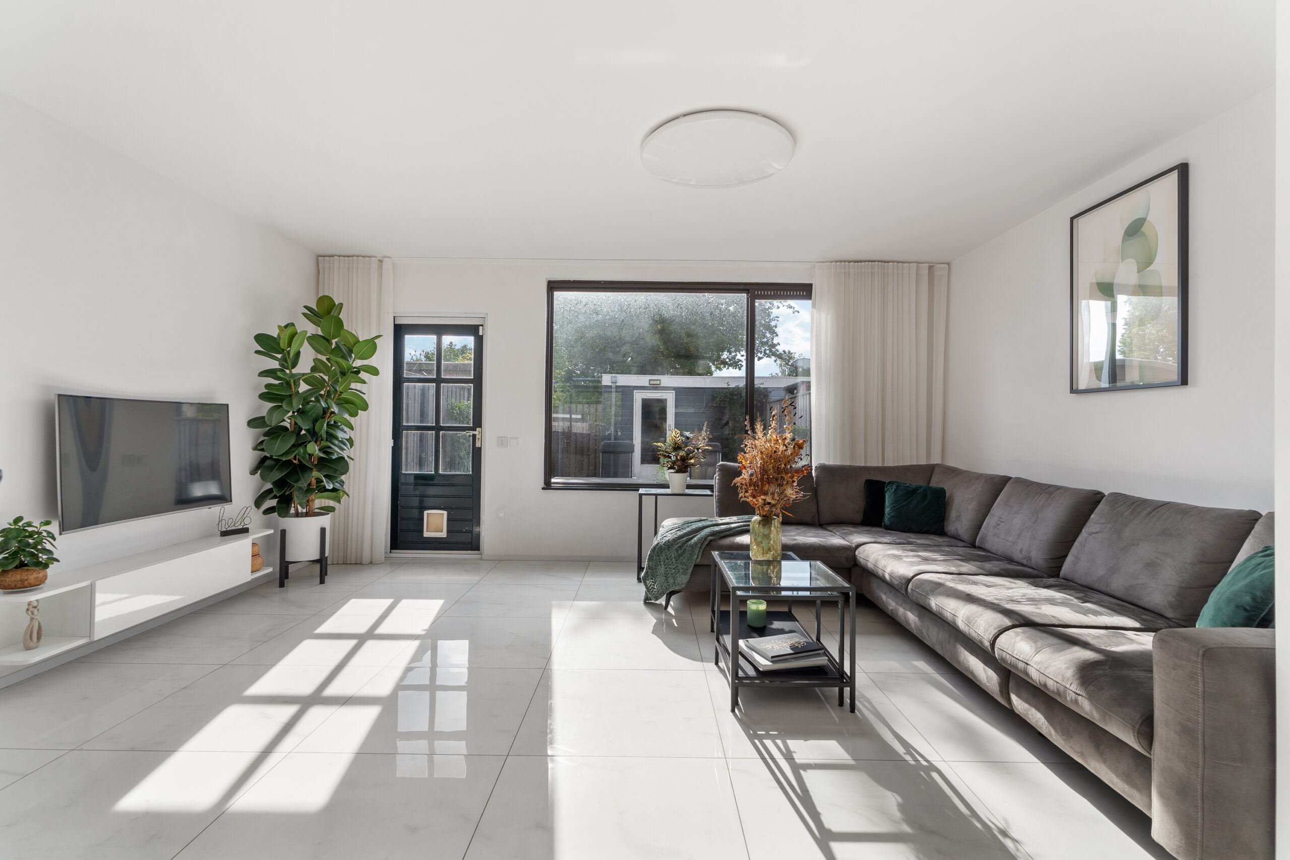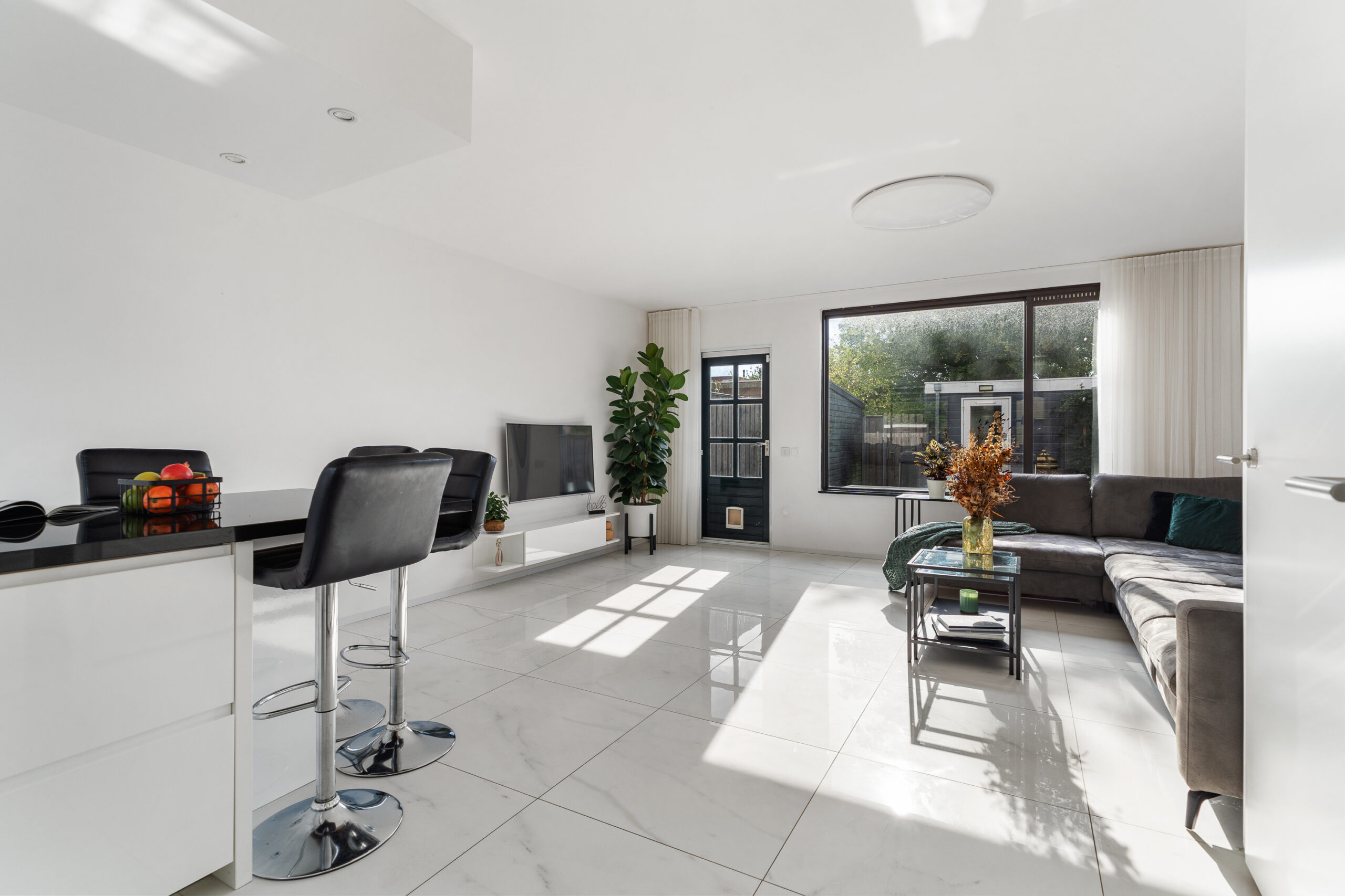 Ramen aan de voor- én achterzijde zorgen voor veel natuurlijk licht. De gehele begane grond is afgewerkt met een lichte plavuizen vloer met vloerverwarming, strak wit gestucte plafonds en wanden. Via een openslaande deur heb je toegang tot de gezellige en verzorgde achtertuin aan het plantsoen. De elektrische zonwering is smart te bedienen.