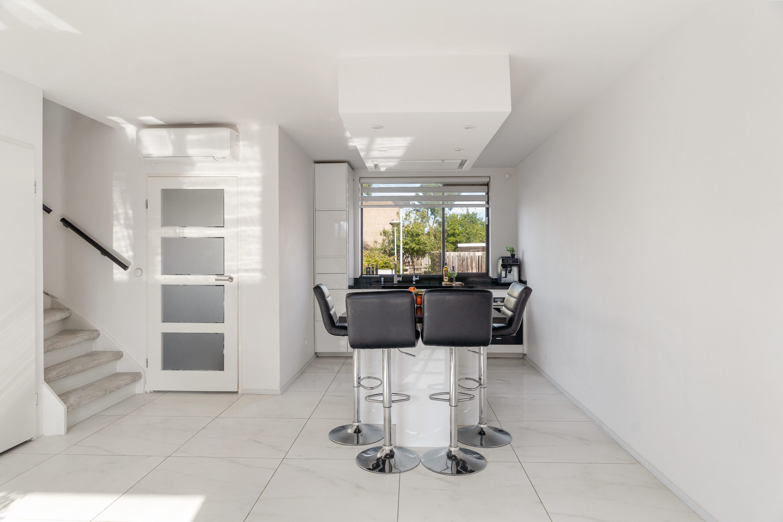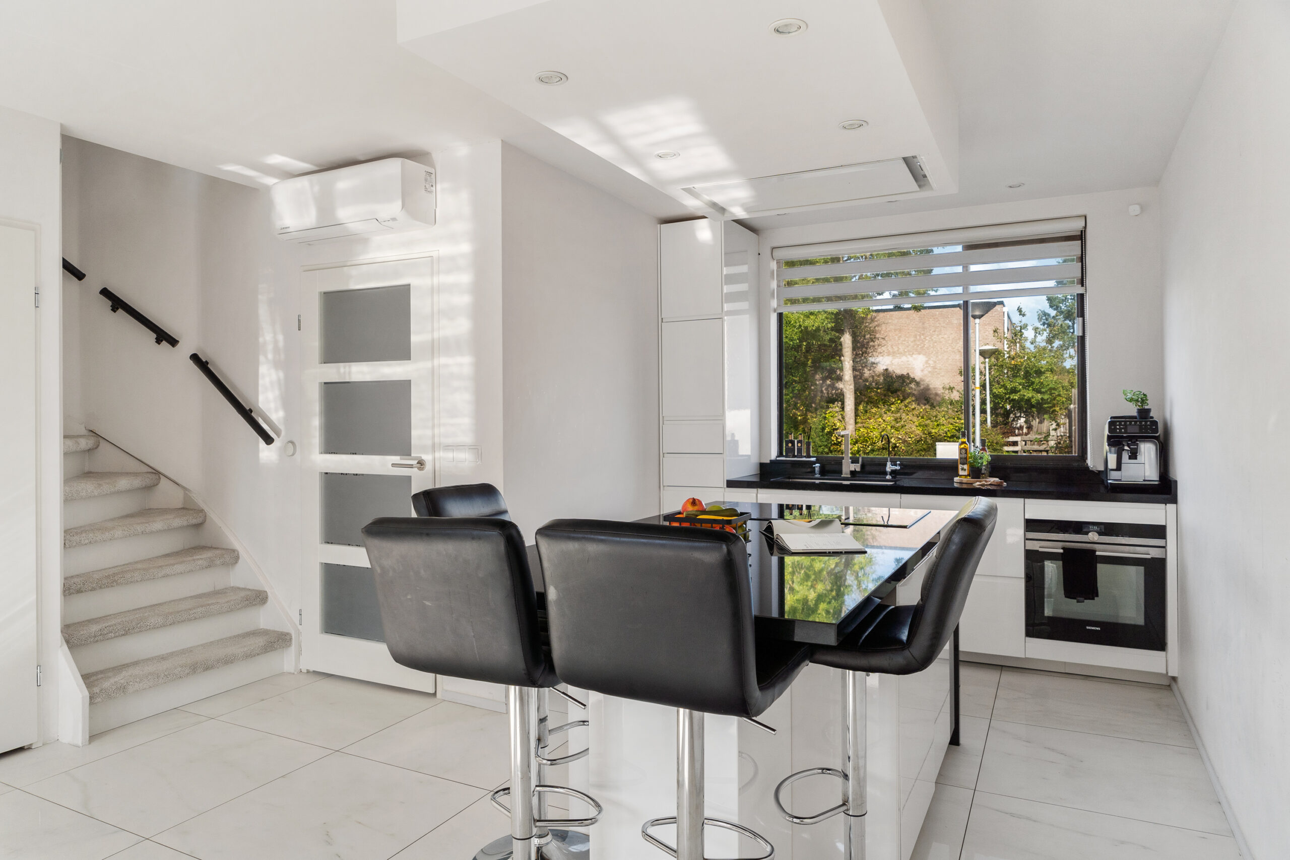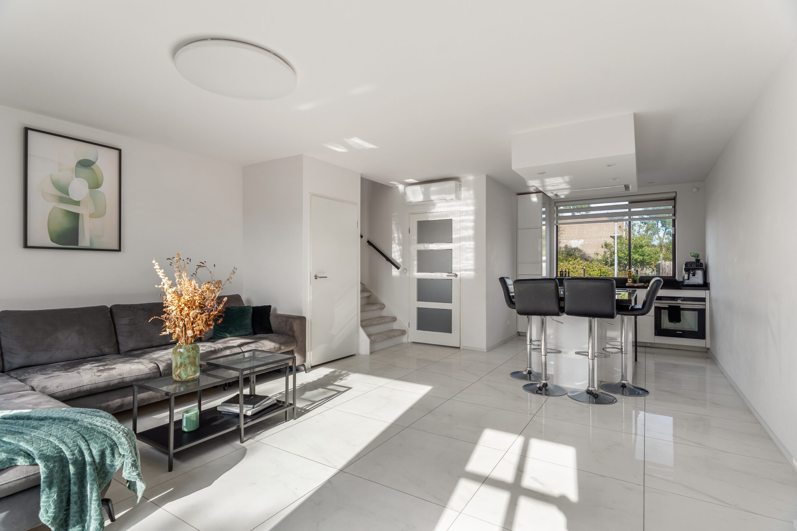 Vanuit de hal stap je de tuingerichte woonkamer binnen. Deze ruime en lichte leefruimte is voorzien van airconditioning en staat in directe verbinding met de open keuken, uitgevoerd met een kookeiland voor een gezellige interactie tussen koken en wonen. Vanuit de woonkamer is de trapopgang naar de verdieping toegankelijk. De trapkast met sensorverlichting biedt bovendien handige extra bergruimte.