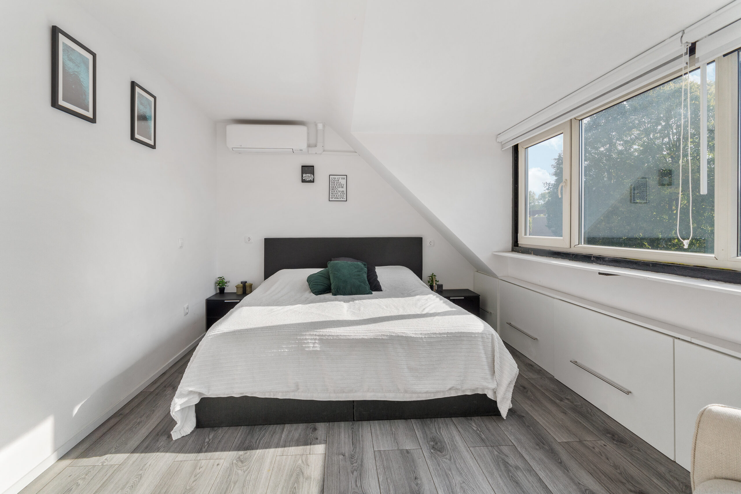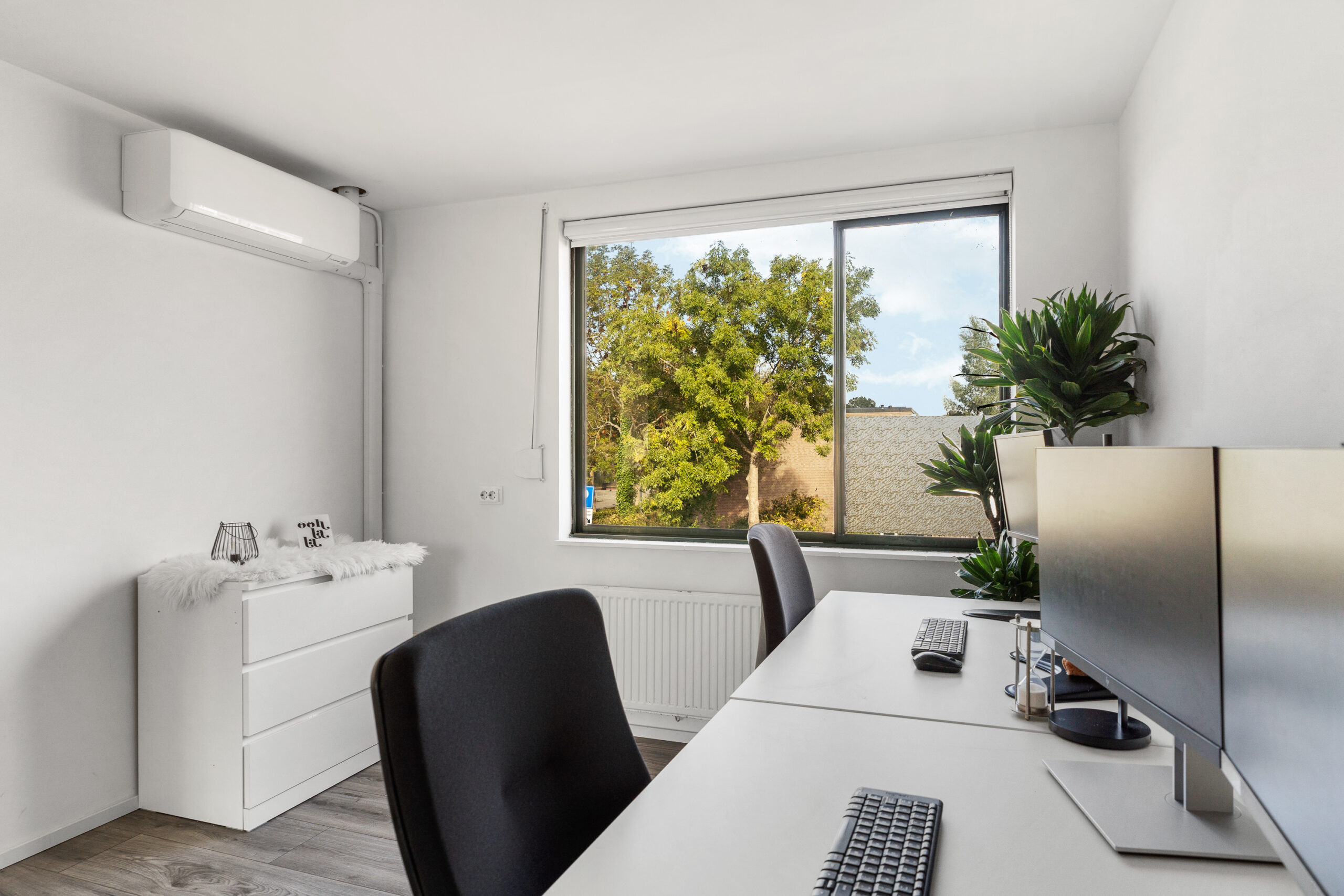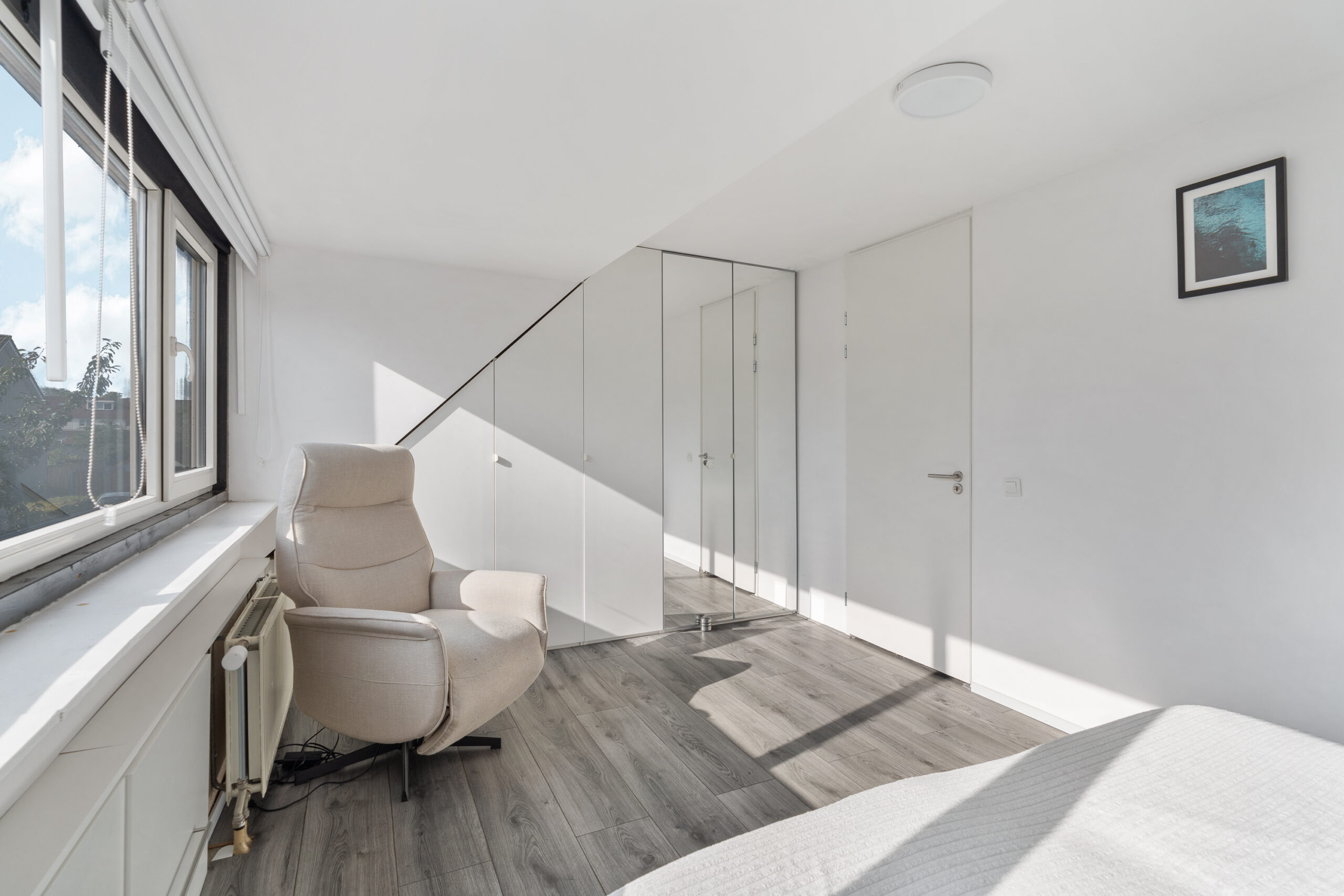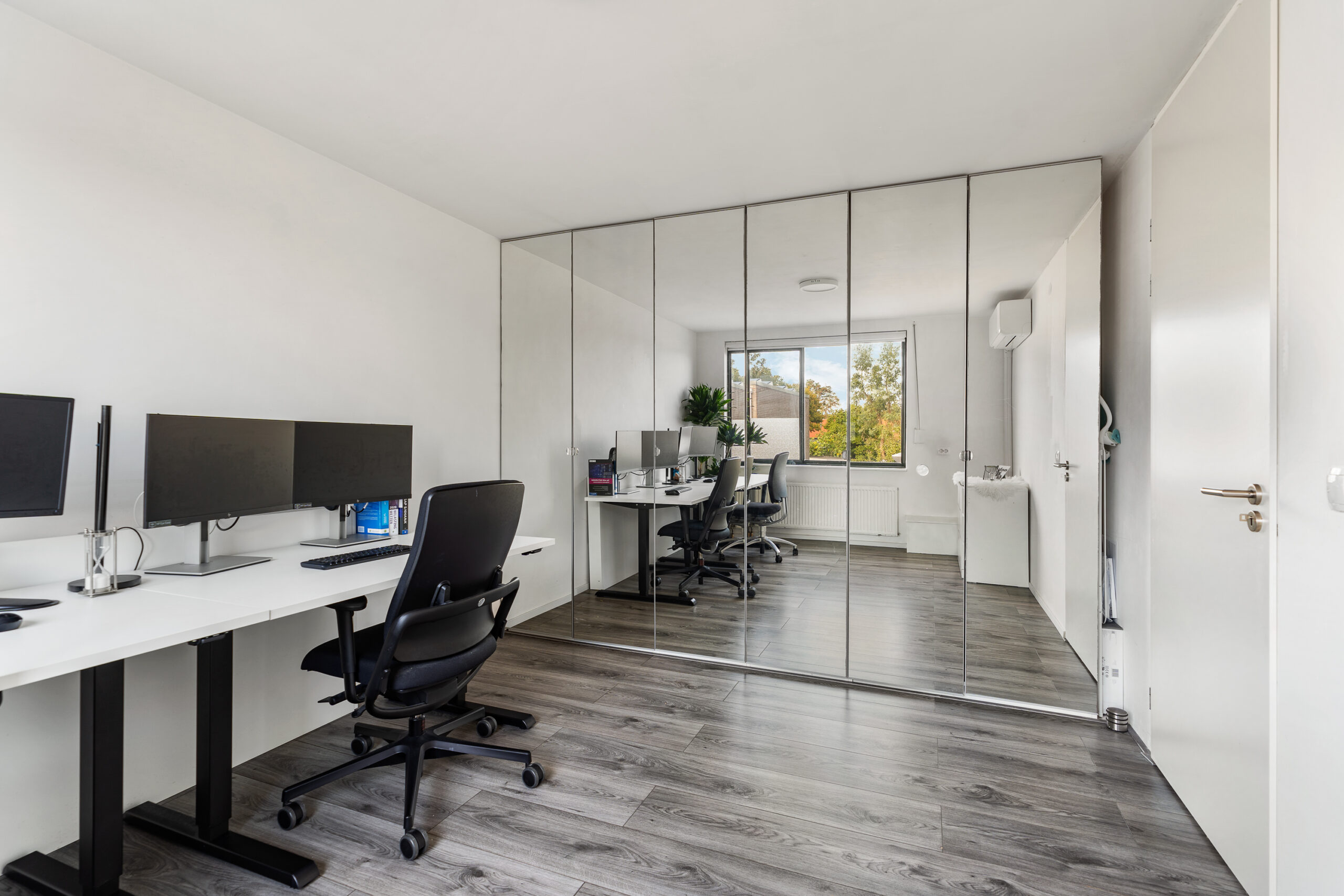 De eerste slaapkamer aan de voorzijde wordt momenteel gebruikt als thuiskantoor en is voorzien van riante inbouwkasten met spiegelafwerking, die een ruimtelijk effect geven aan de kamer. Deze kamer is circa 13 m² groot en uitgerust met moderne airconditioning (koel- en verwarmingsfunctie), wat zorgt voor aangenaam comfort in elk seizoen.