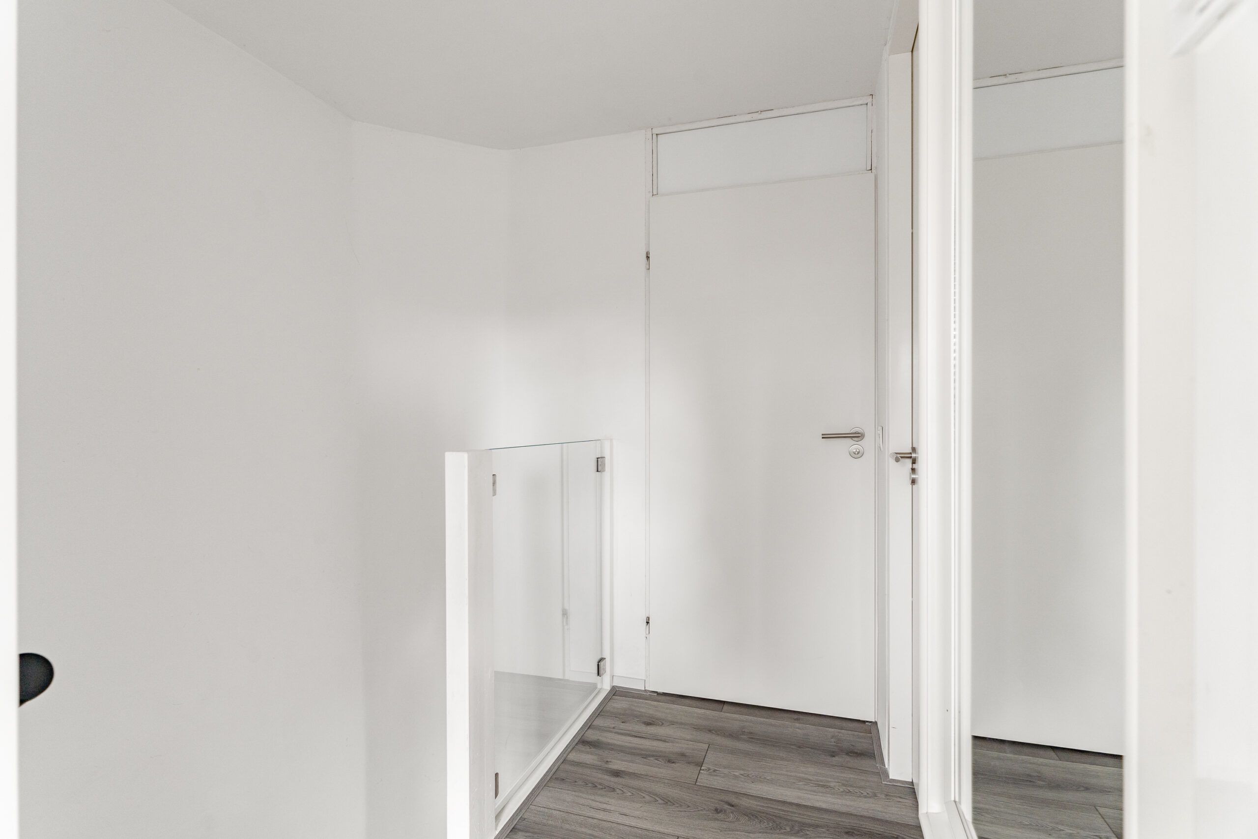 Een glazen trapafscheiding, een nette doorlopende laminaatvloer en strak gestucte wanden en plafonds geven zowel de hal als de slaapkamers een frisse en moderne uitstraling.