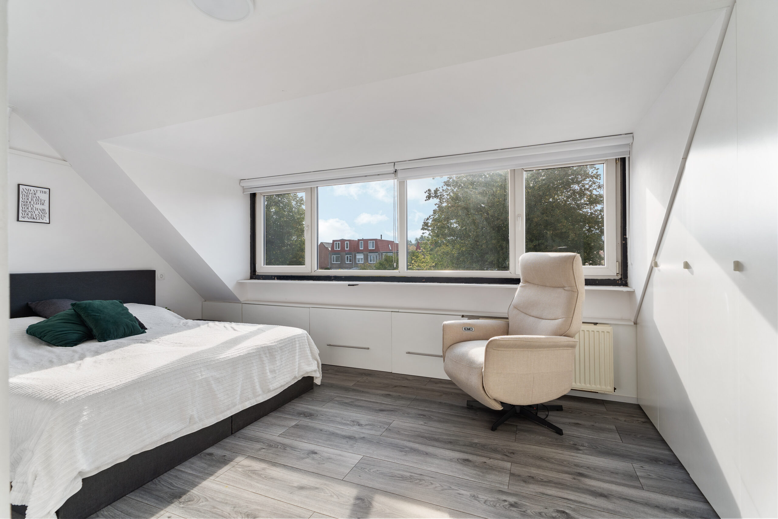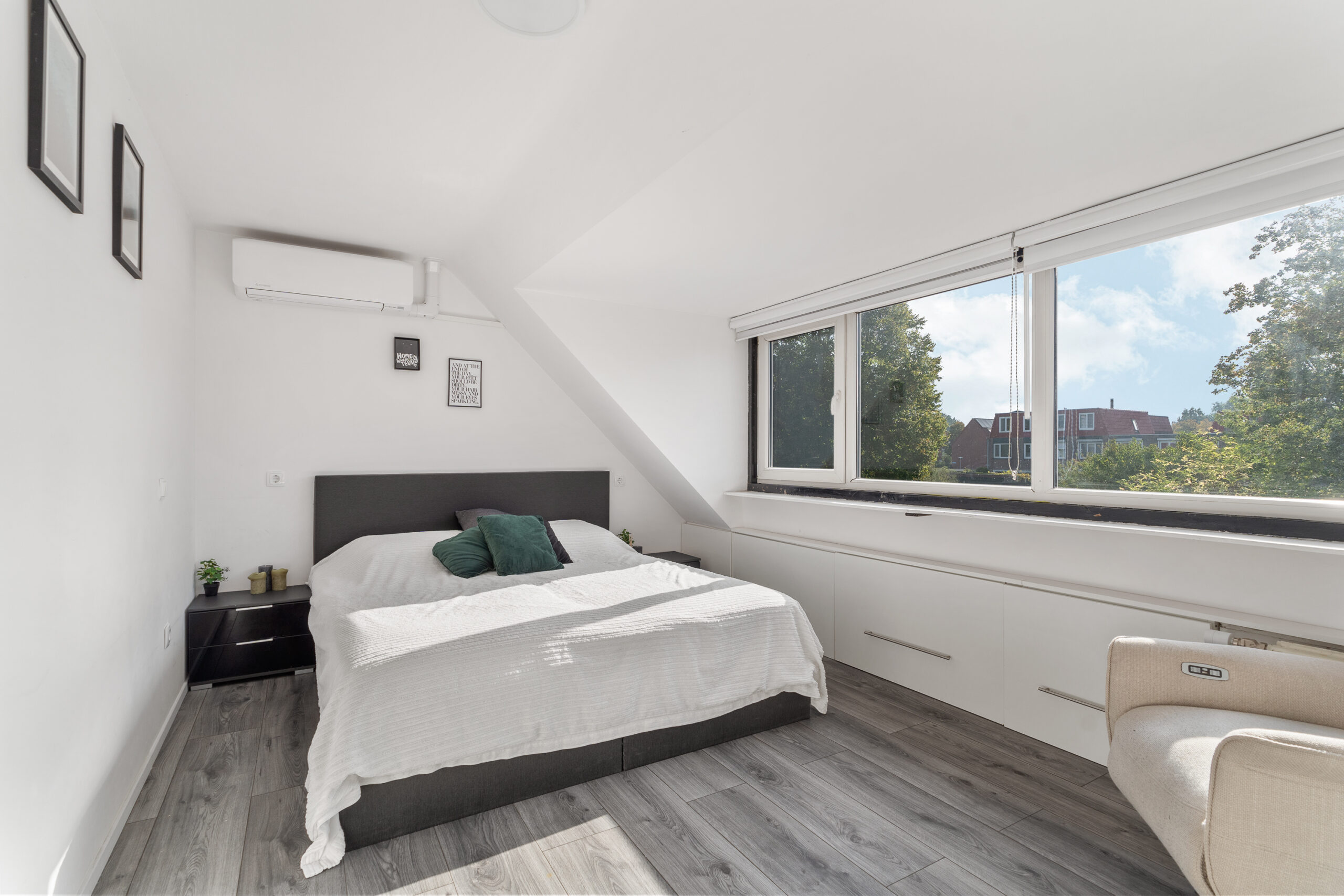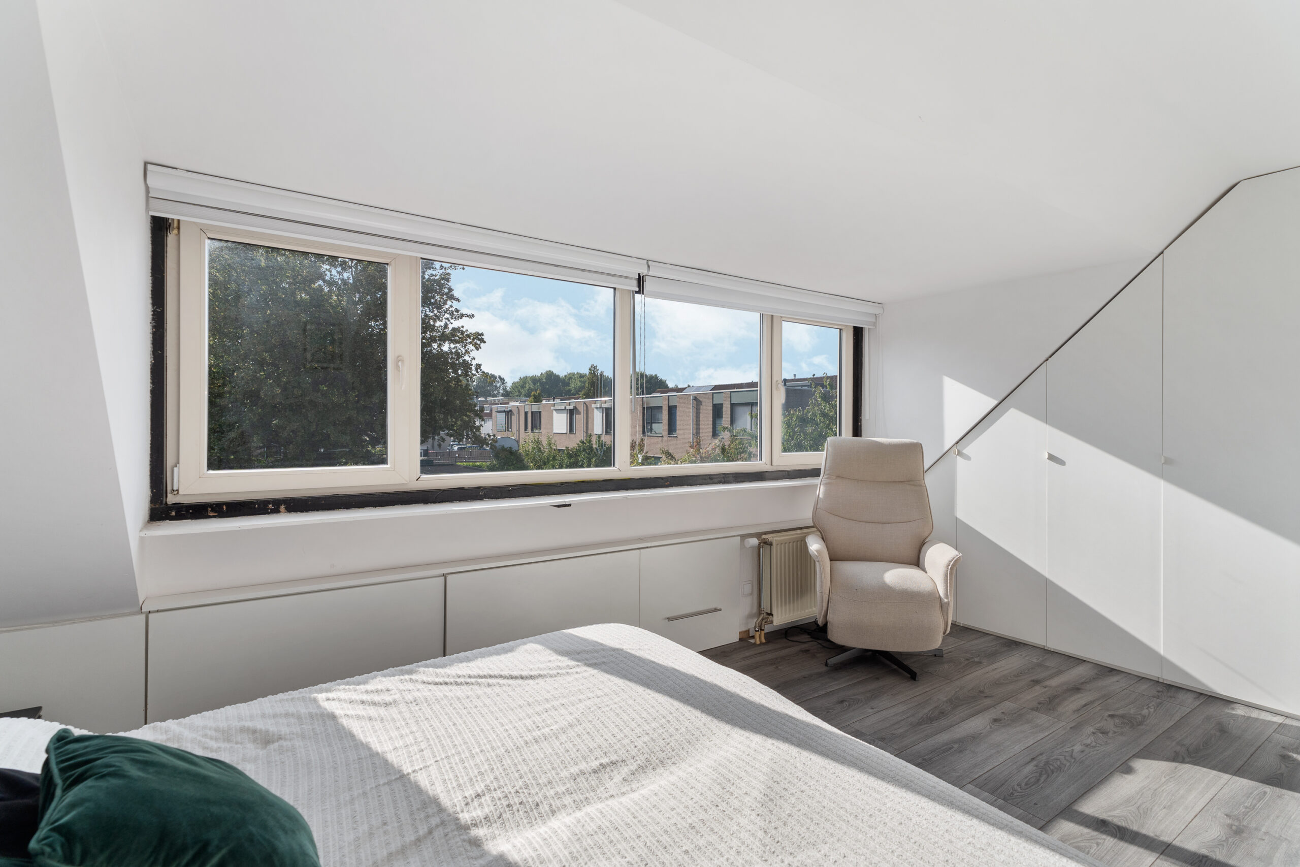 Net als de begane grond is ook deze verdieping elektrisch te verwarmen – een mooie combinatie met de zonnepanelen. Grote kostenposten hoef je hier niet snel te verwachten; zowel de hemelwaterafvoer als de volledige dakbedekking van het platte dak (ook bij de dakkapel) zijn in 2022 vervangen.
