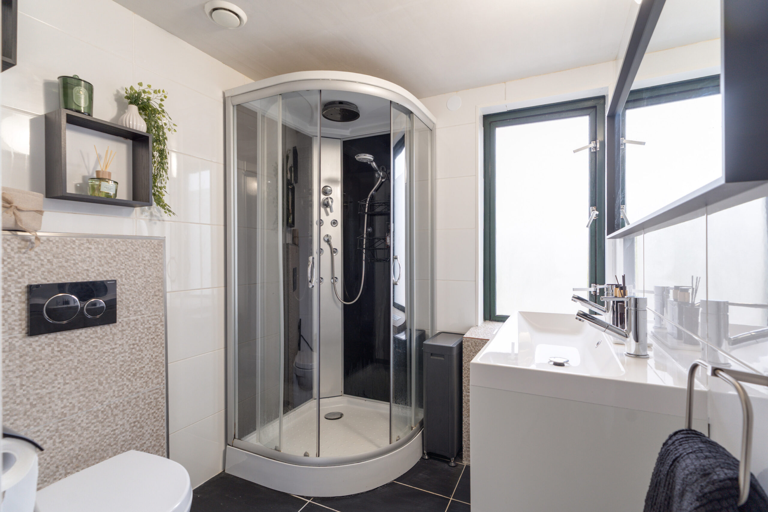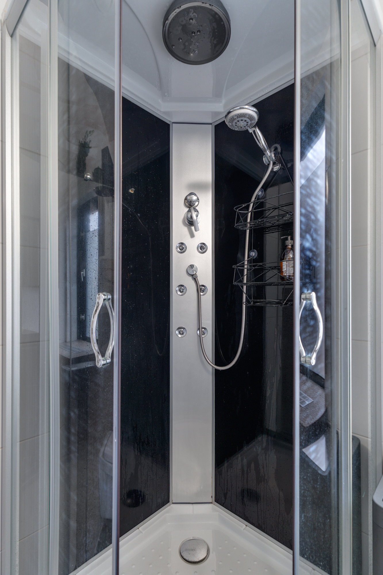 • een douchecabine met massagestralen en regendouche