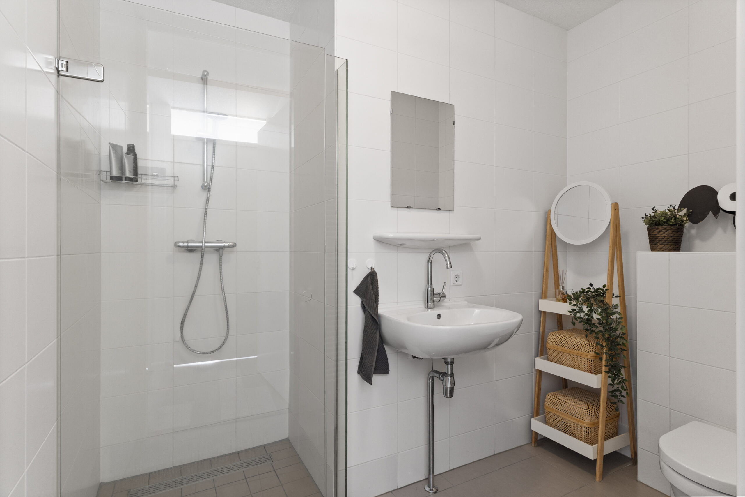 De badkamer is compleet ingericht met alles wat je nodig hebt. Er is een strakke, moderne witte tegel doorgevoerd door de gehele badkamer. Op de vloer licht een natuurkleurige tegel. Dit zorgt beide voor een rustige ruimte. De inloopdouche met glazen deur zorgt voor een ruimtelijk gevoel en geeft de ruimte een moderne uitstraling. Verder vind je hier een net toilet en een wastafel. Er is bovendien nog plek voor een badkamerkast, zodat je eenvoudig extra opbergruimte kunt creëren.
